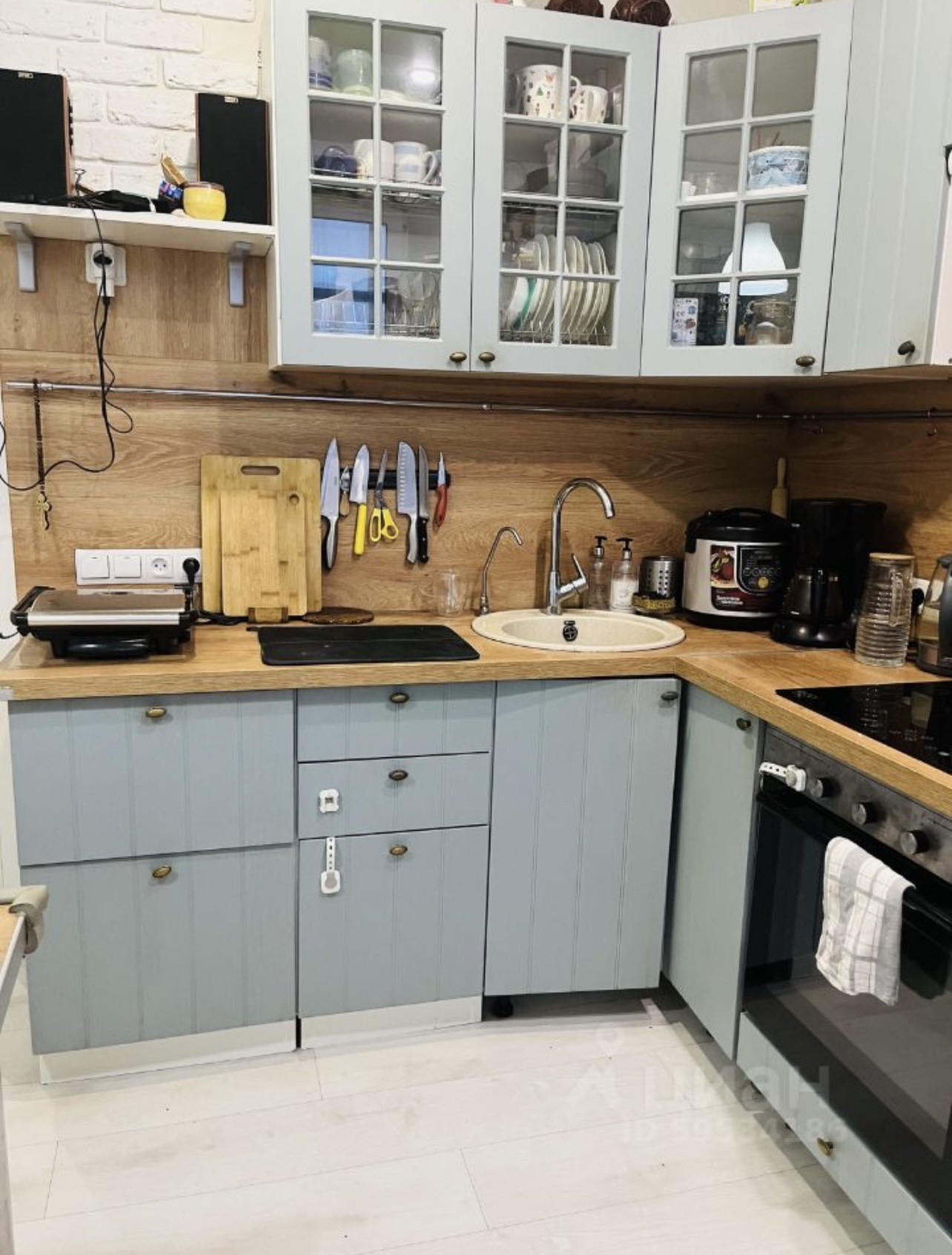 В квартире остается кухонный гарнитур, часть мебели, плита, вытяжка, текстиль, кондиционер.