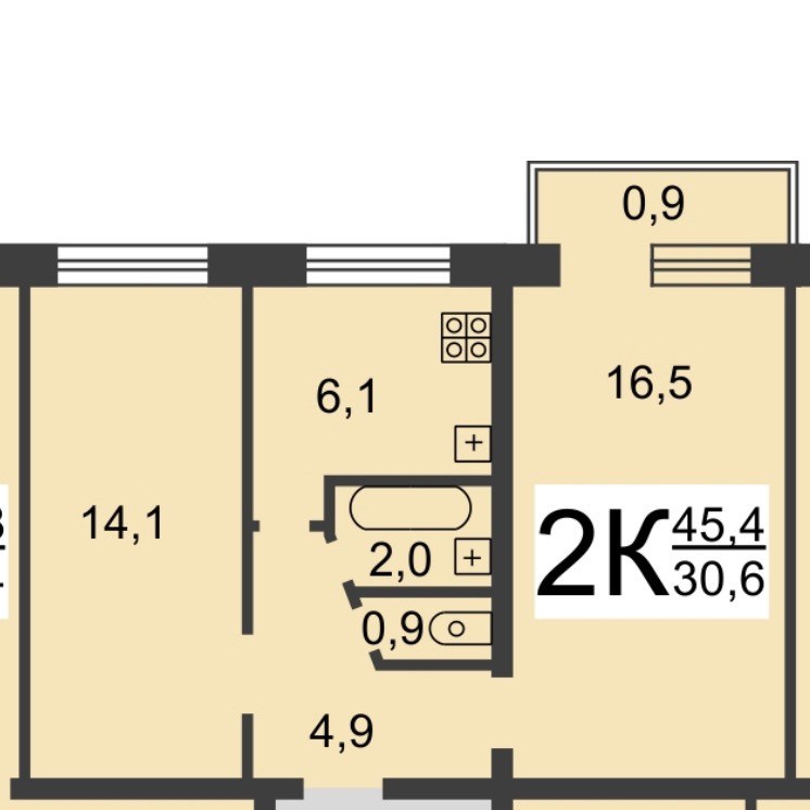 Жилая площадь 30.6 м2