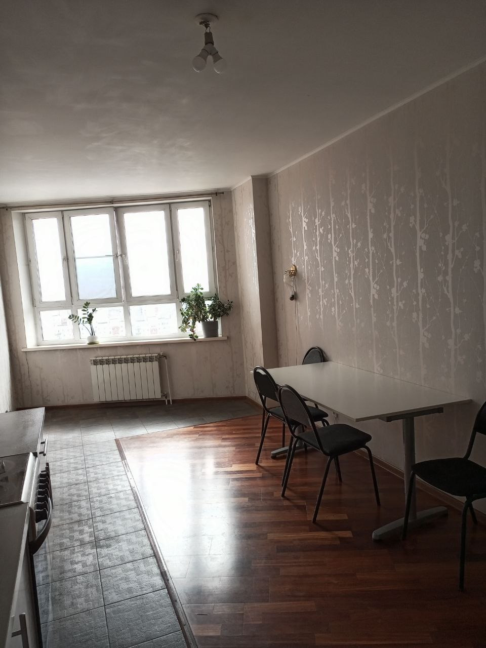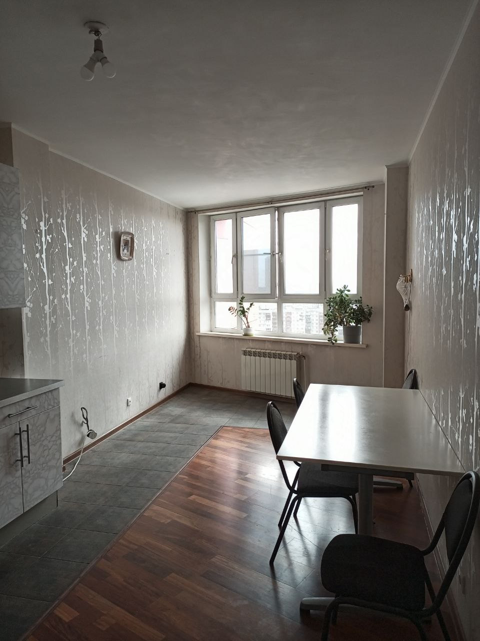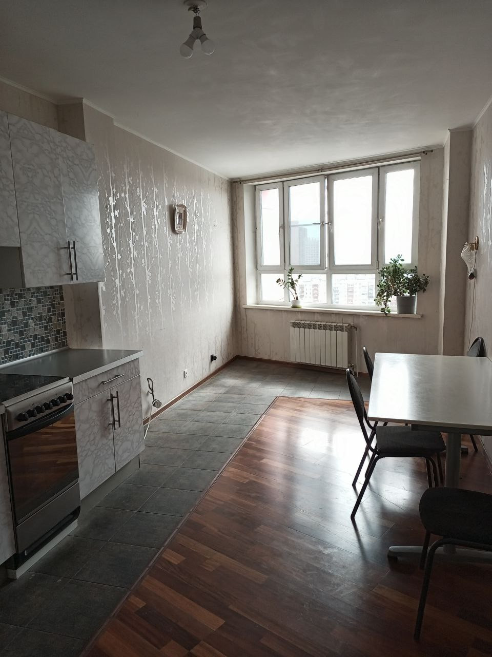 На полу керамогранит и паркет.