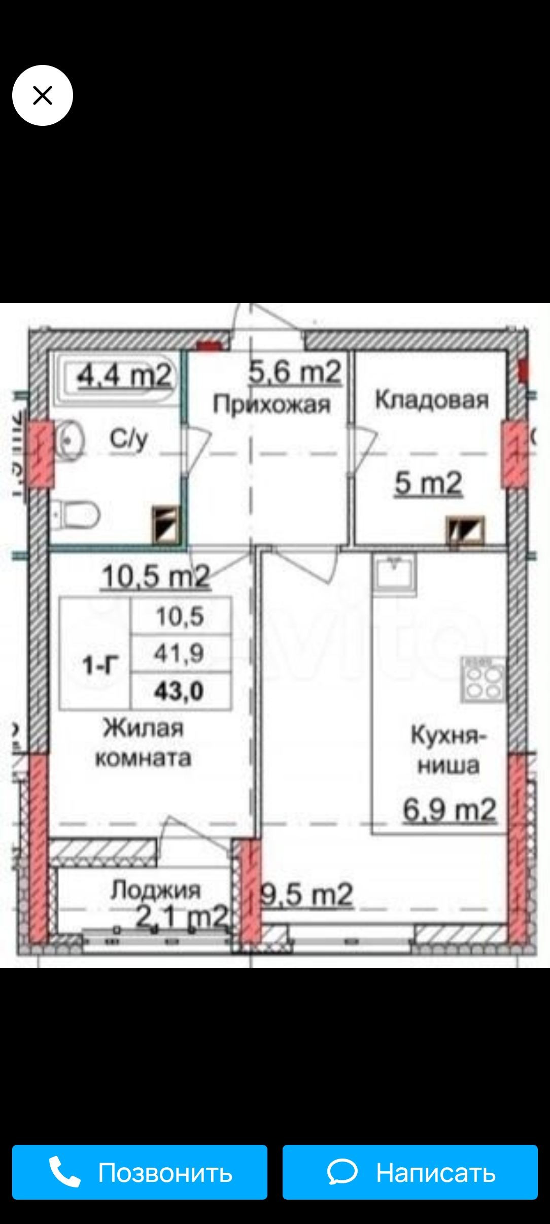 Общая площадь 42.6 м2