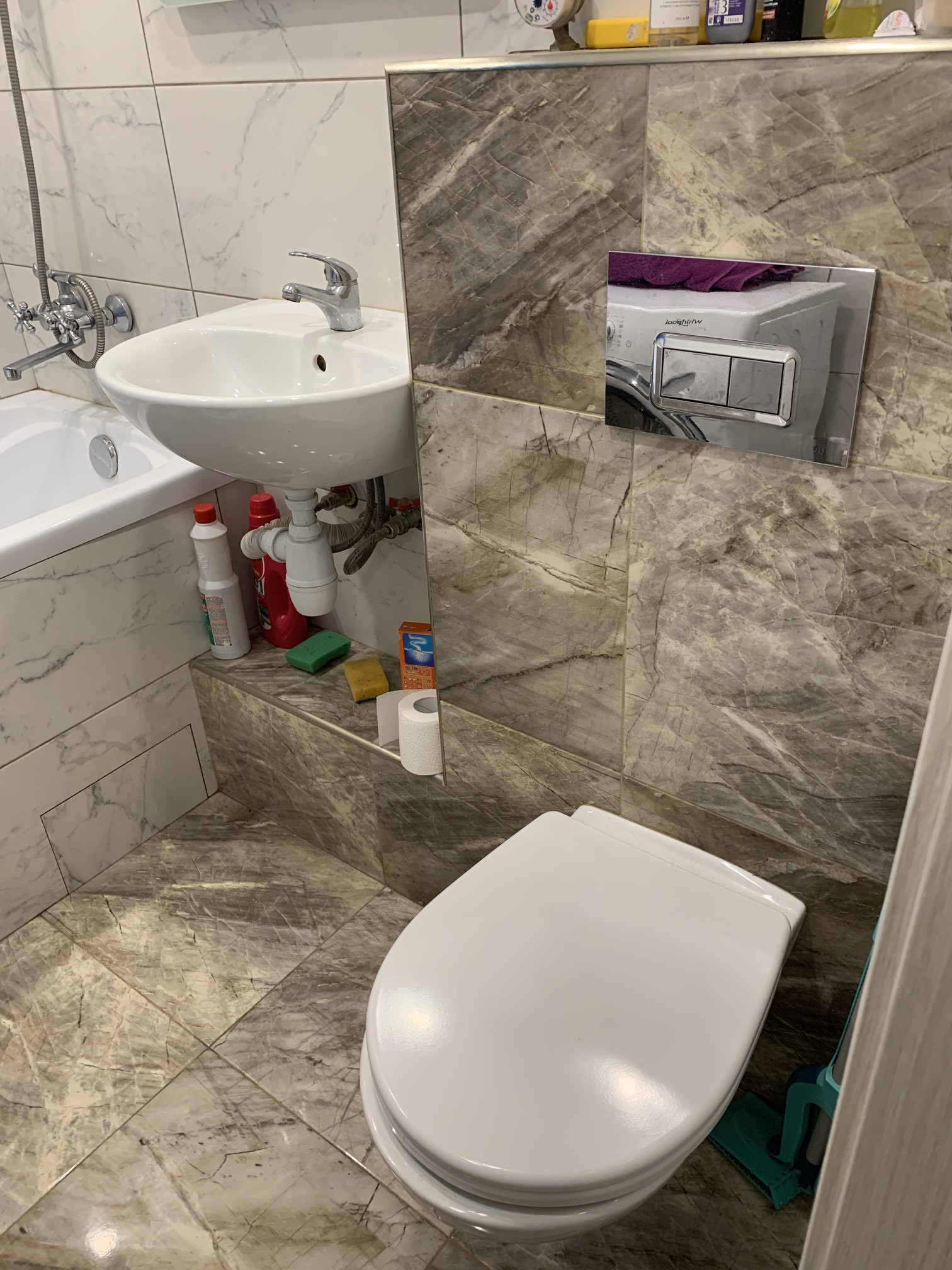 Санузел совмещенный, просторный, легко встает любая стиральная машина, отделан современной плиткой , установлена хорошая сантехника.