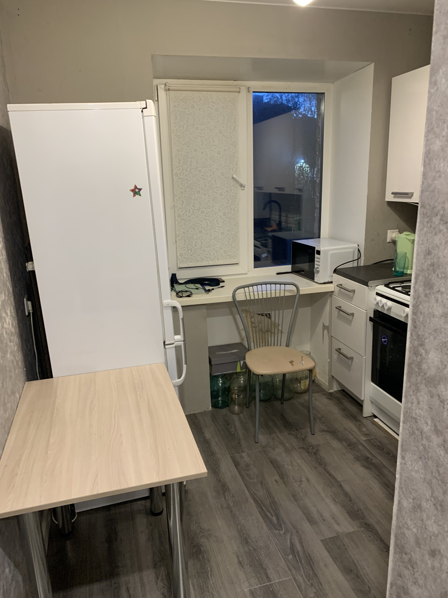 В квартире остается новые кухонный гарнитур и плита.