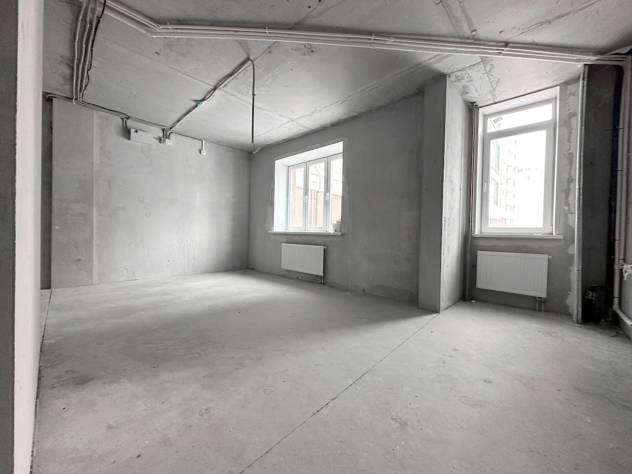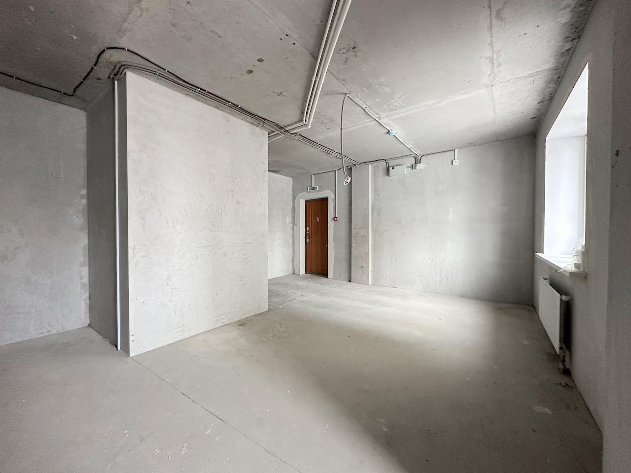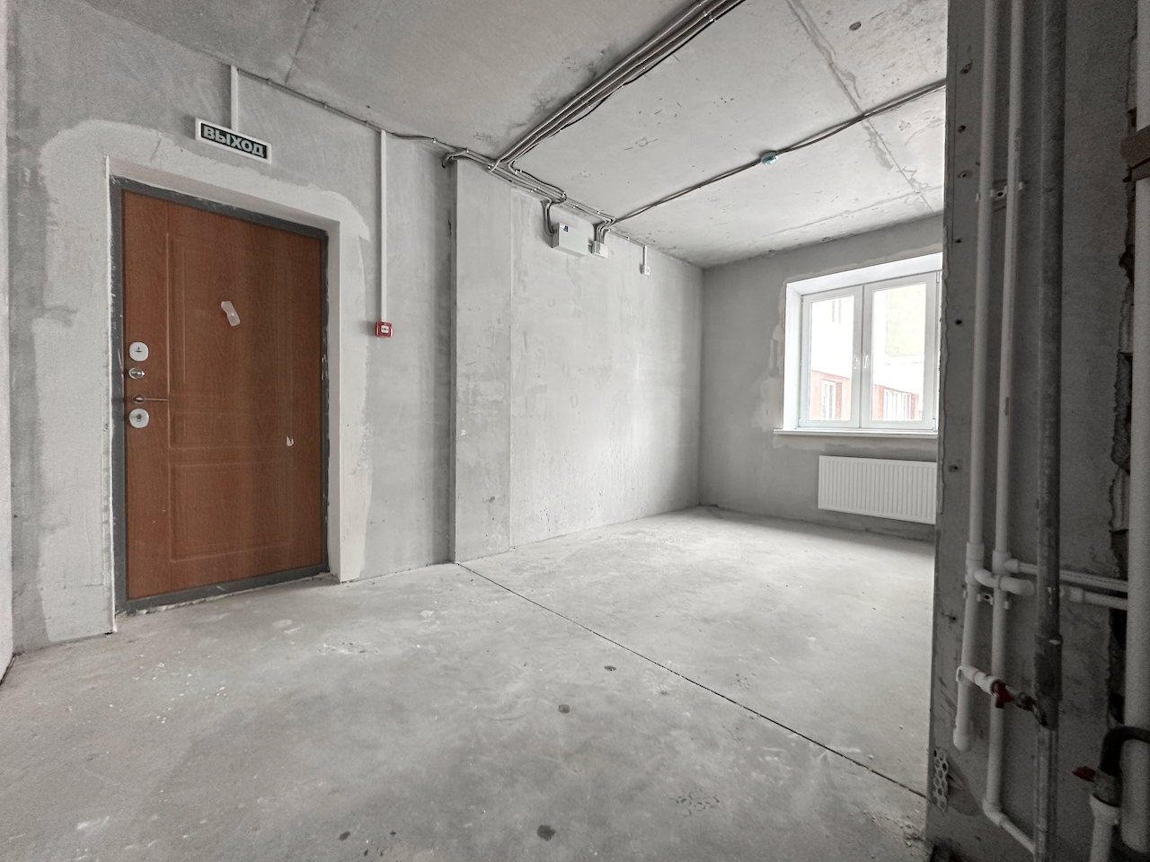 "Под отделку", установлены стеклопакеты, стальная антивзломная дверь с замками сейфового типа, отопление, электричество, пожарная сигнализация, чистовой пол - бетонная стежка, все окна во двор.