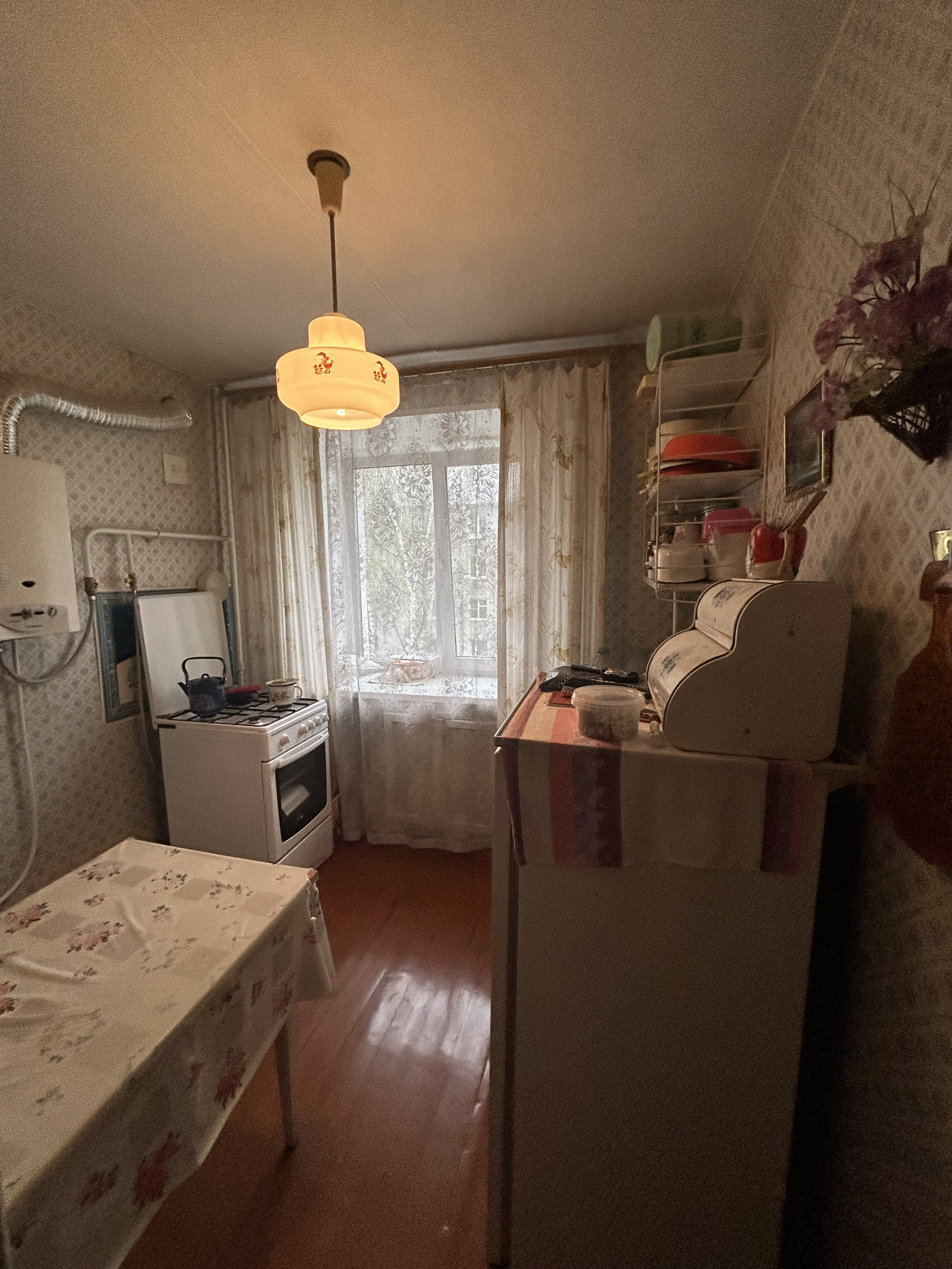 Общая площадь квартиры 31,4 кв.м., кухня 5 кв.м. Квартира в обычном состоянии, без  ремонта, балкон застеклен. В подъезде сделан ремонт, заменены окна.