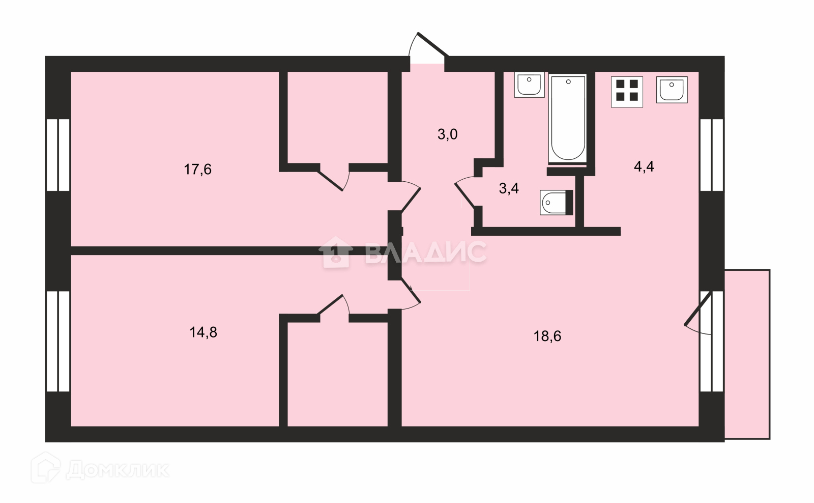 Две изолированные комнаты, кухня- гостинная. Окна на разные стороны.