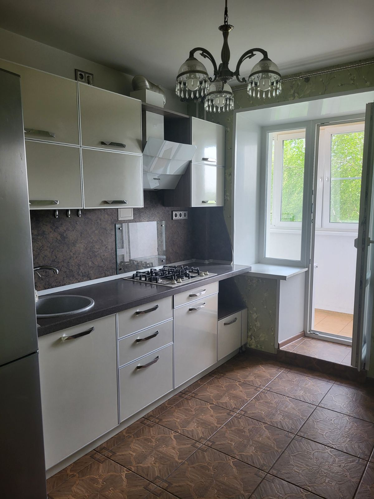 Квартира укомплектована встроенным кухонным гарнитуром, изготовлен на заказ. Пластиковые неубиваемые фасады в алюминиевом профиле. Газовая поверхность Gorenje с функцией газ-контроль и электророзжиг. Наклонная вытяжка KRONA. Холодильник Bosch.