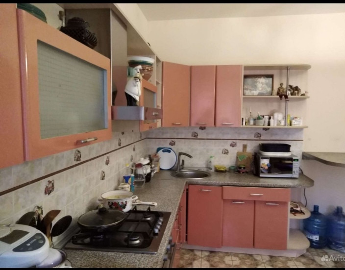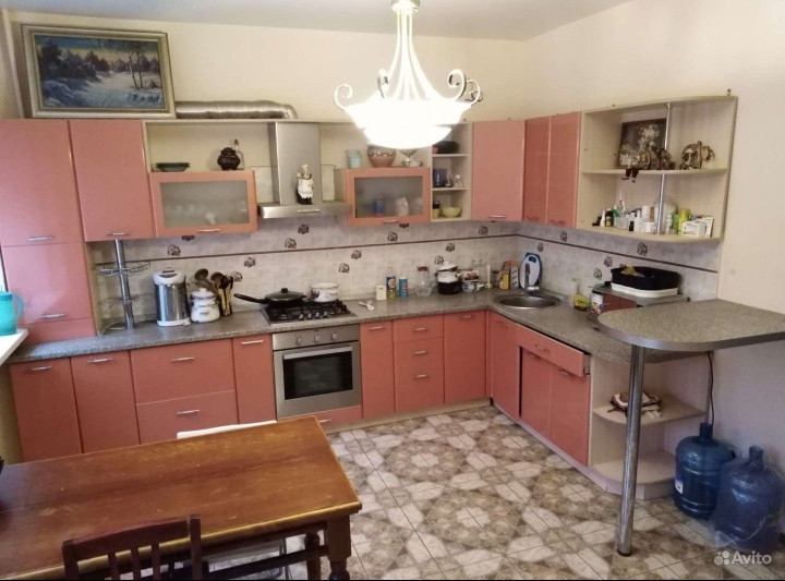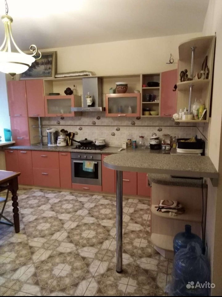 Потолки натяжные и подвесные. На полу - ламинат и плитка. Кухонный гарнитур остается покупателю в подарок.