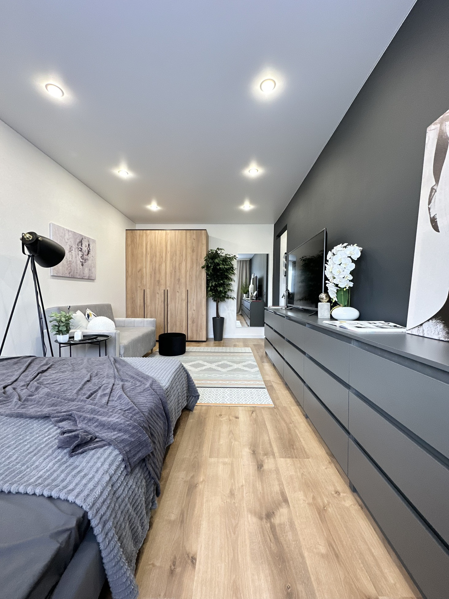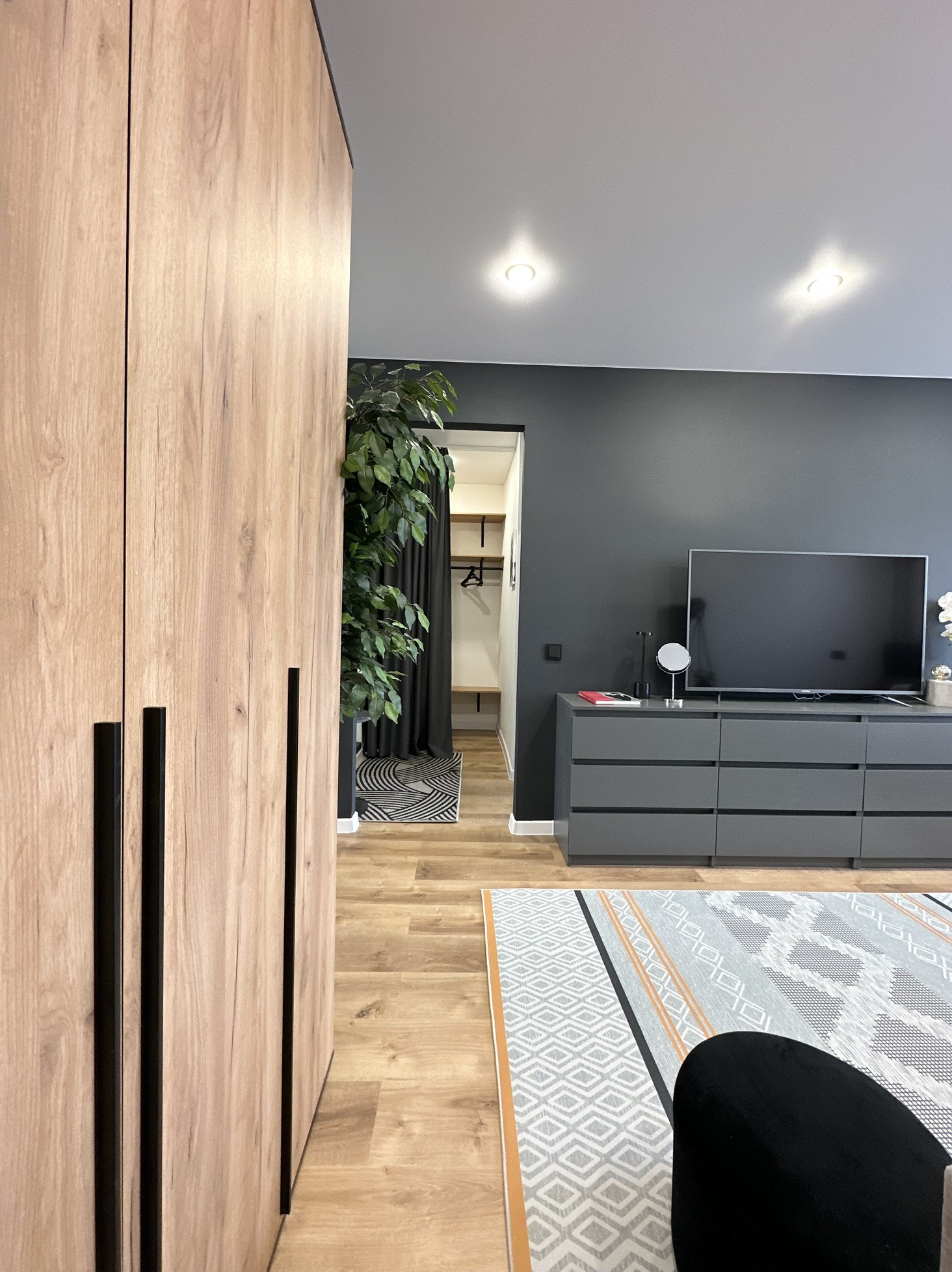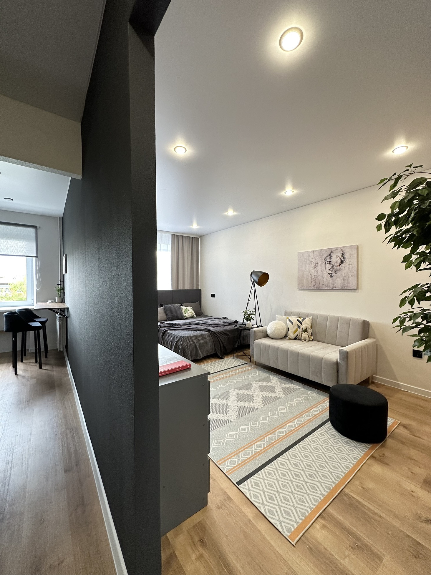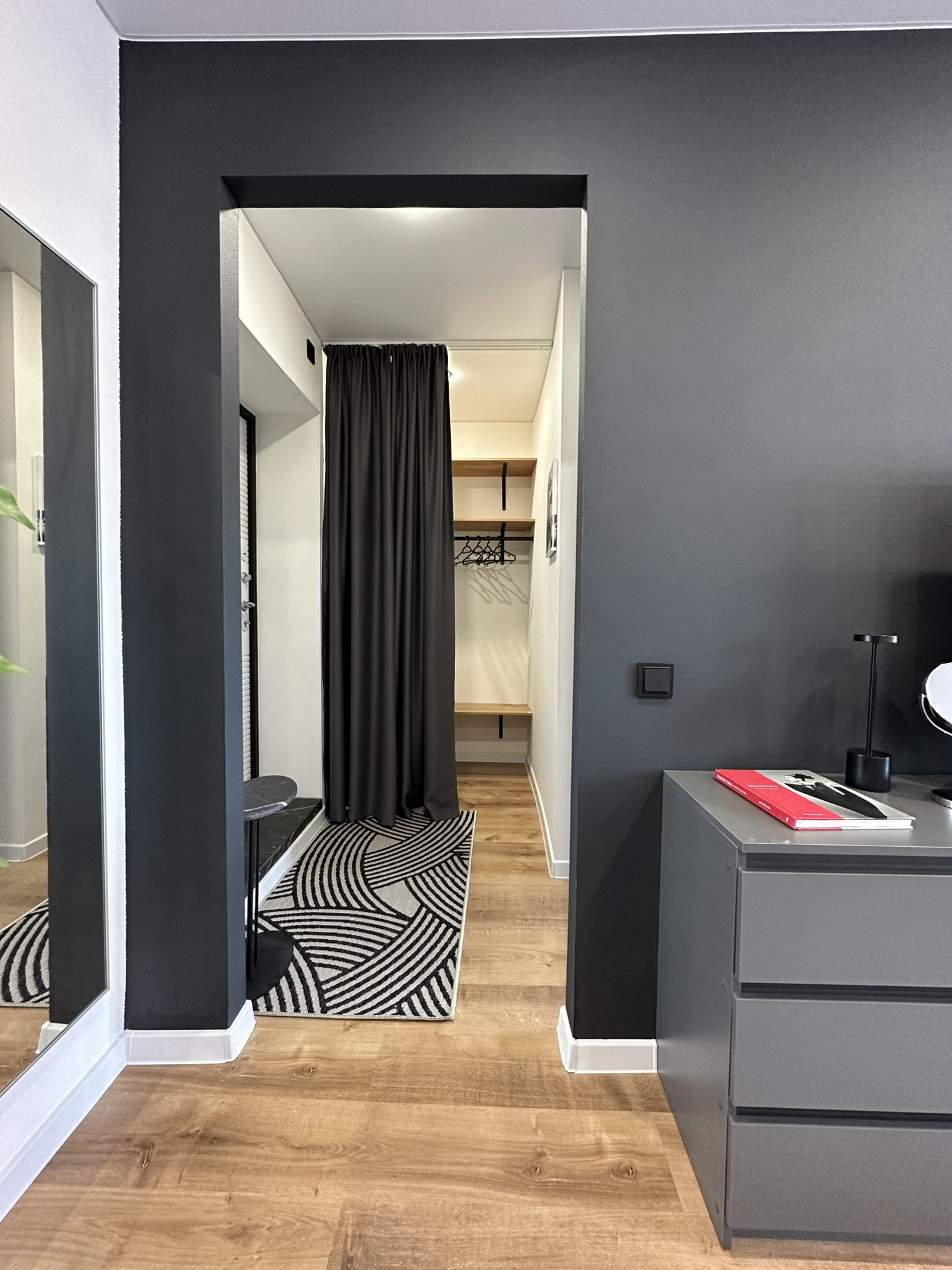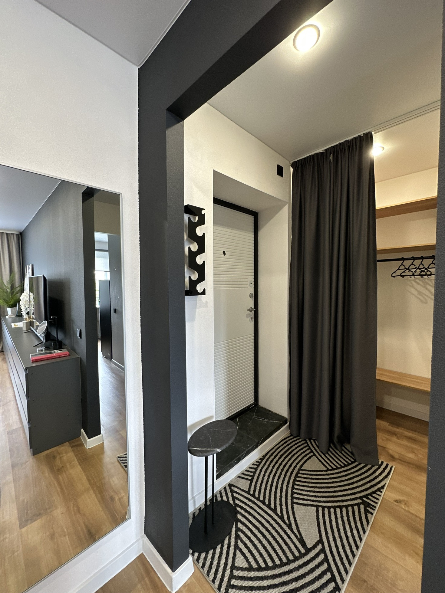 В квартире остается: кухонный гарнитур, шкаф для одежды, двуспальная кровать, матрас, барная стойка, 2 барных стула, диван, телевизор, занавески, холодильник, стиральная машина, электрический чайник, микроволновка, духовая печь, варочная панель, настенное зеркало в комнате, комоды, зеркало в ванной, полки в ванной, картины, вся сантехника и потолочное освещение.