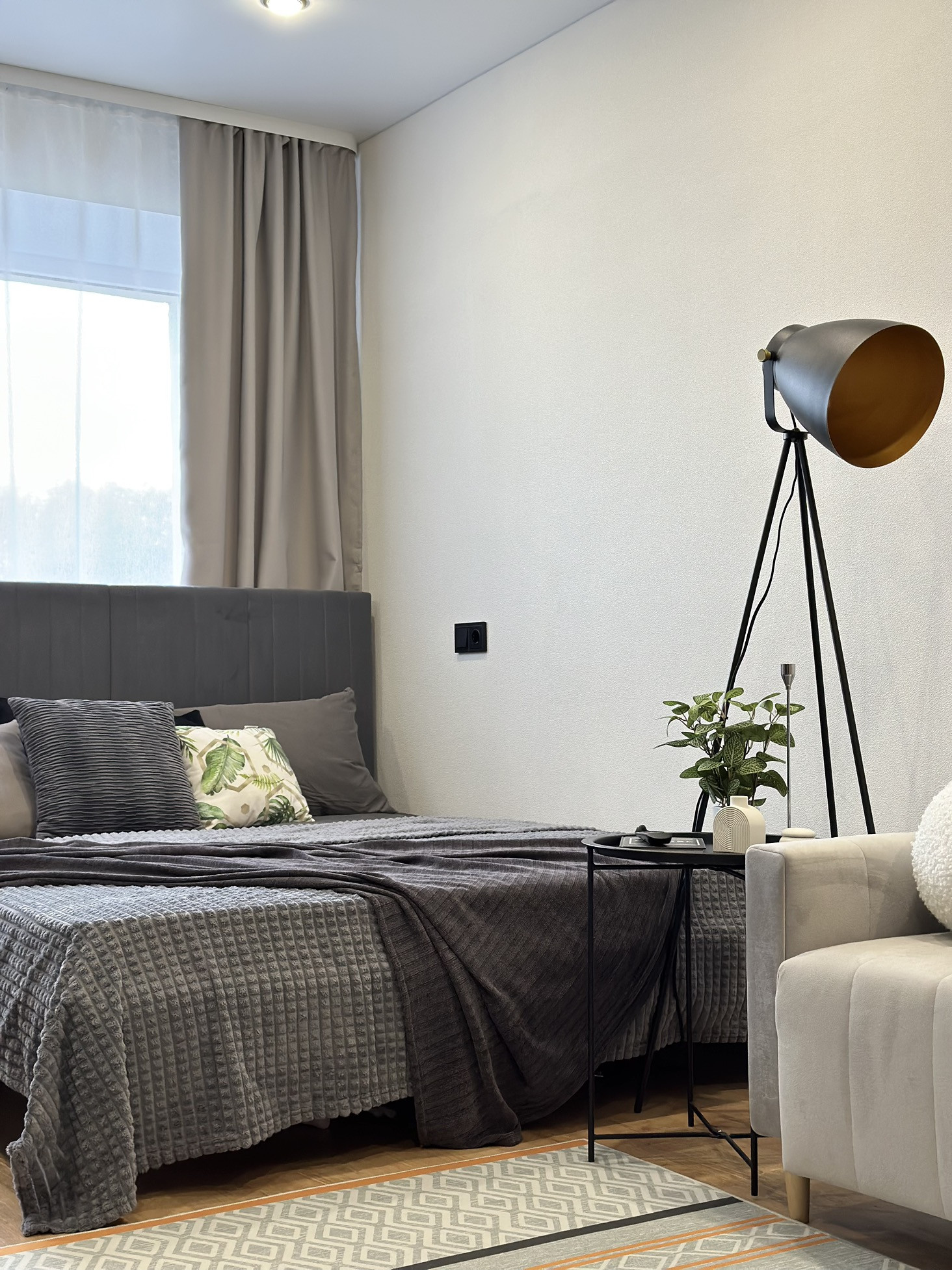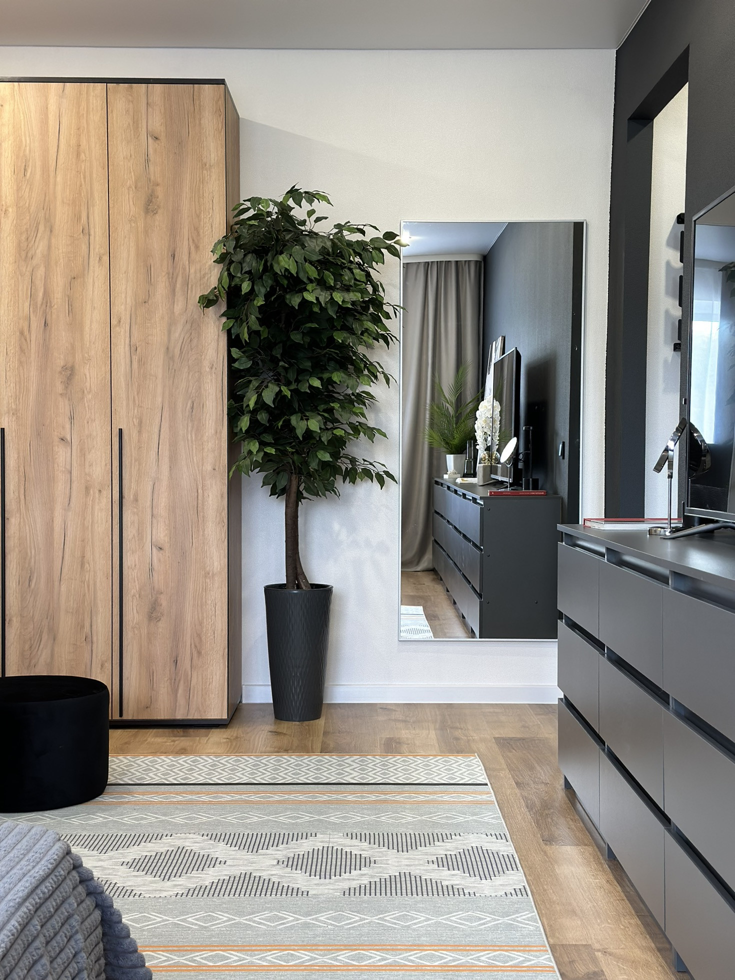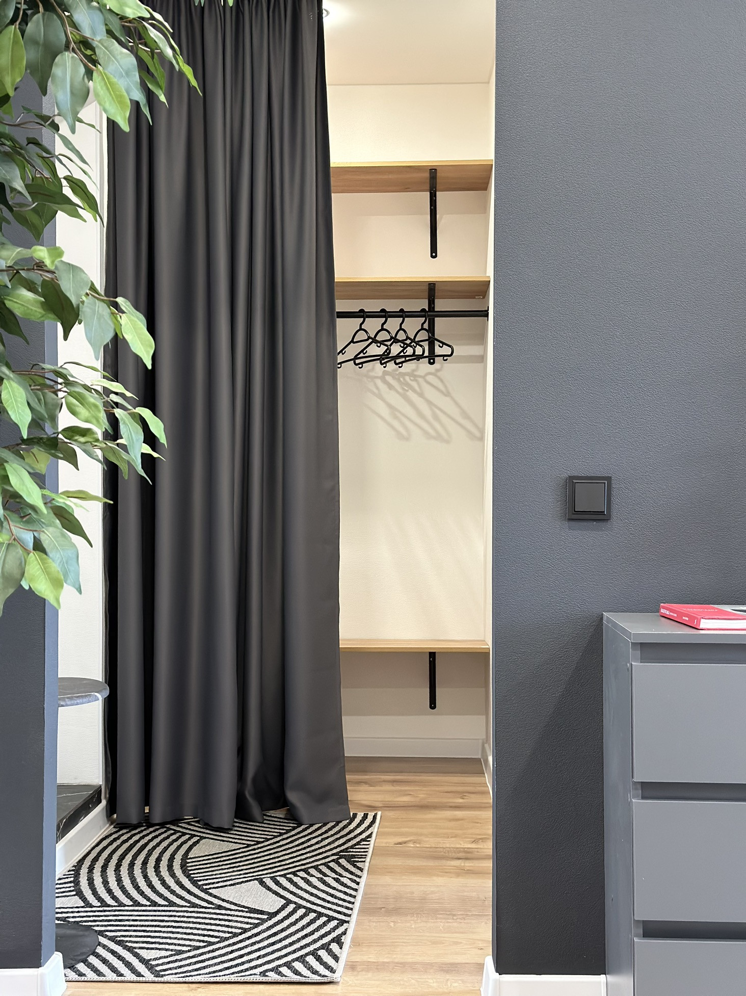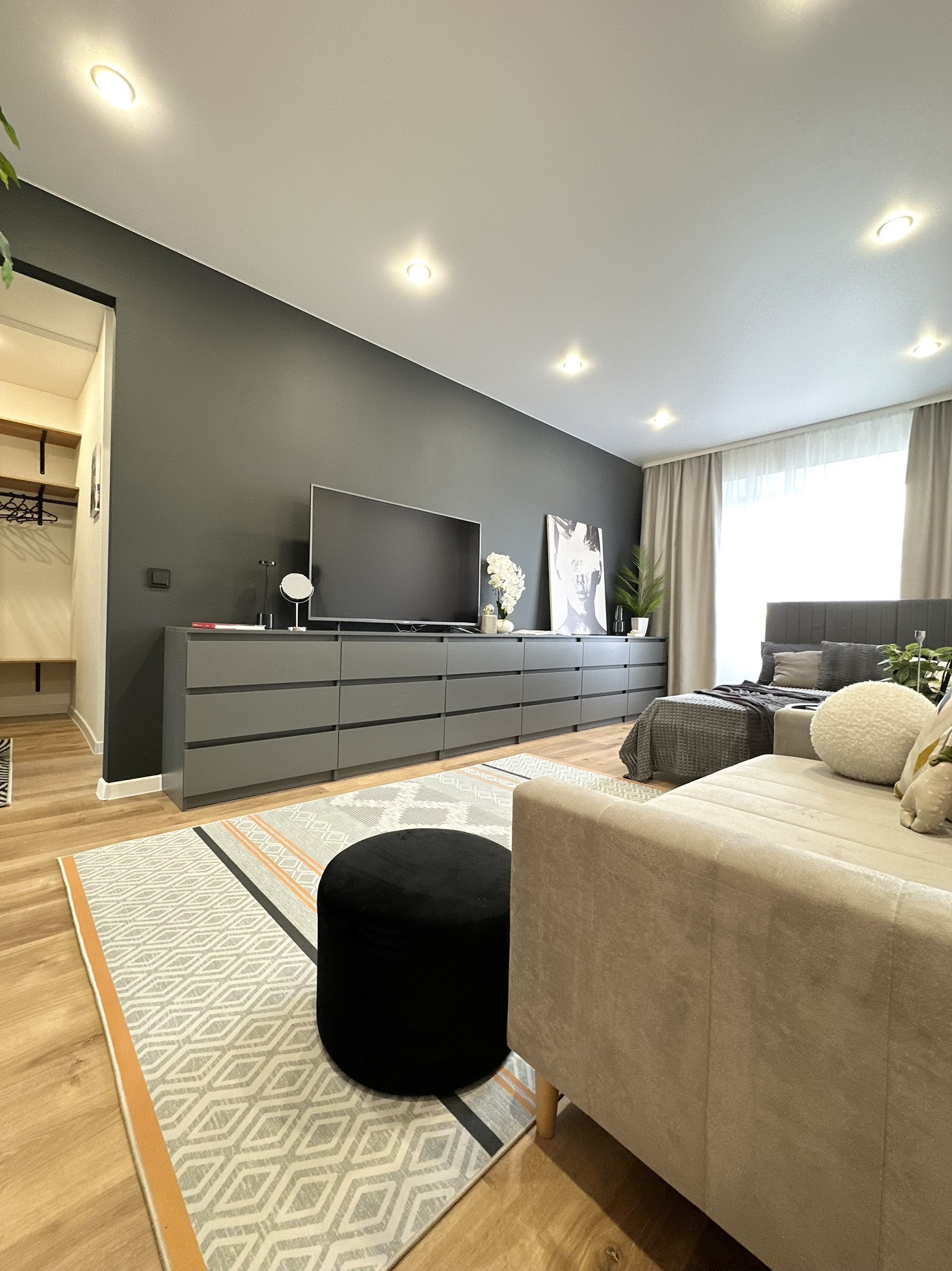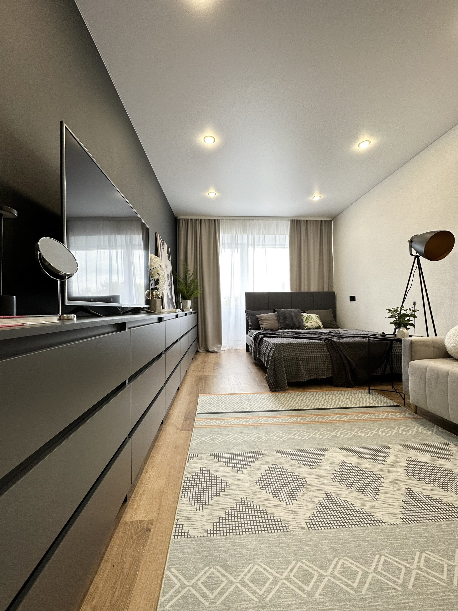 В квартире остается: кухонный гарнитур, шкаф для одежды, двуспальная кровать, матрас, барная стойка, 2 барных стула, диван, телевизор, занавески, холодильник, стиральная машина, электрический чайник, микроволновка, духовая печь, варочная панель, настенное зеркало в комнате, комоды, зеркало в ванной, полки в ванной, картины, вся сантехника и потолочное освещение.
