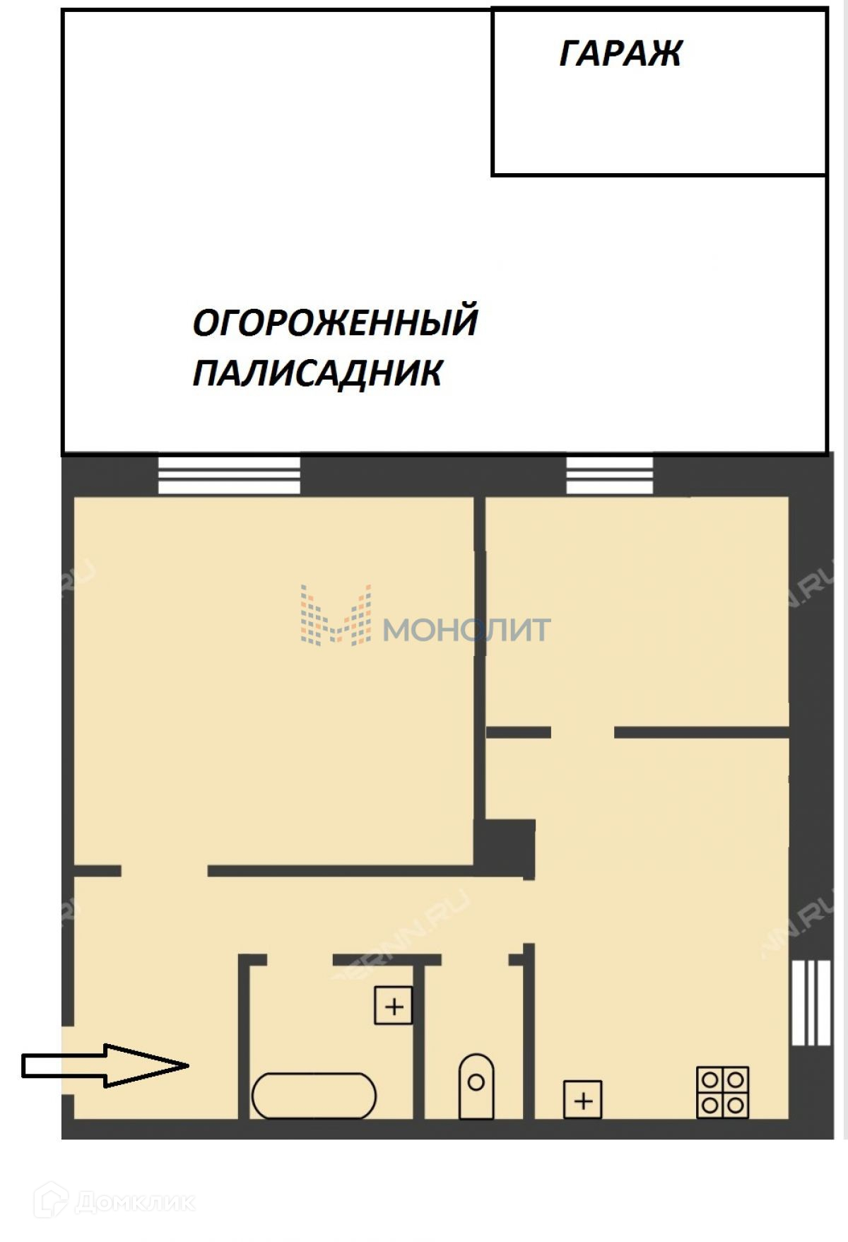 Перед окнами металлическим забором огорожен большой палисадник, которым пользуются собственники этой квартиры, есть гараж. Всё это передадим с квартирой.