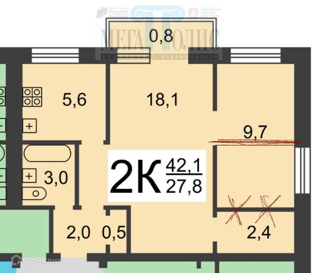 Жилая площадь 27.8 м2