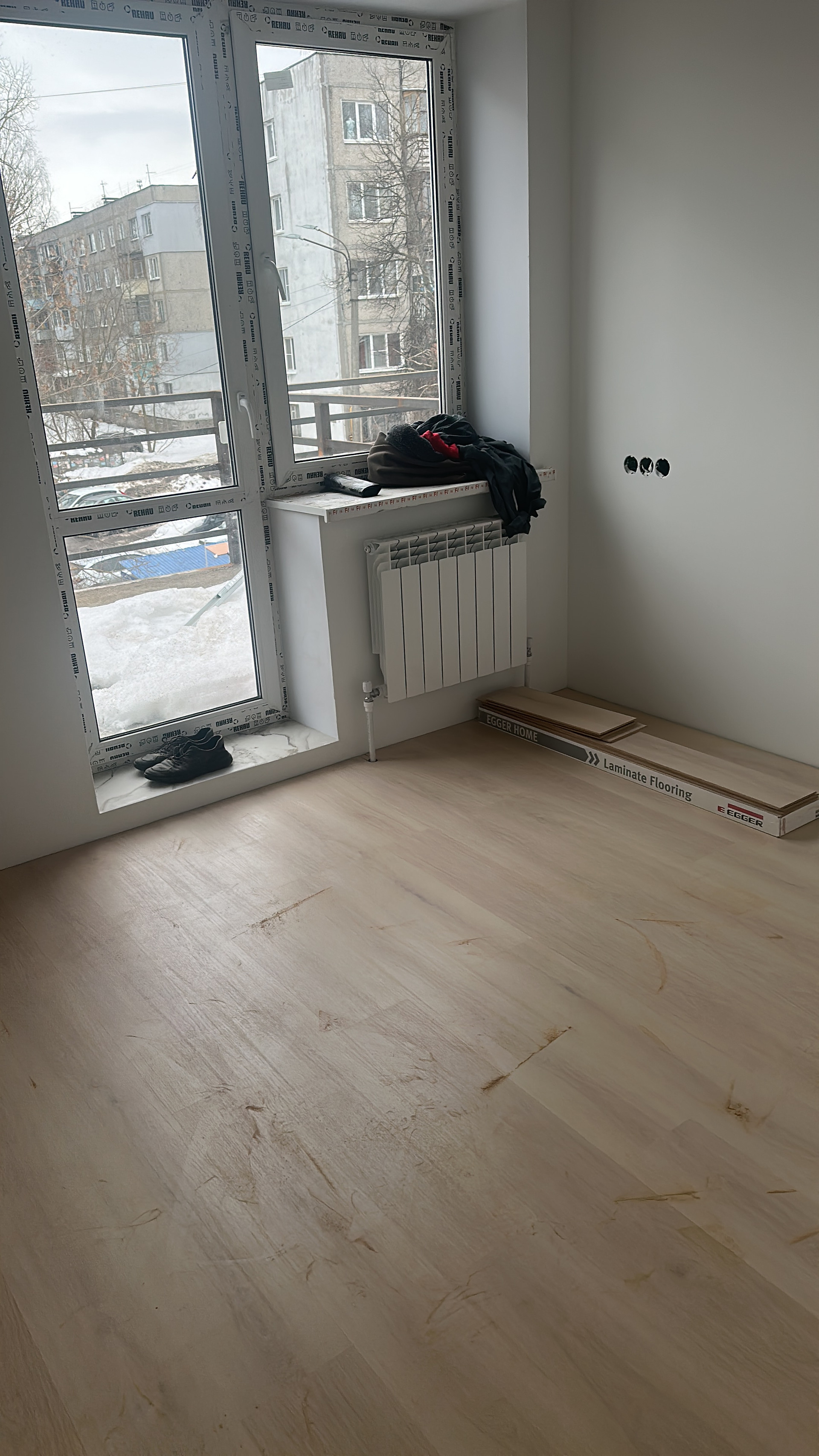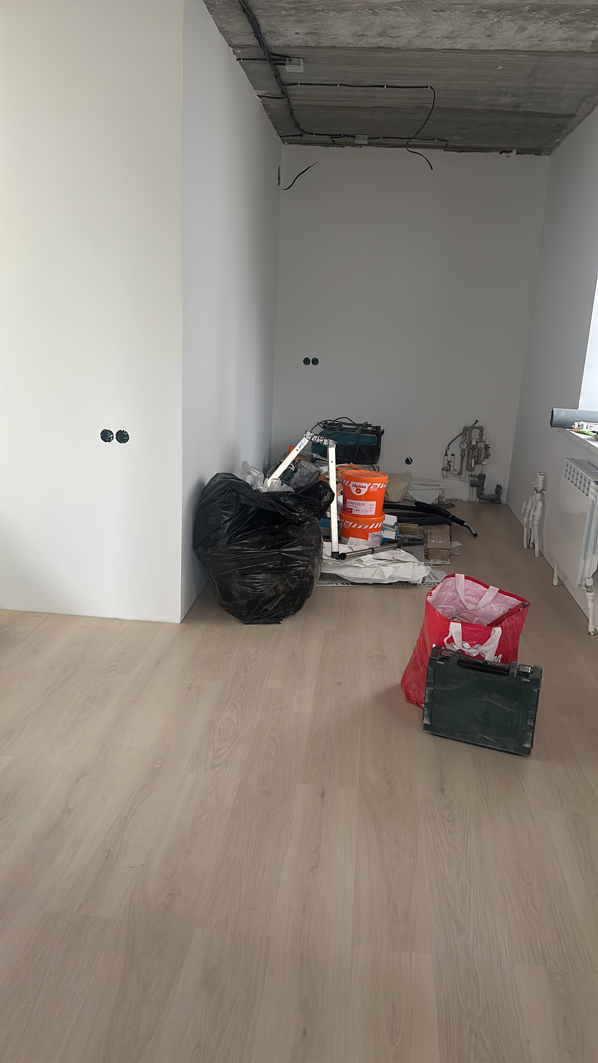 Пол - ламинат 33класс, стены окрашены в белый цвет , будет легко перекрасить под свой вкус и стиль , сан узел - керамогранит стены и пол, очень качественная проводка , много розеток , проходной выключатель в спальне