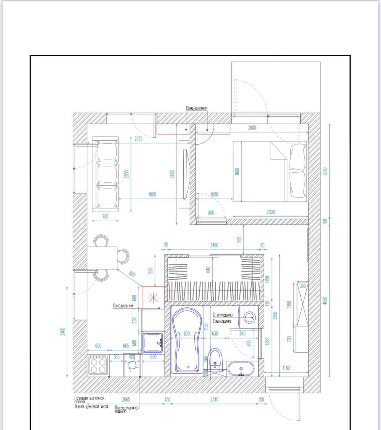 Планировка: Большой сан узел , кухня-гостиная, спальня , гардеробная комната