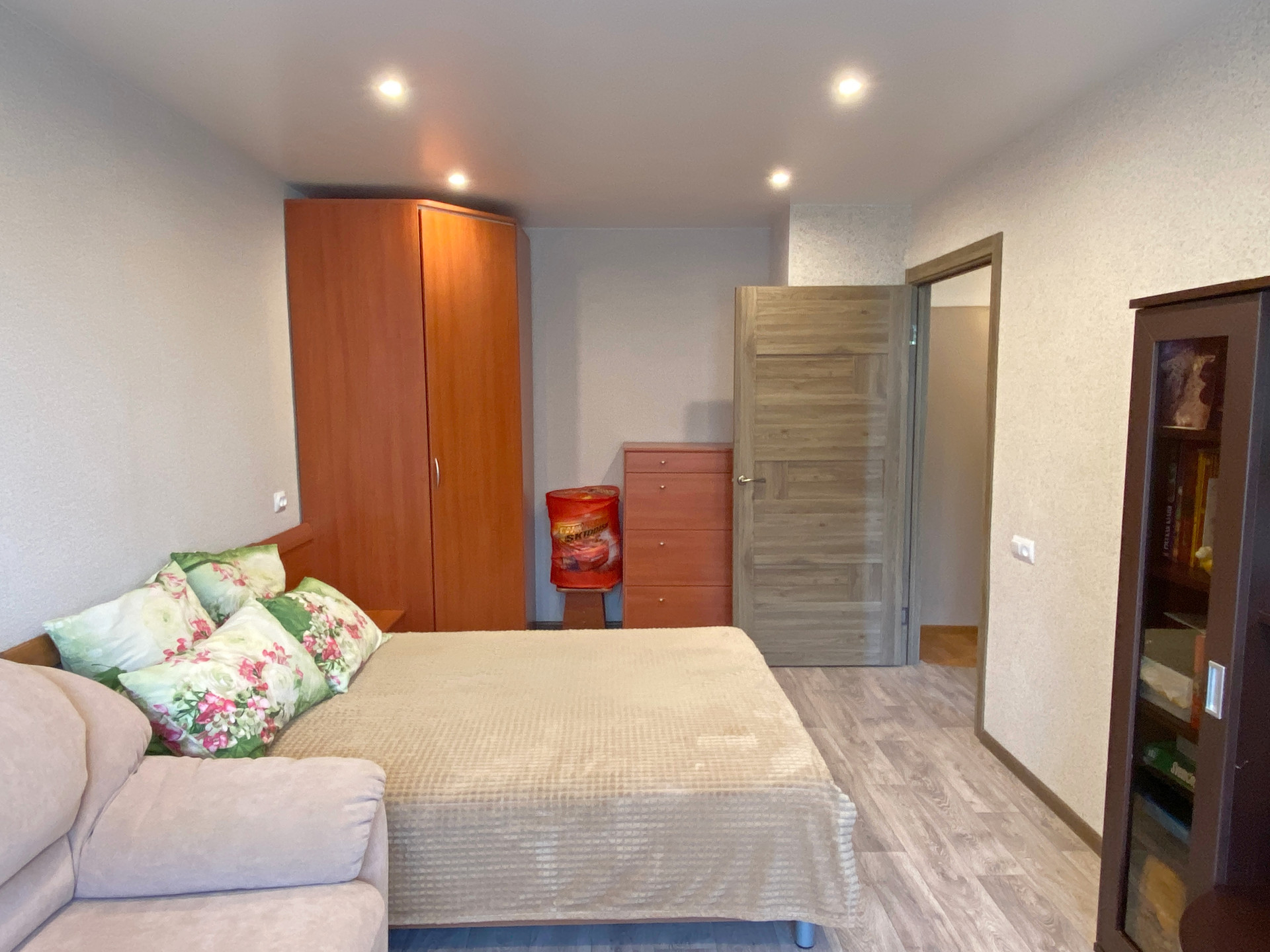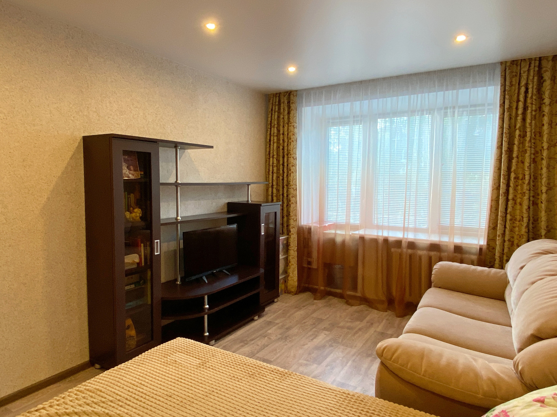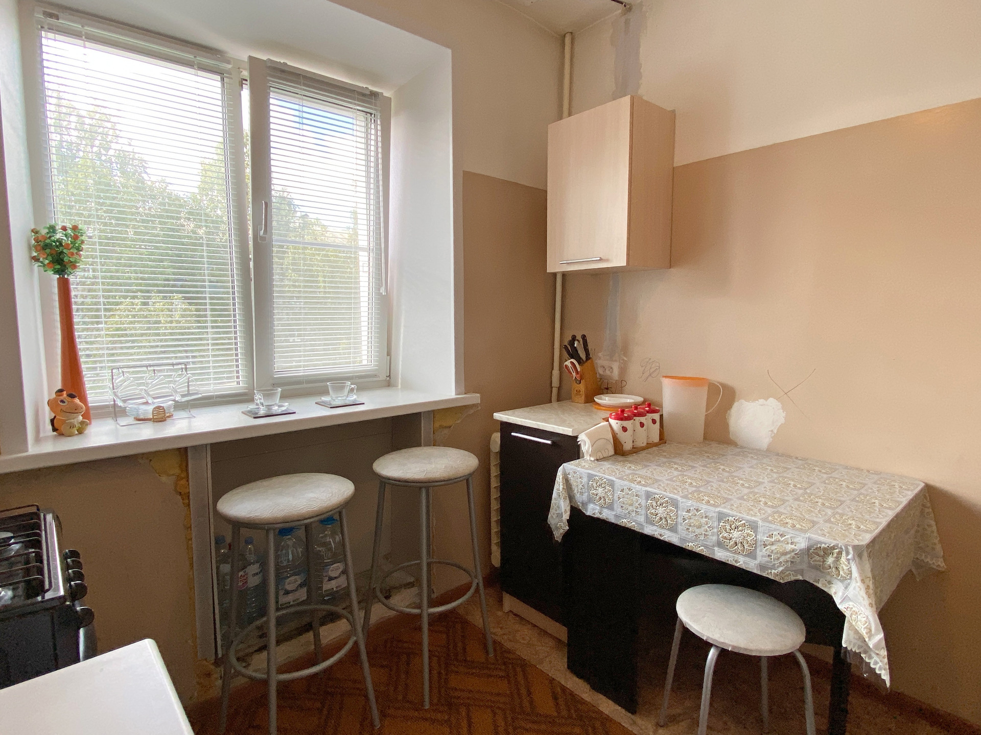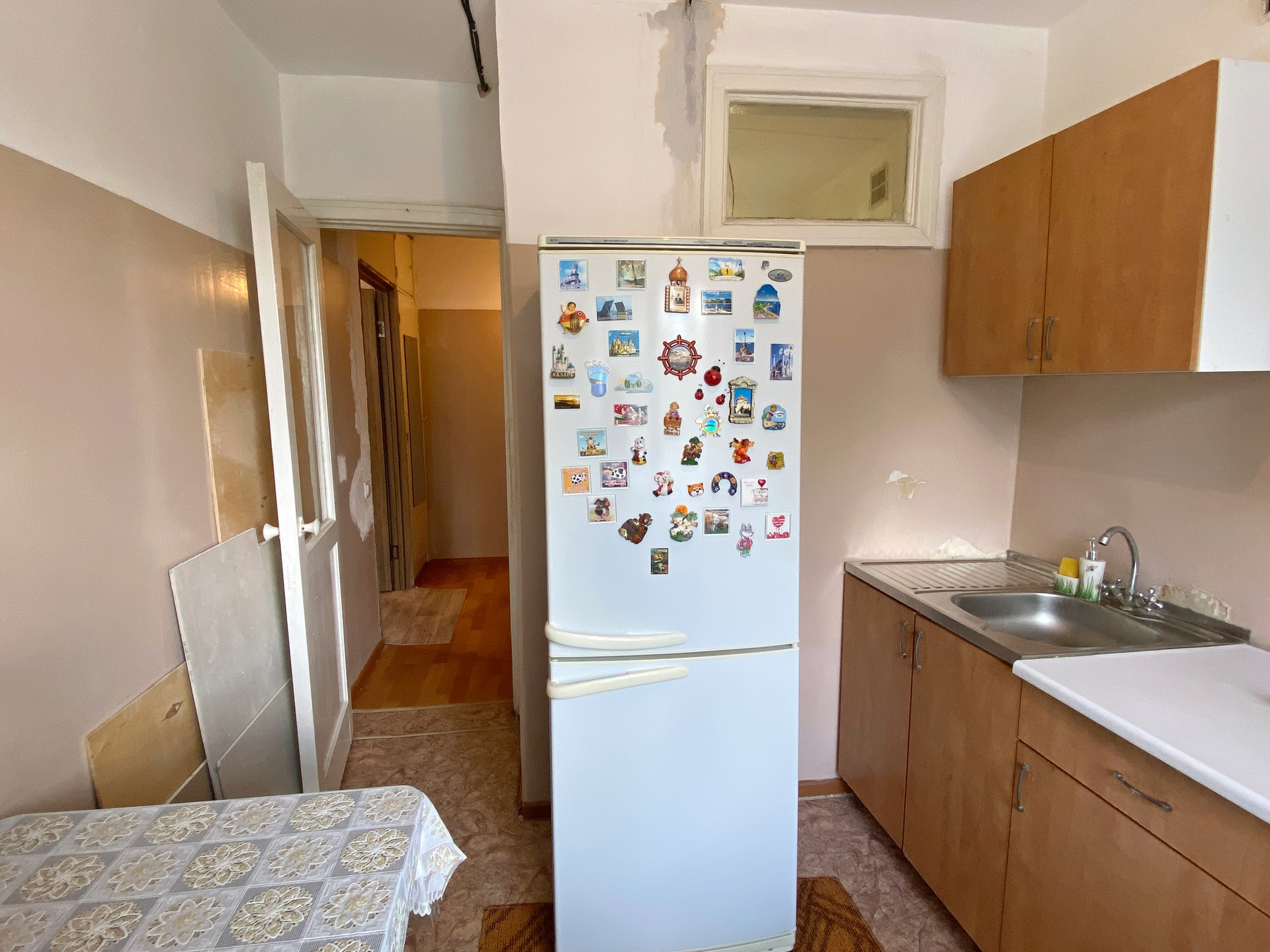 Квартира очень теплая, светлая. Проводка сменена во всей квартире, окна пластиковые, трубы сменены, чистовой ремонт сделан в комнате: полы и стены выровнены, натяжной потолок. В остальных помещениях нужен ремонт, балкон не застеклен.