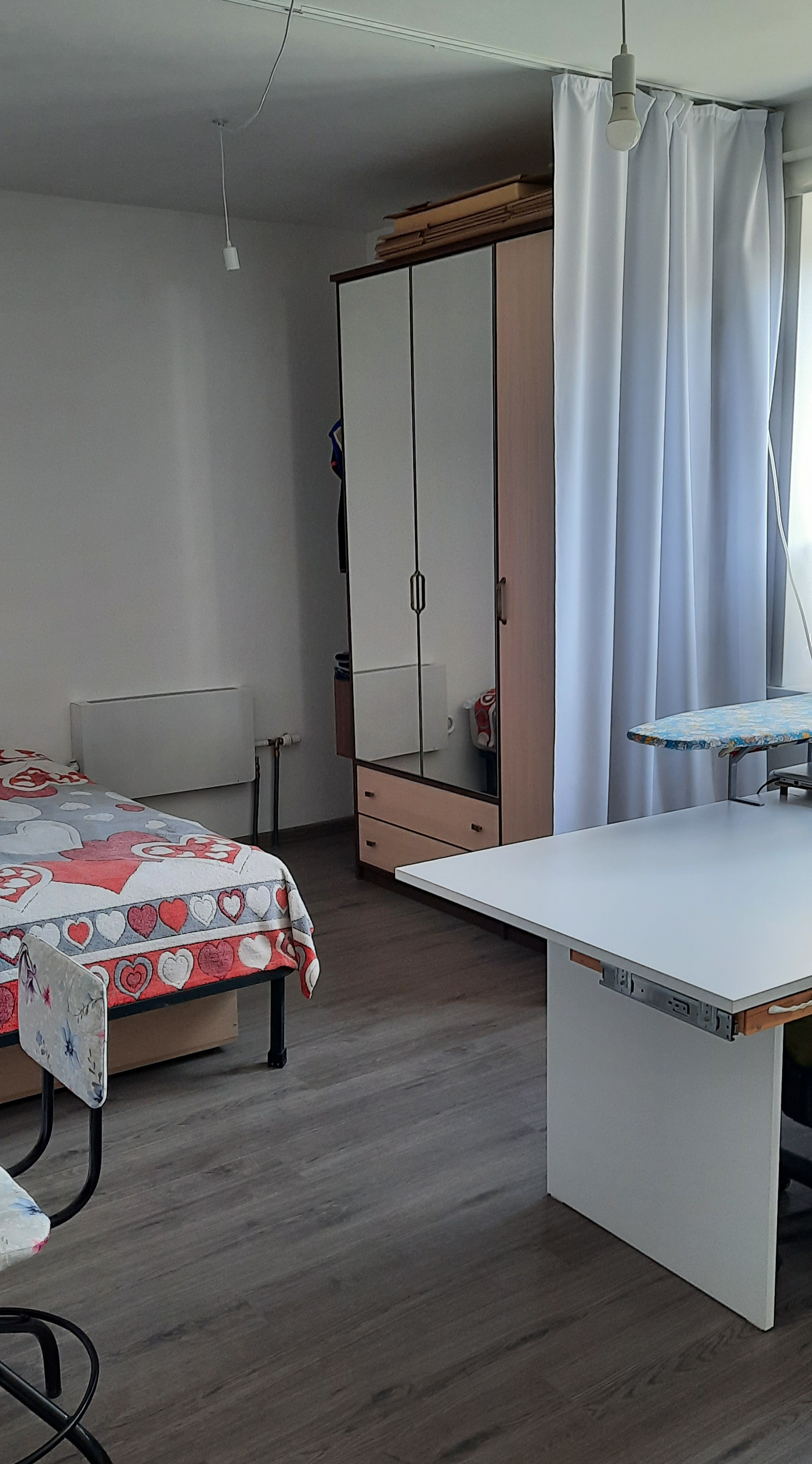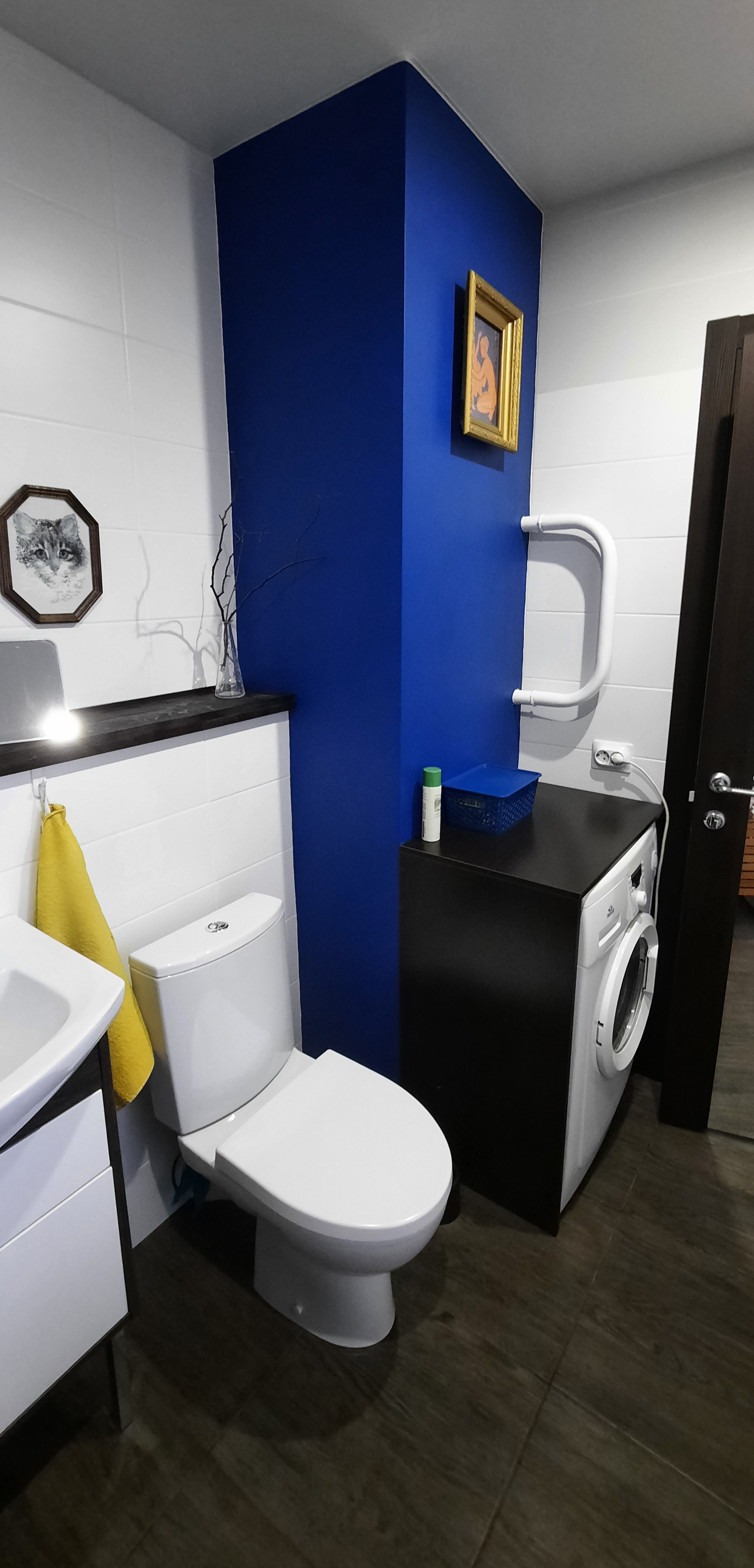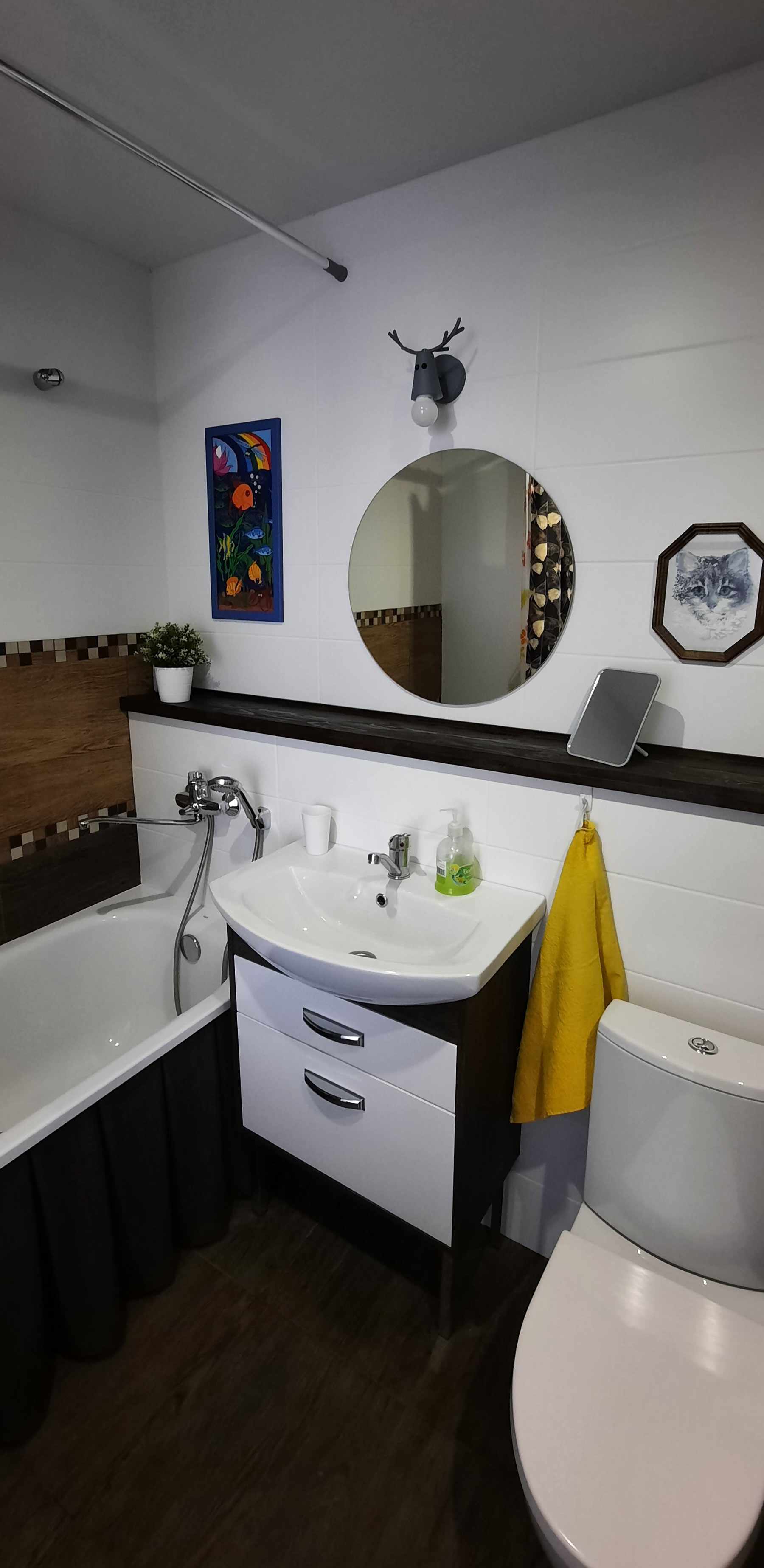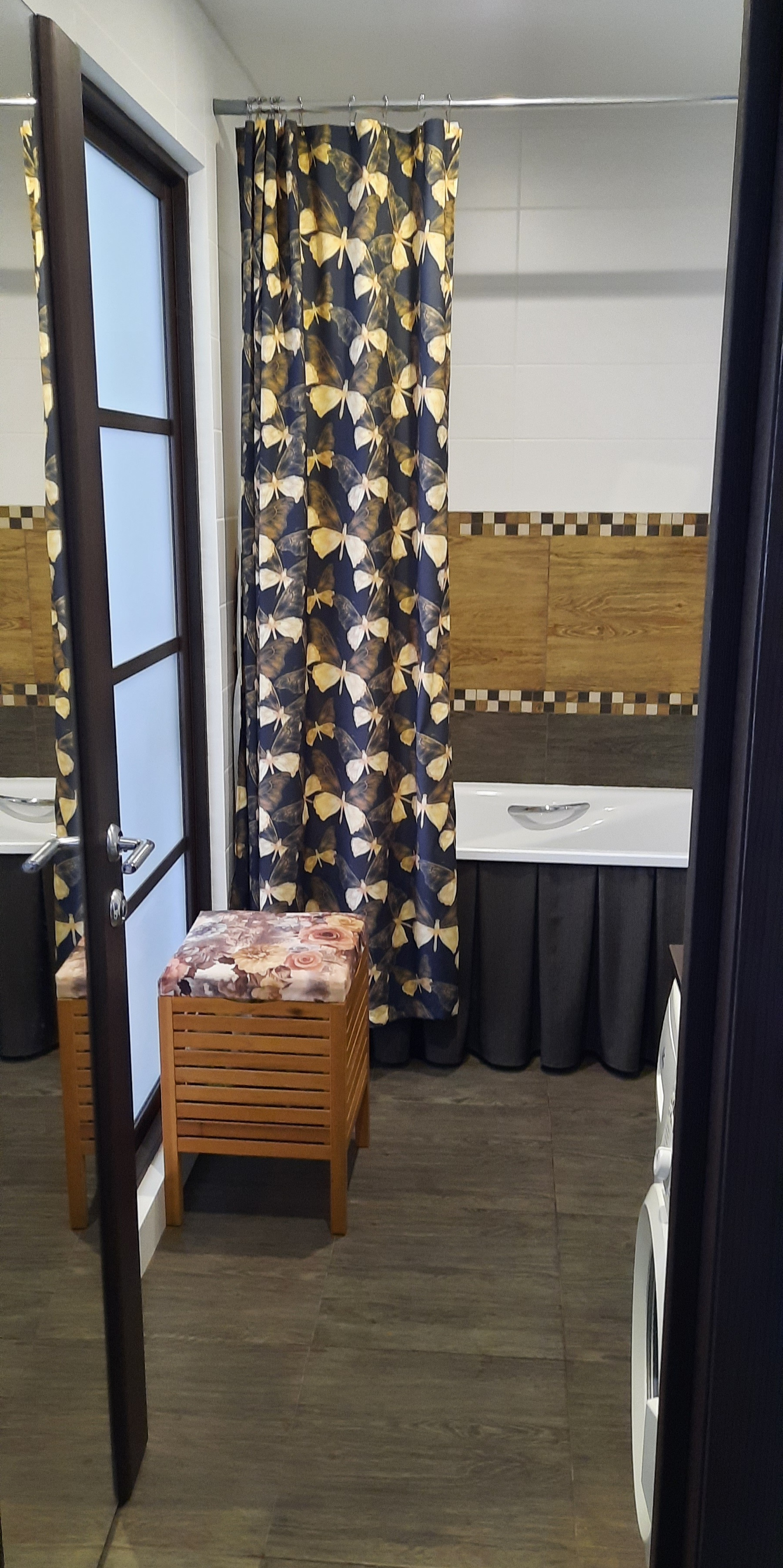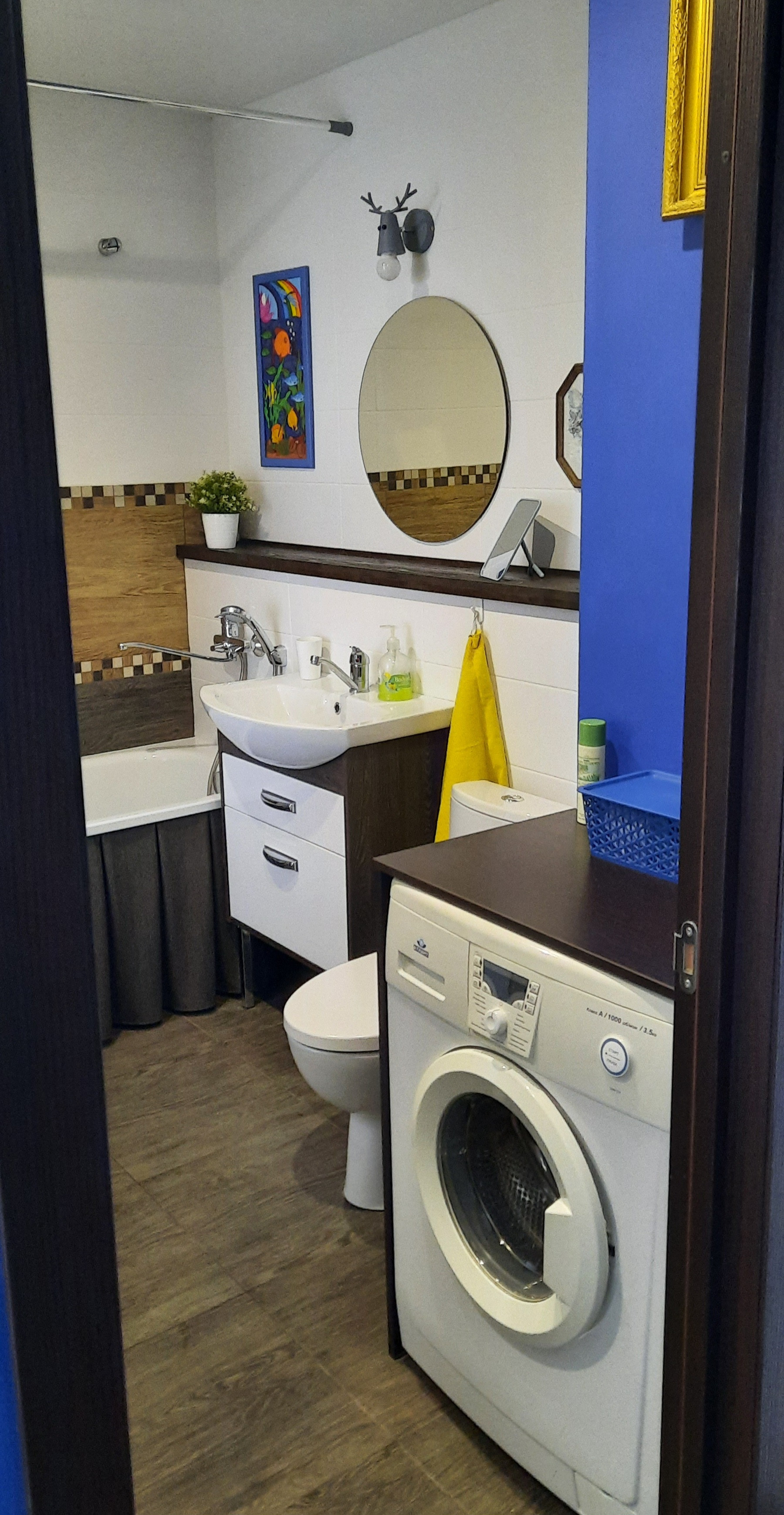- ванна, тумба с раковиной, унитаз безободковый, тумба для стиралки (помещается узкая стиральная машинка), шторы в ванной