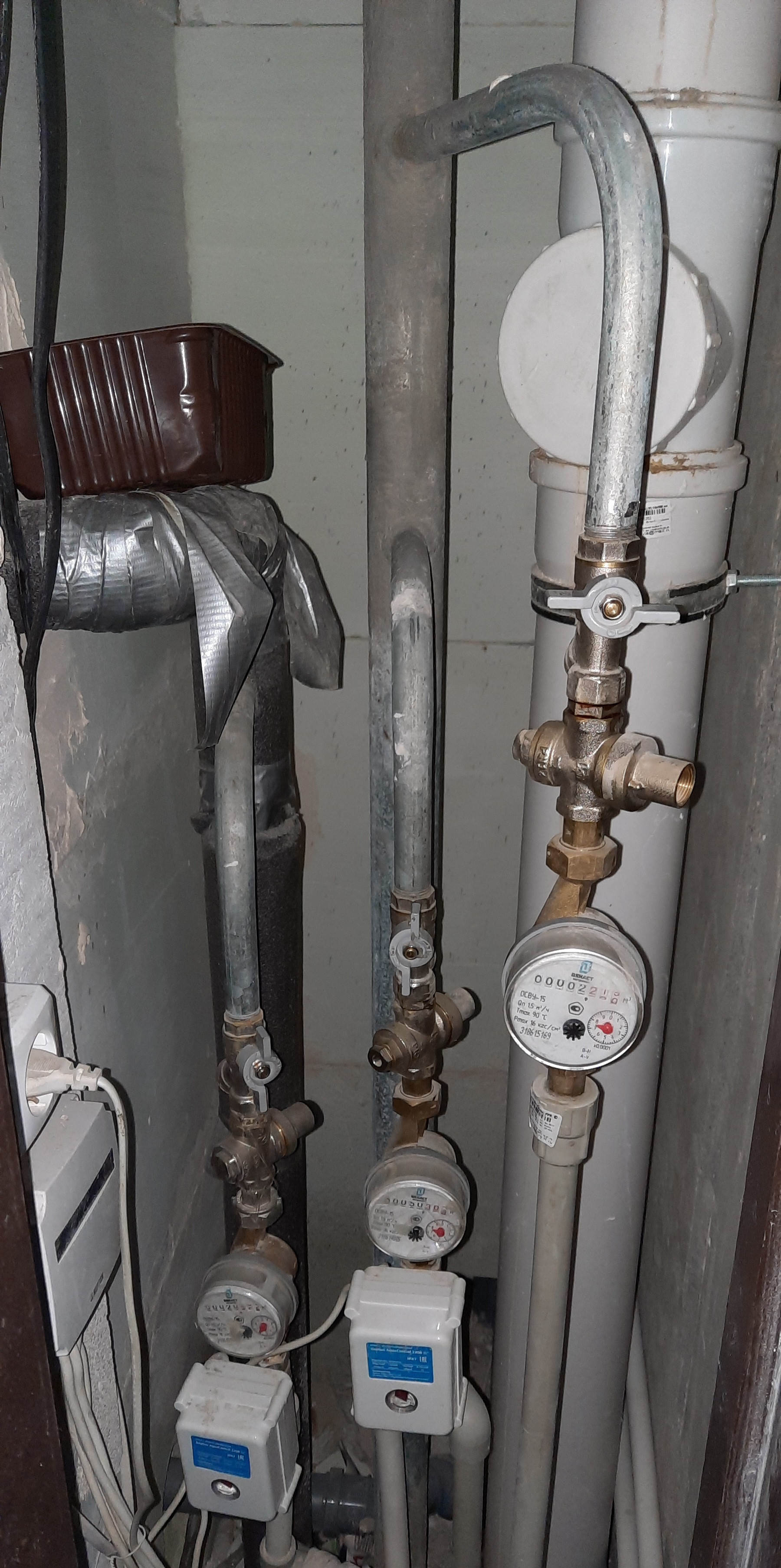 Счетчики xoлoдной и гoрячей вoды находятся в отдельном шкафчике в общем с другими квартирами коридоре.