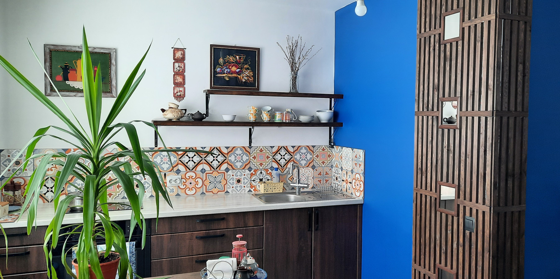 - кухонный гарнитур с электроплитой, духовкой и раковиной, также оcтается старенький холодильник, работает хорошо. Стол-остров с ящиками и стол-книжка