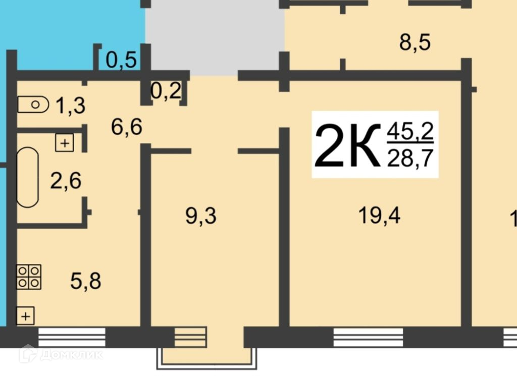- Общая площадь 45,2 кв.м.