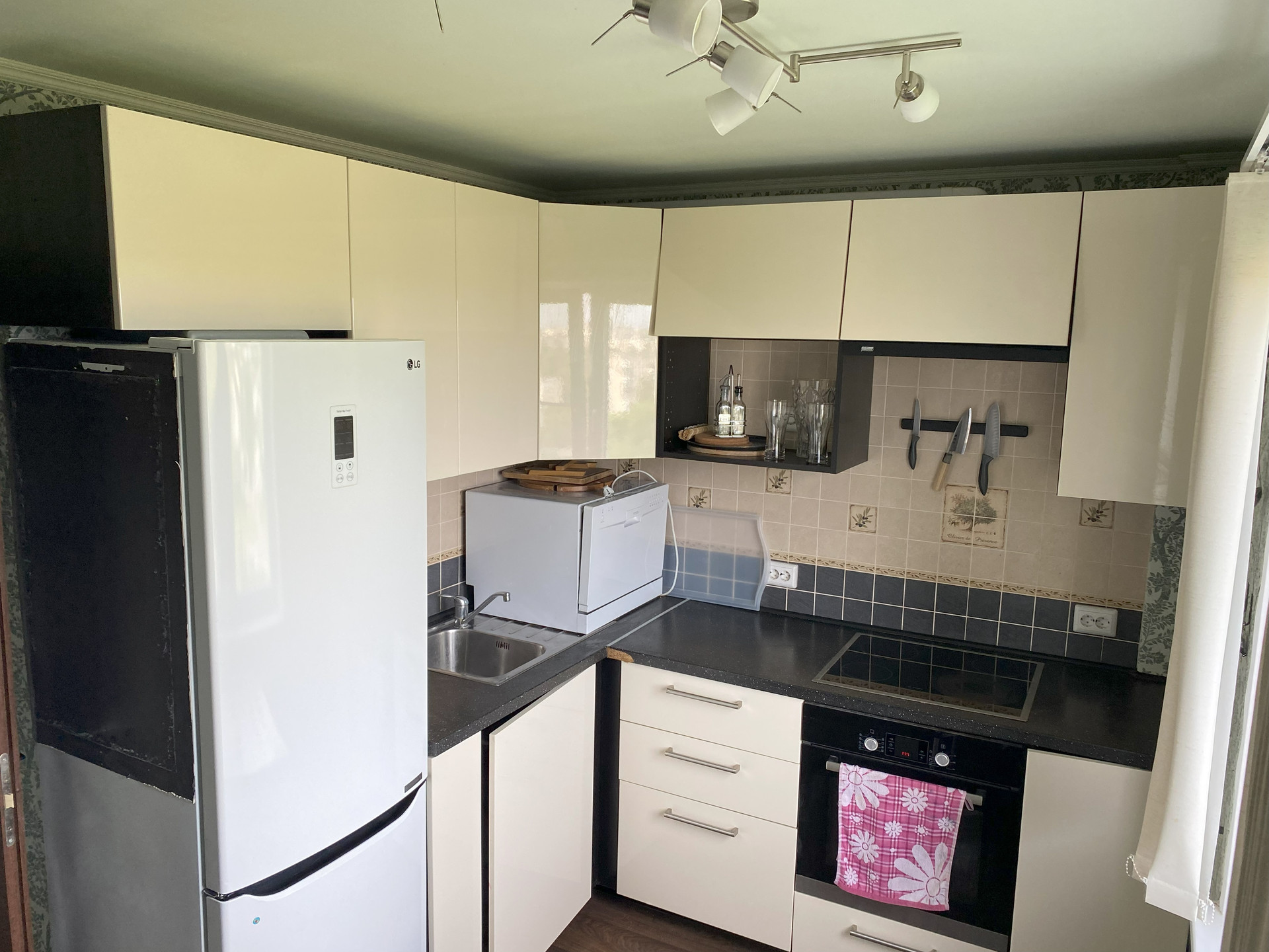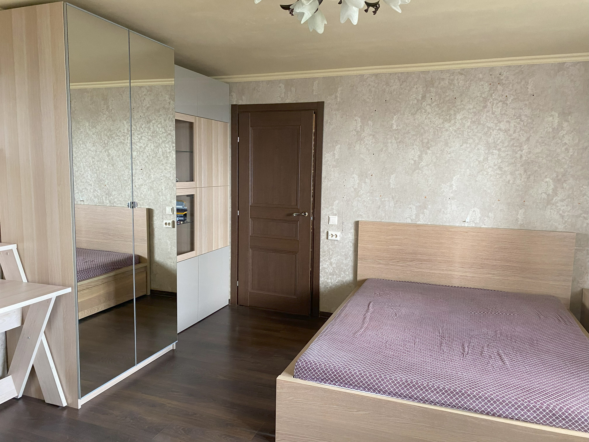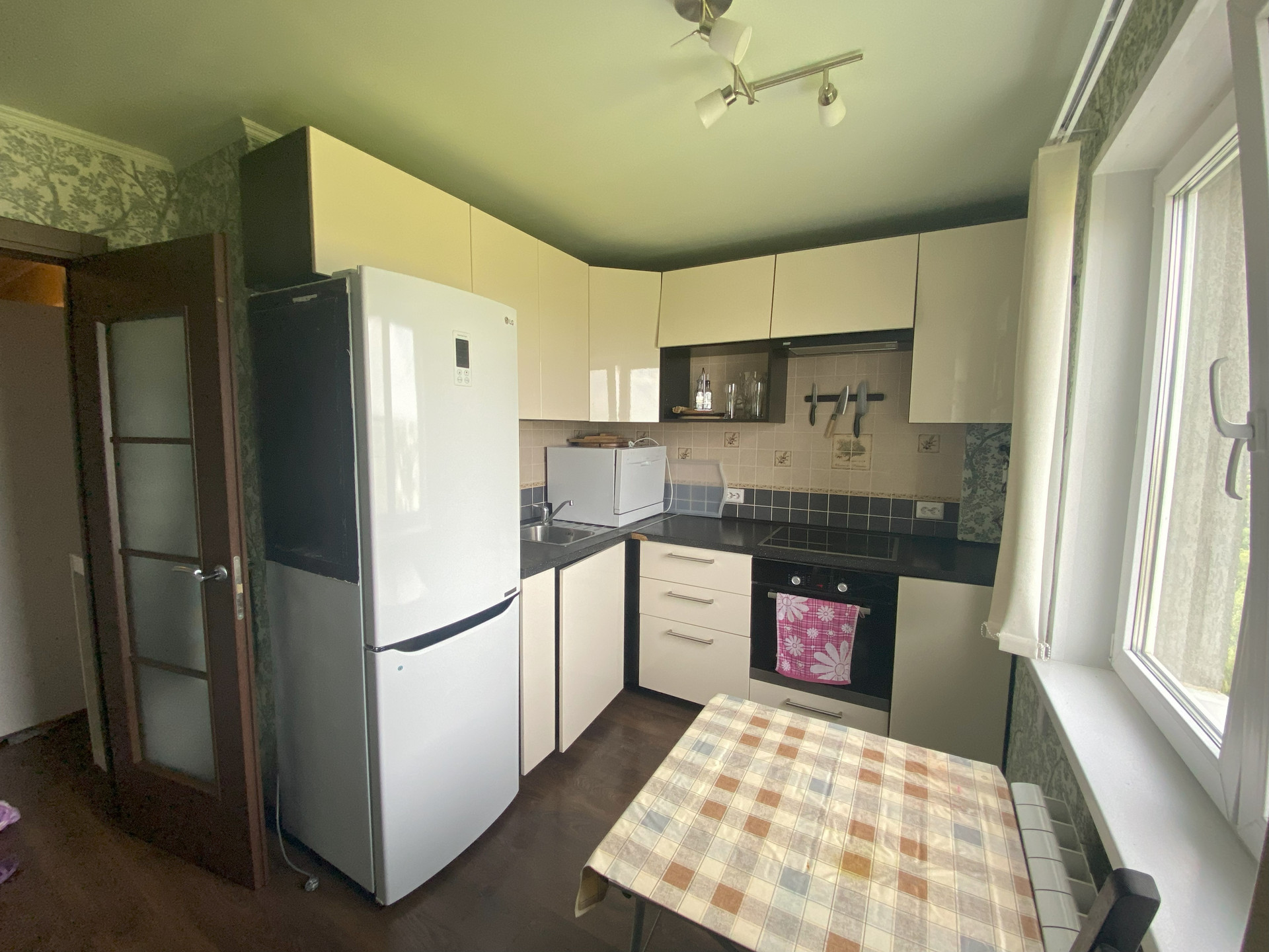 В квартире остается вся техника, которая есть на фото (холодильник, стиральная и посудомоечная машина, духовой шкаф и варочная поверхность), а также мебель (кровать, платяной шкаф, рабочие столы и др.).