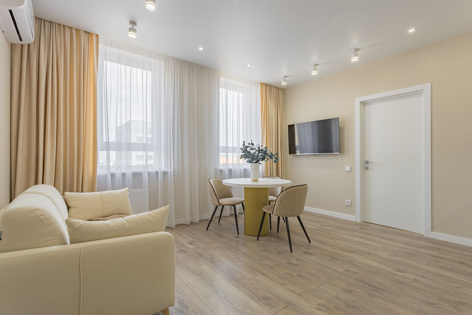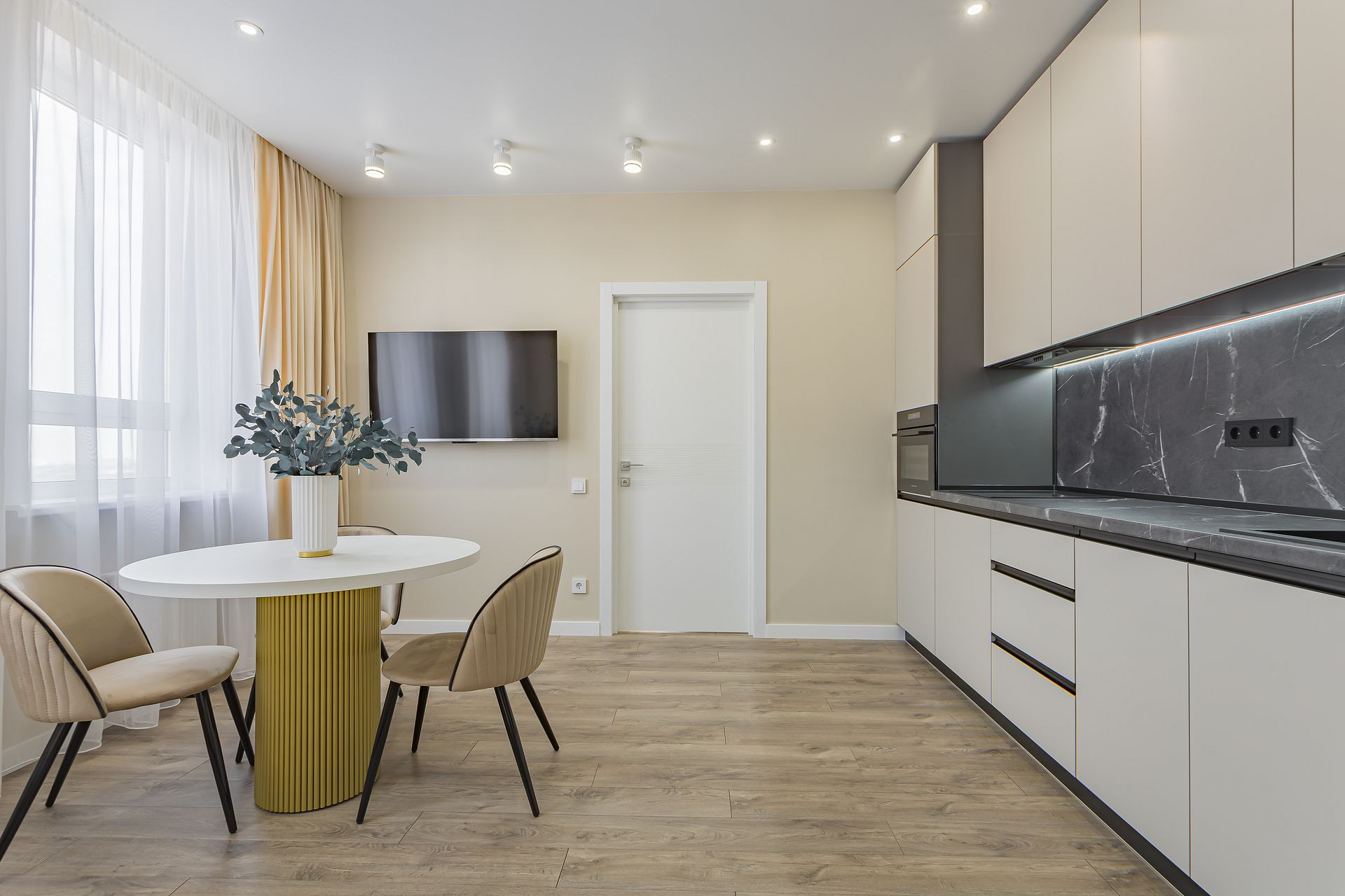 Кухня-гостиная 19,16 кв м: встроенная кухня с фасадами AGT, каменная мойка со смесителем, с подсветкой, встроенный холодильник Gorenje c морозильной камерой No Frost, индукционная варочная поверхность, духовой шкаф с функцией СВЧ Kuppersberg, посудомоечная машина, вытяжка, кондиционер, стол диаметр 1 метр с красивым металлическим подстольем, 3 стула. Шторы на заказ. Раскладной диван. Телевизор Haier 50 диагональ со смарт тв. Кондиционер.