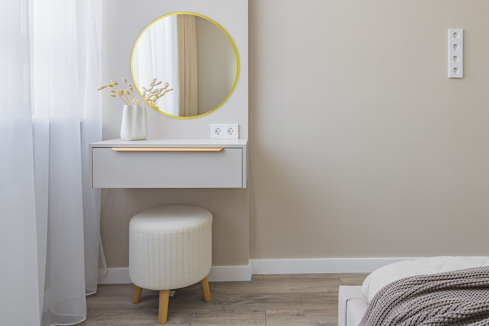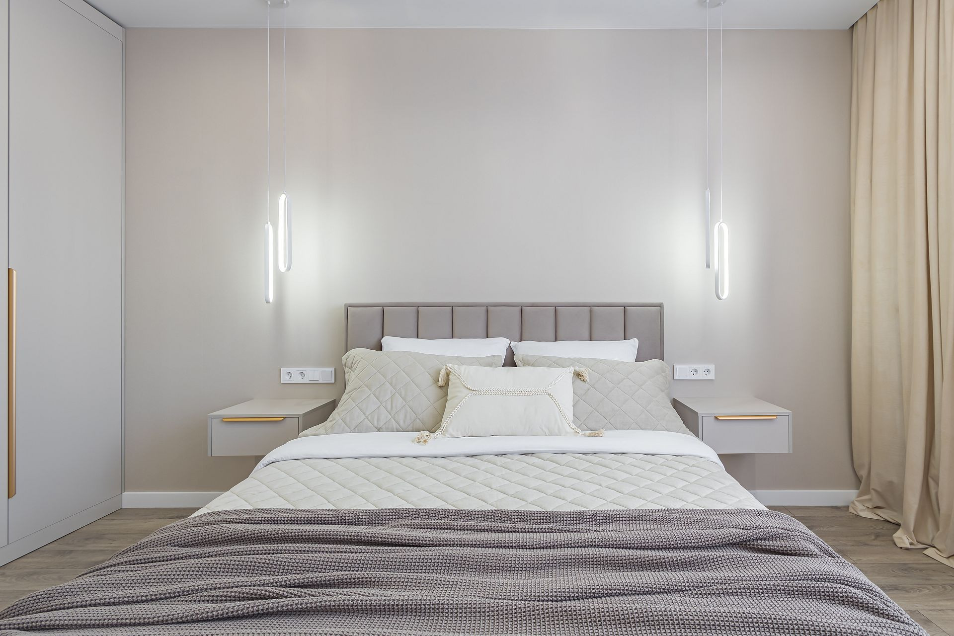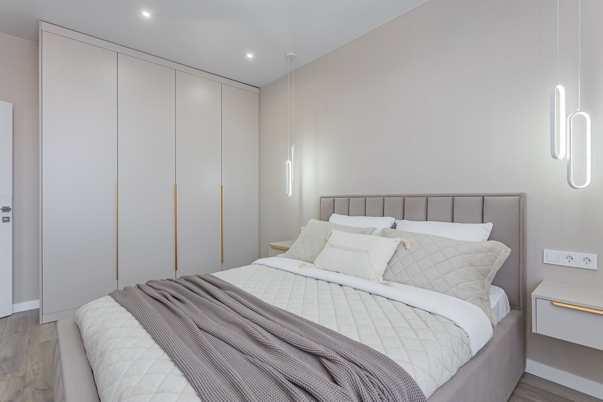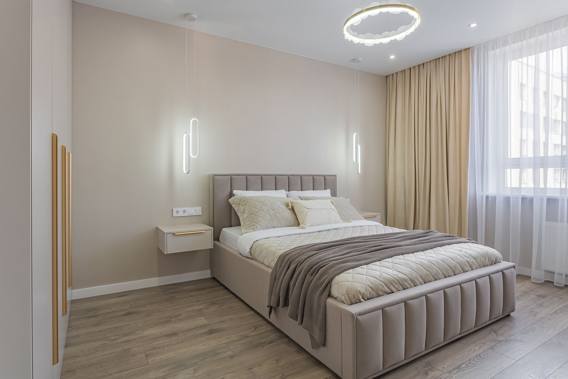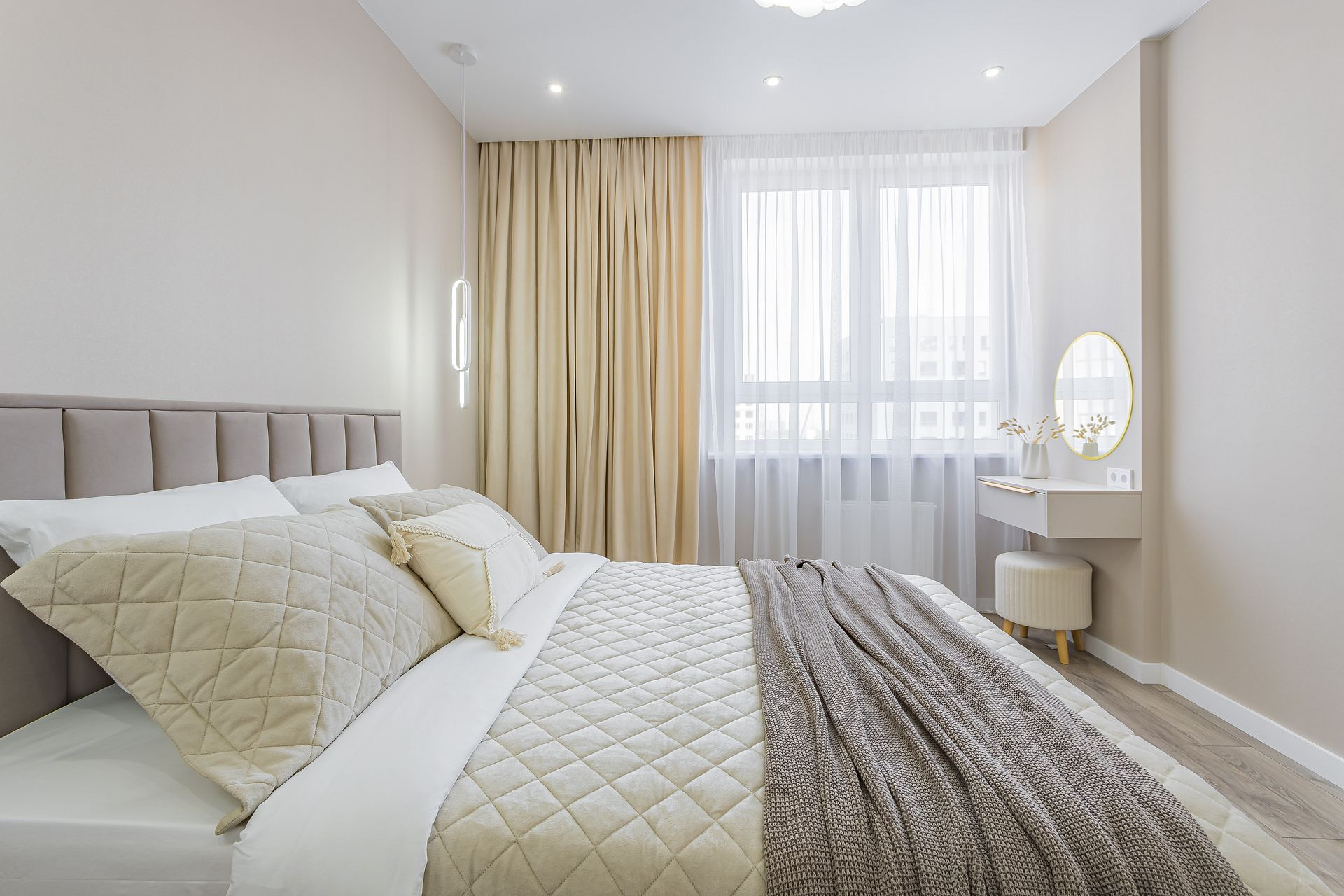 Спальня 15,1 кв м с мебелью: кровать с подъемным механизмом, матрас, декор, шкаф, подвесной туалетный столик на заказ с зеркалом и пуфом, подвесные светильники, люстра, подвесные тумбочки на заказ.