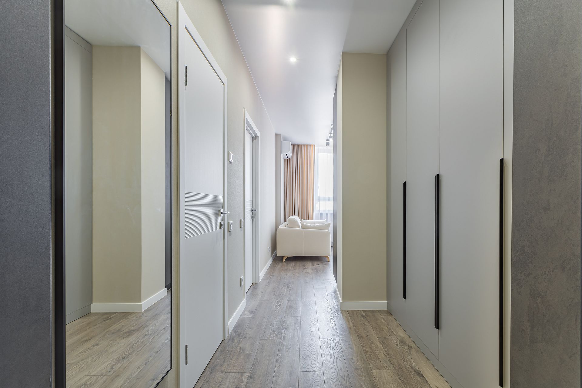Прихожая 4,99 кв м с встроенным шкафом, зеркалом.