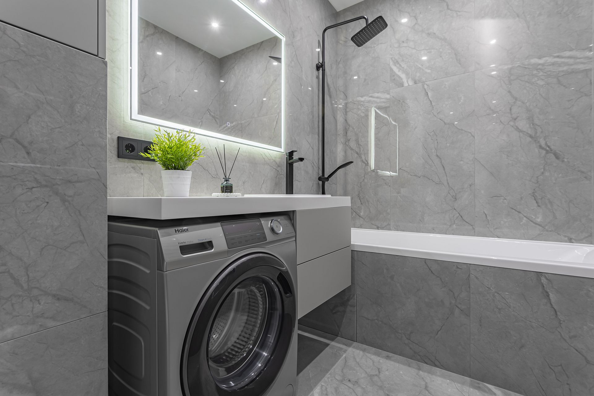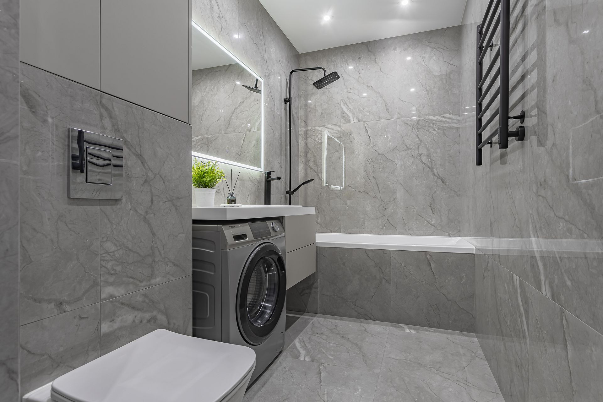 Санузел совместный 5,43 кв м. Мебель на заказ с влагостойкими фасадами в пленке. Керамогранит Laparet 120х60. Электрический теплый пол. Система инсталляции Grohe, безободковый унитаз Belbagno, душевая система Lemark Tropic. Стиральная машина Haier на 7 кг.