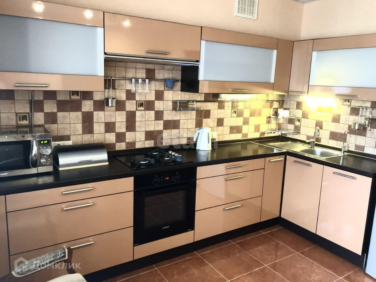 Оборудована полным комплектом техники: холодильник, свч, духовой шкаф, комбинированная варочная панель (1 электрическая, 3 газовые конфорки), стиральная машина, телевизор.