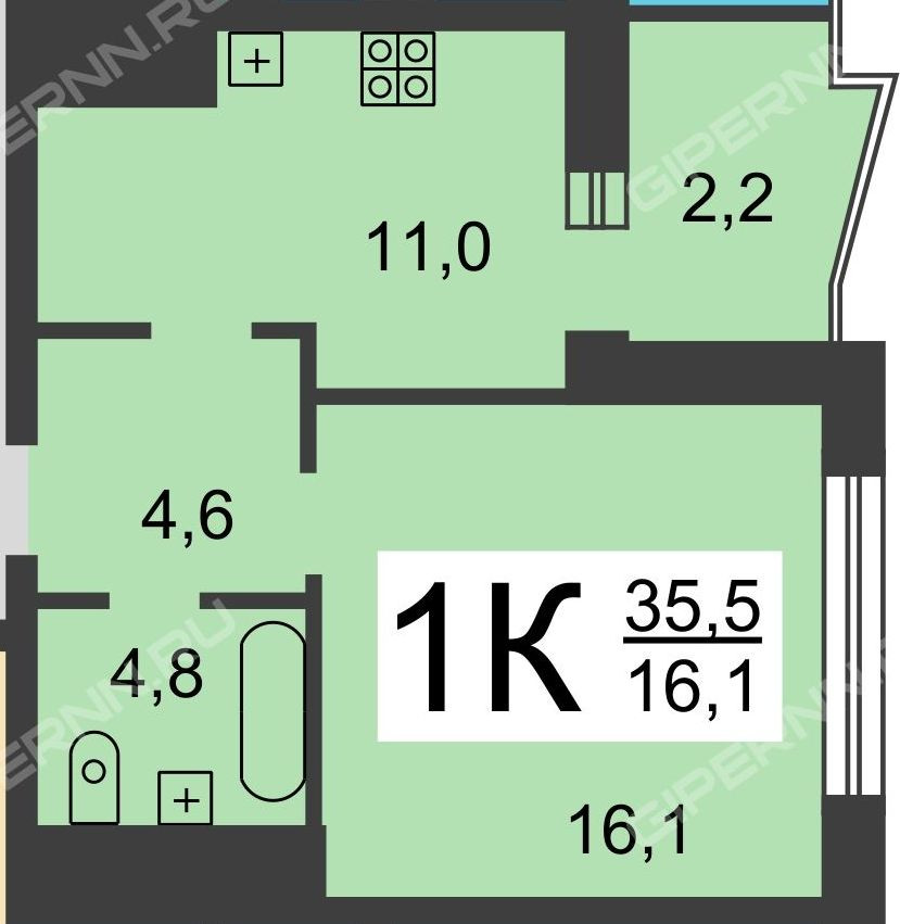Жилая площадь 16.1 м2