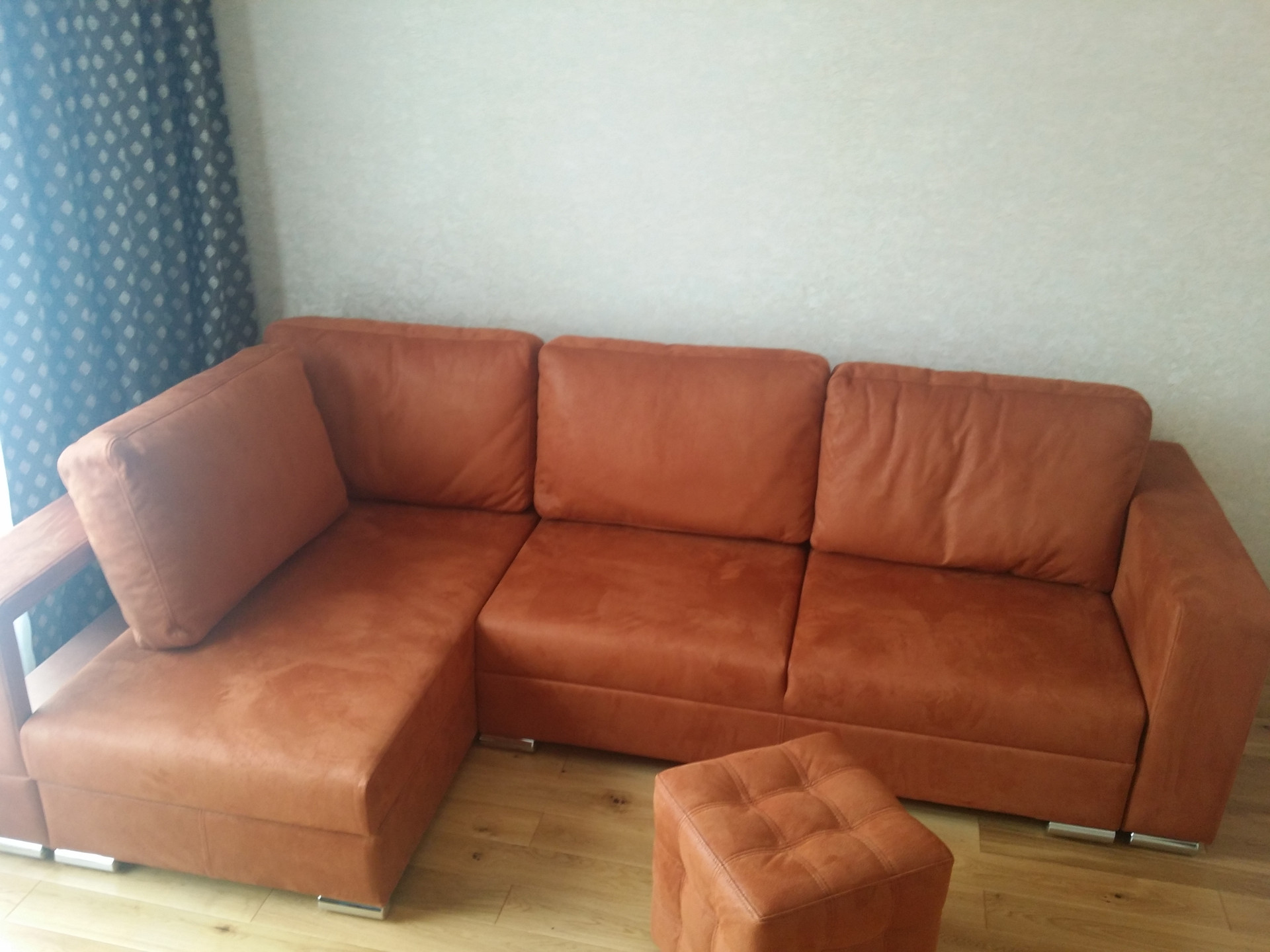 В комнате большой диван-кровать и люстра. Огромное двустворчатое окно в пол. Установлены замки на окнах и москитная сетка. Снаружи застройщиком установлено железное ограждение.