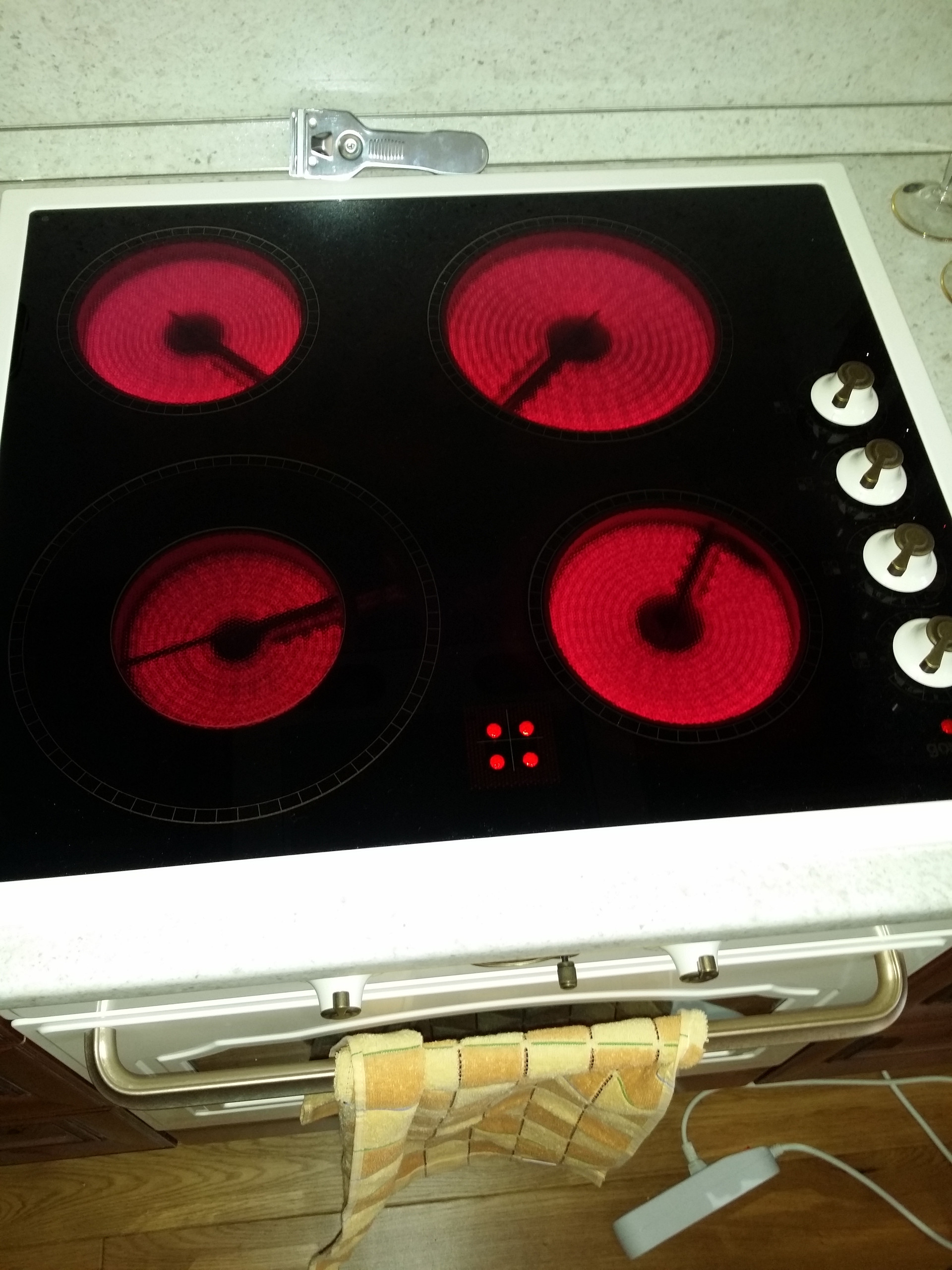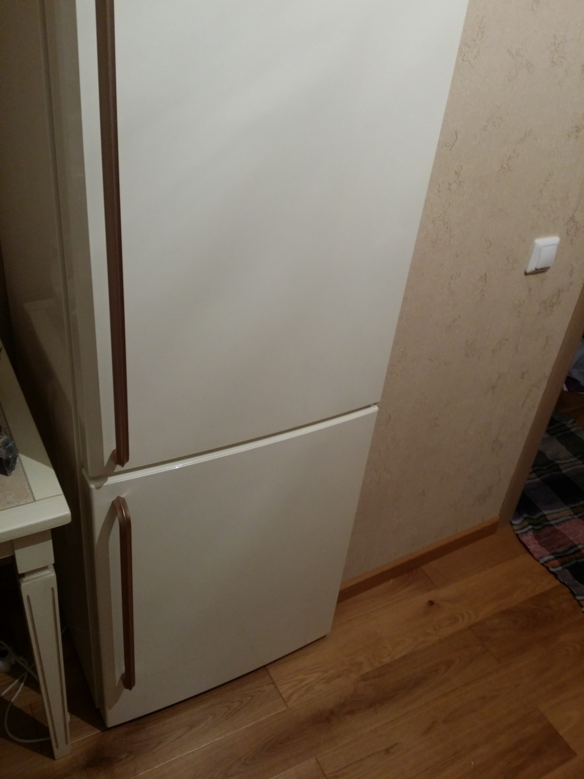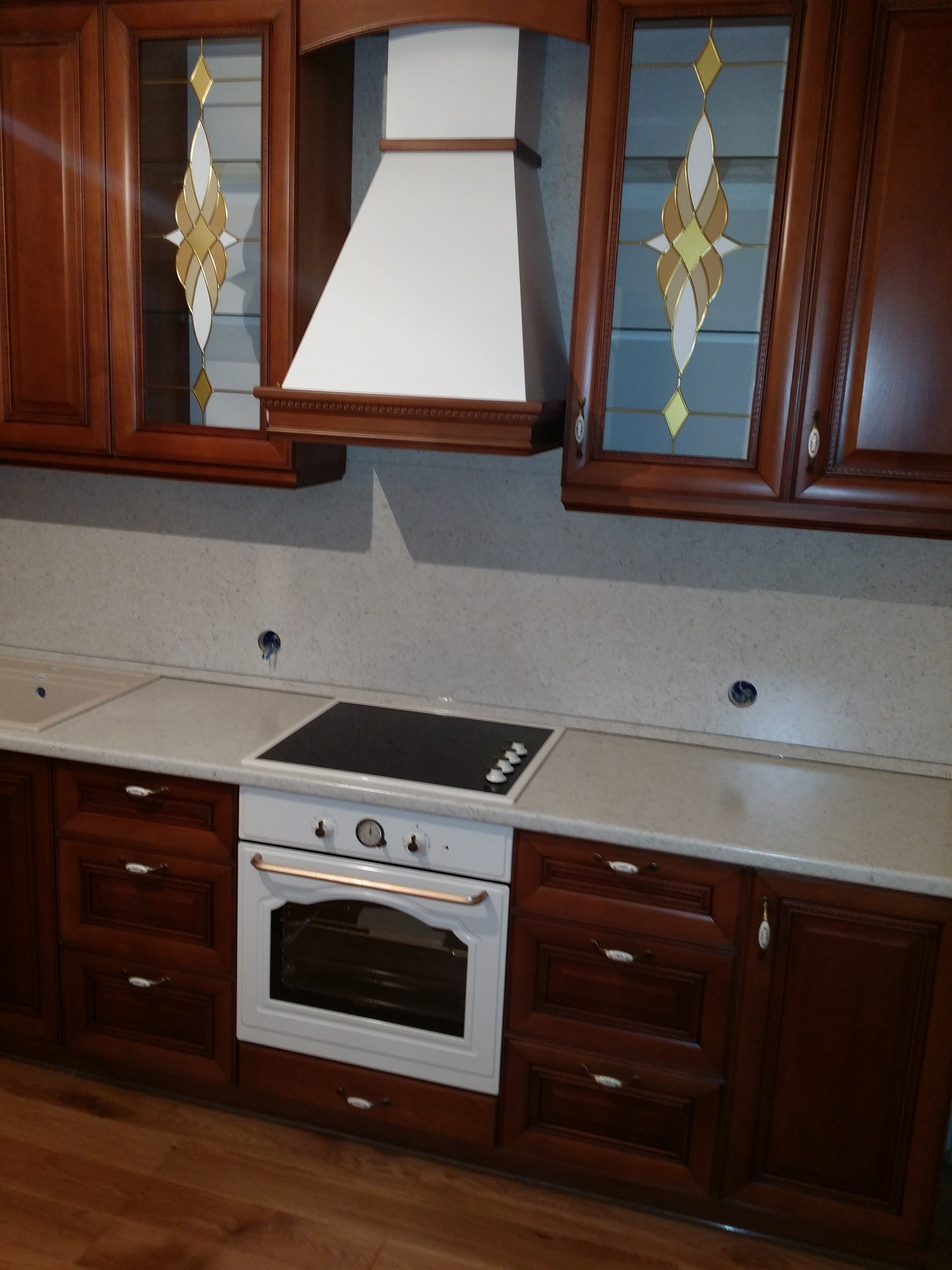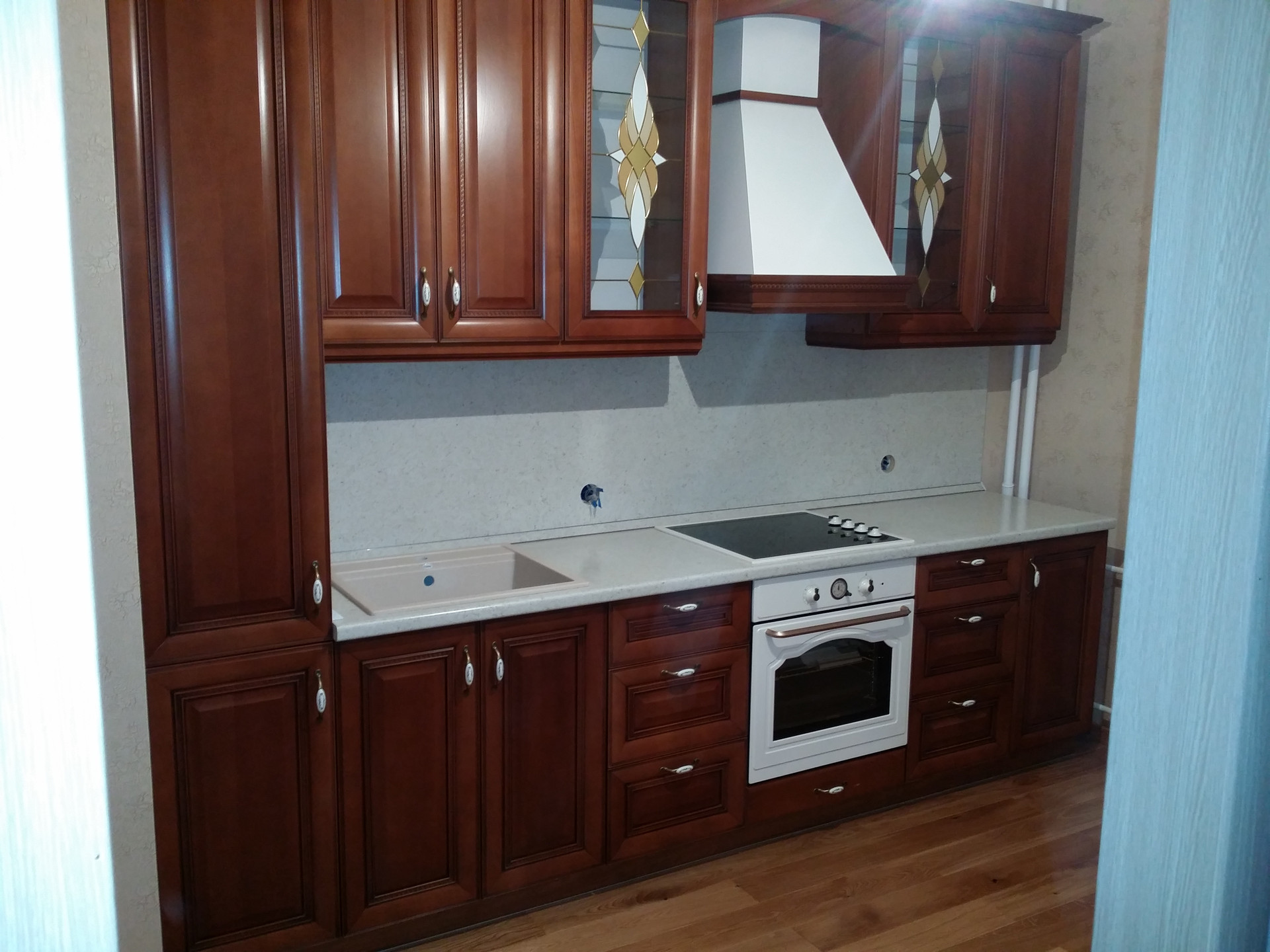 Классическая кухня из массива дуба с электрической варочной панелью и электрической духовкой. Вытяжка. Холодильник. Обеденный стол и четыре стула. Люстра. Карниз и тюль. Стояки закрыты вертикальным шкафом. Есть лючок для доступа к счетчикам и кранам от стояка.