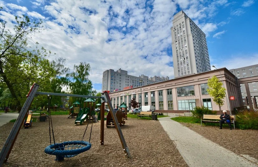 Детская площадка, продуктовые магазины, автосервисы, пункты выдачи маркетплейсов.