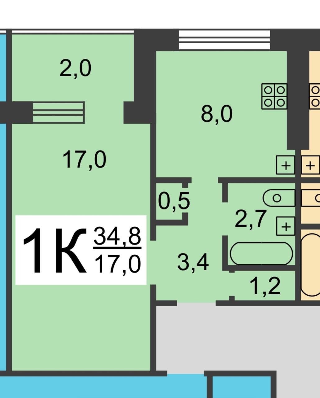 Жилая площадь составляет 17 квадратных метров, что позволяет комфортно разместиться одному человеку или паре. Кухня площадью 8 квадратных метров оборудована всем необходимым для приготовления пищи. Санузел совмещённый, что является удобным решением для экономии пространства.