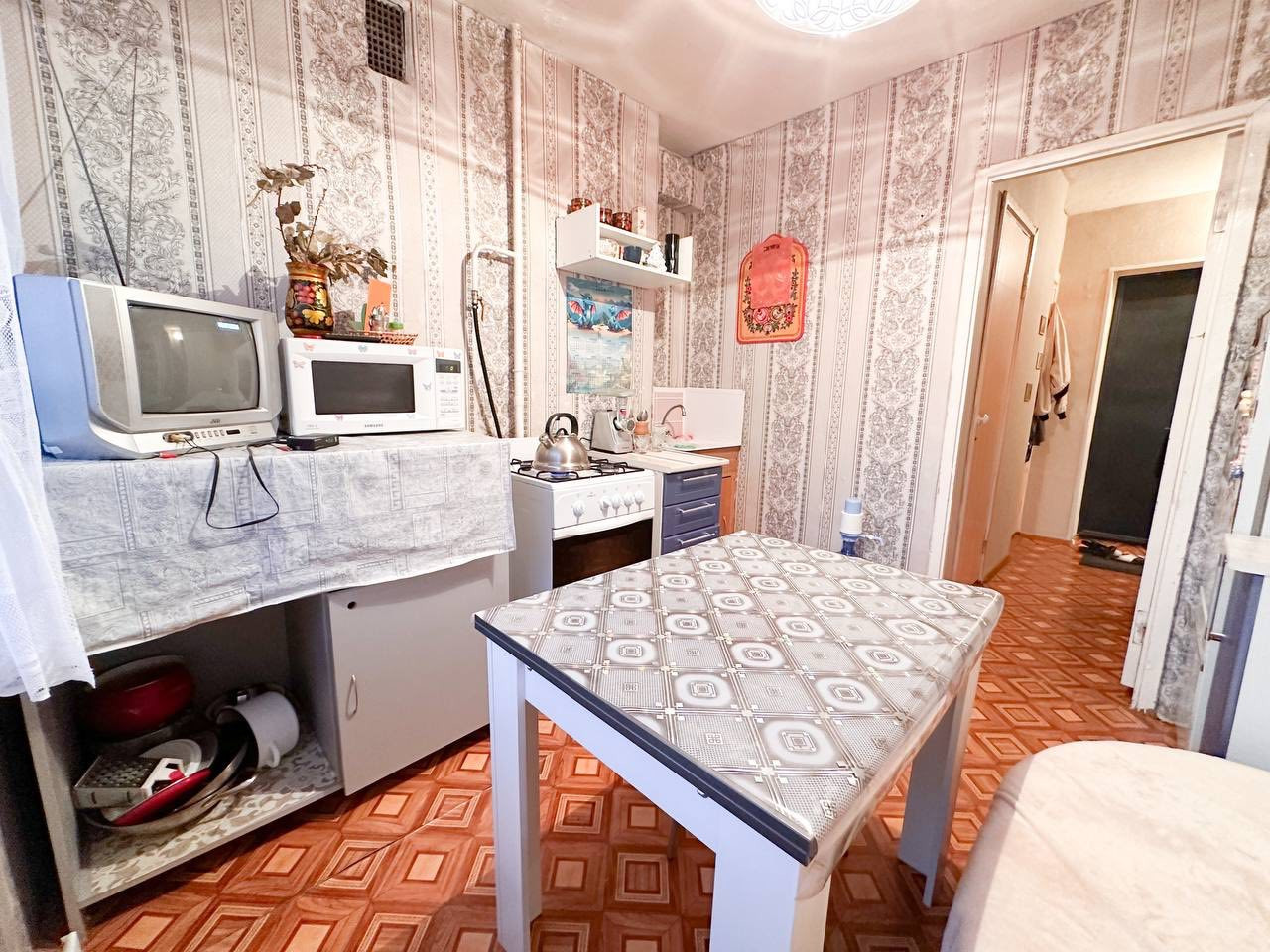 - на полу в зоне кухни и прихожей плитка, в комнате ламинат,