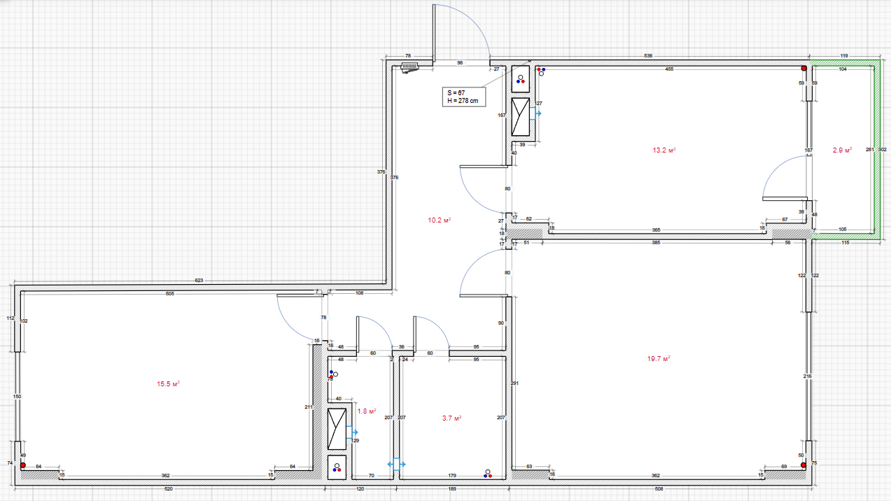Общая площадь - 67 м.кв , жилая - 35 м.кв (комнаты 20 м.кв + 15 м.кв) , кухня с лоджией - 16 м.кв, прихожая - 10 м.кв, санузел раздельный - 5 м.кв.