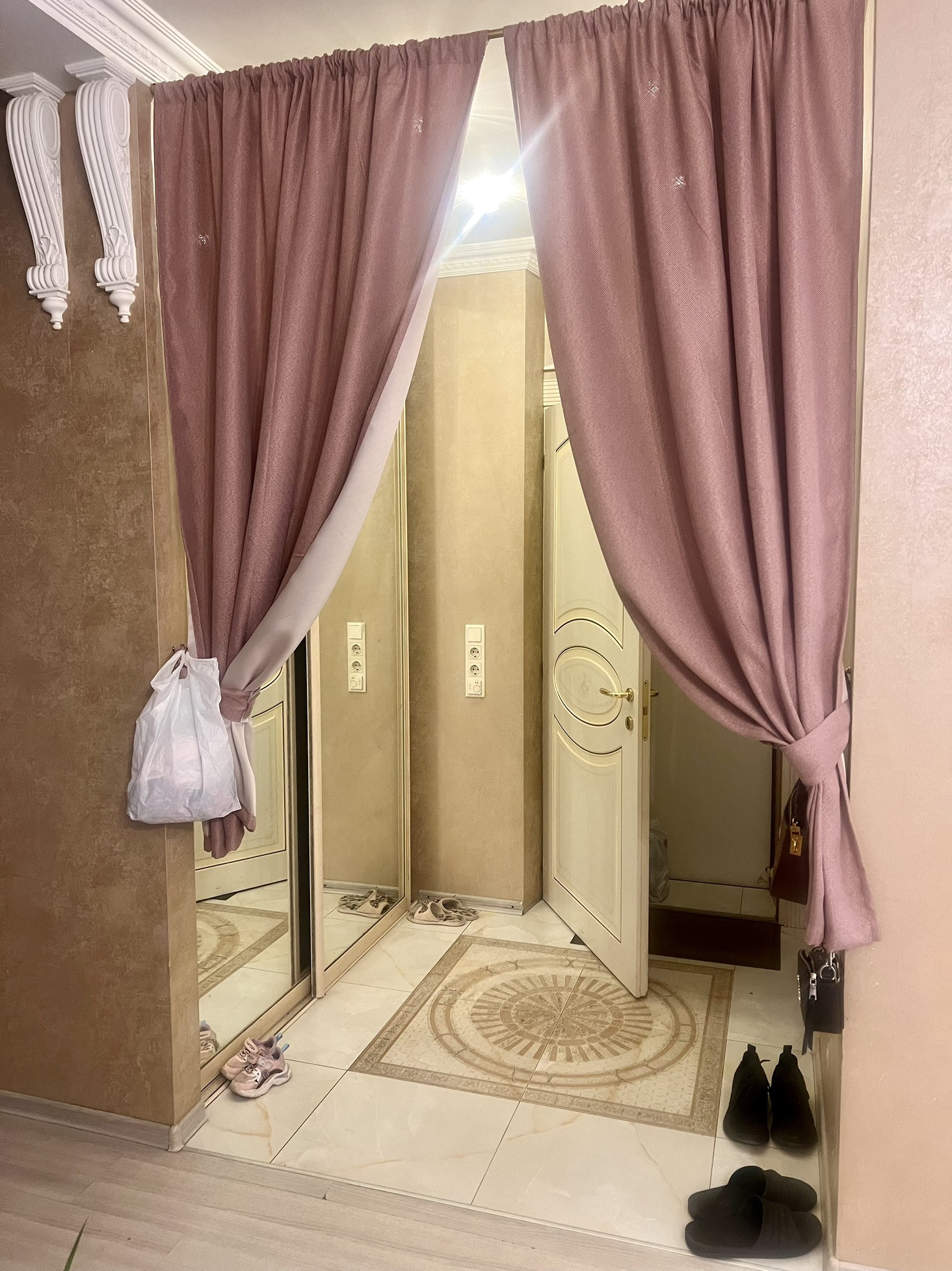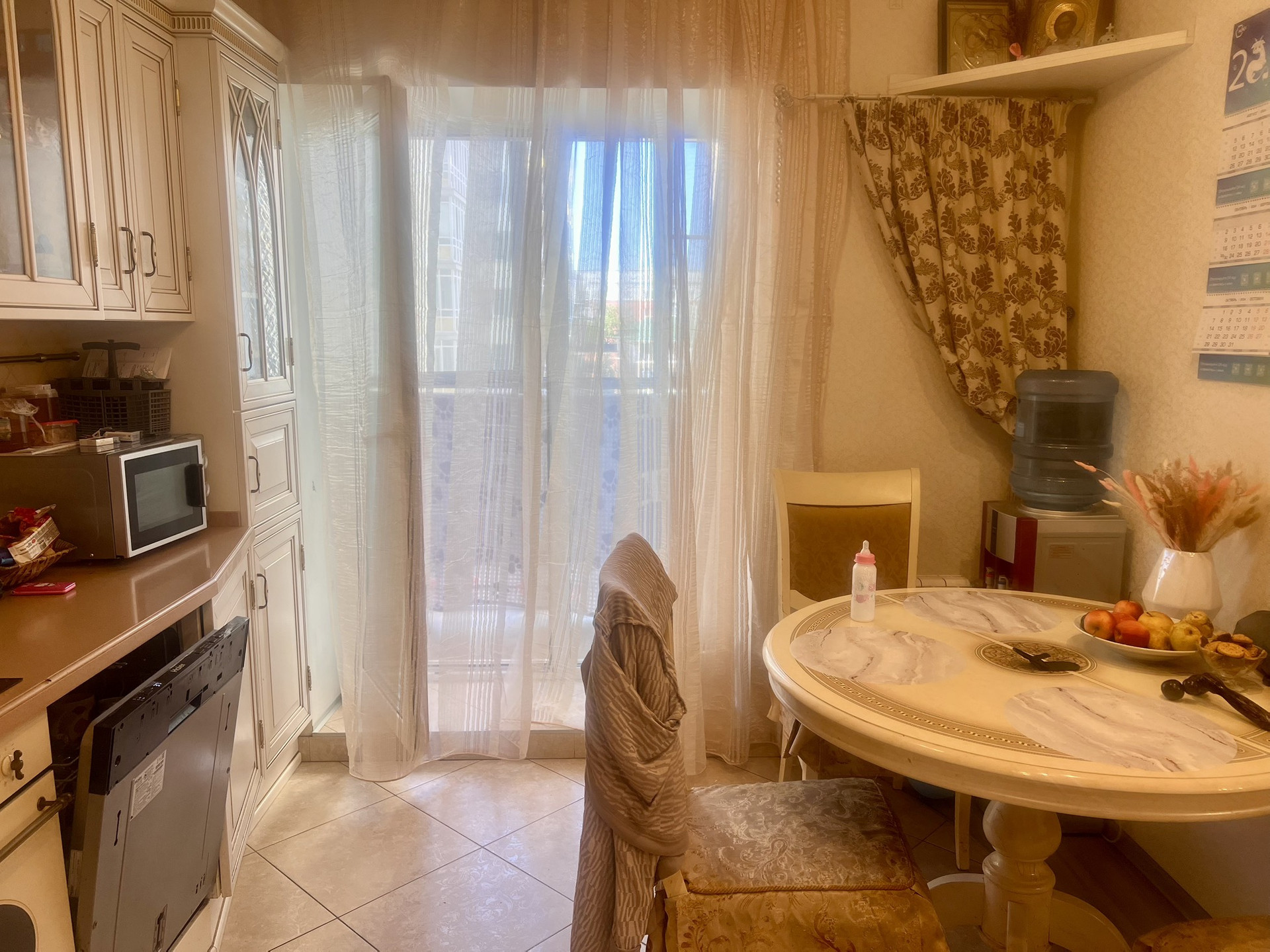 На кухне витражные окна выходят на застекленный балкон. Квартира очень уютная, с шикарным дизайнерским ремонтом, все двери и мебель и кухня  итальянские.