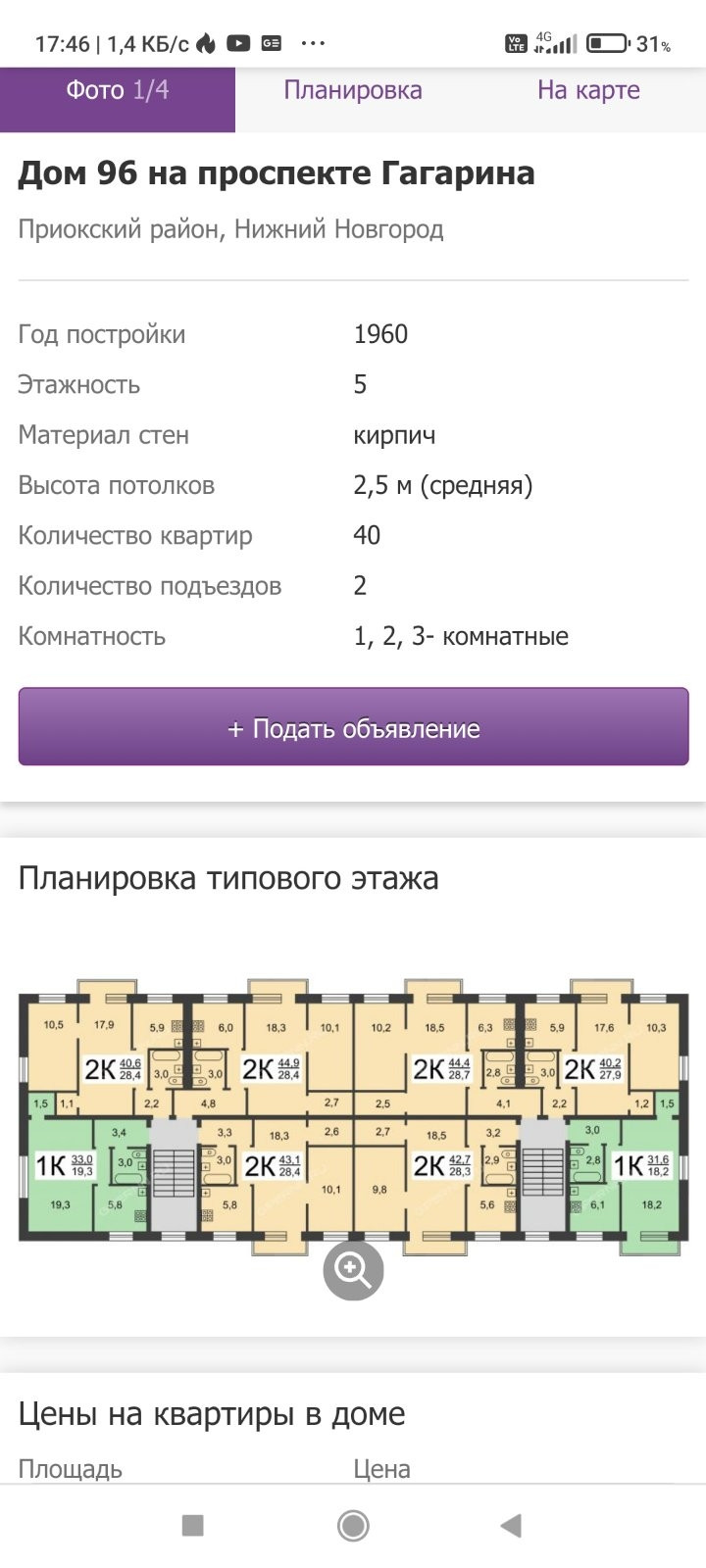 2-комнатная квартира, 44 м2, этаж 5 / 5, на продажу в Нижнем Новгороде, проспект Гагарина, 96