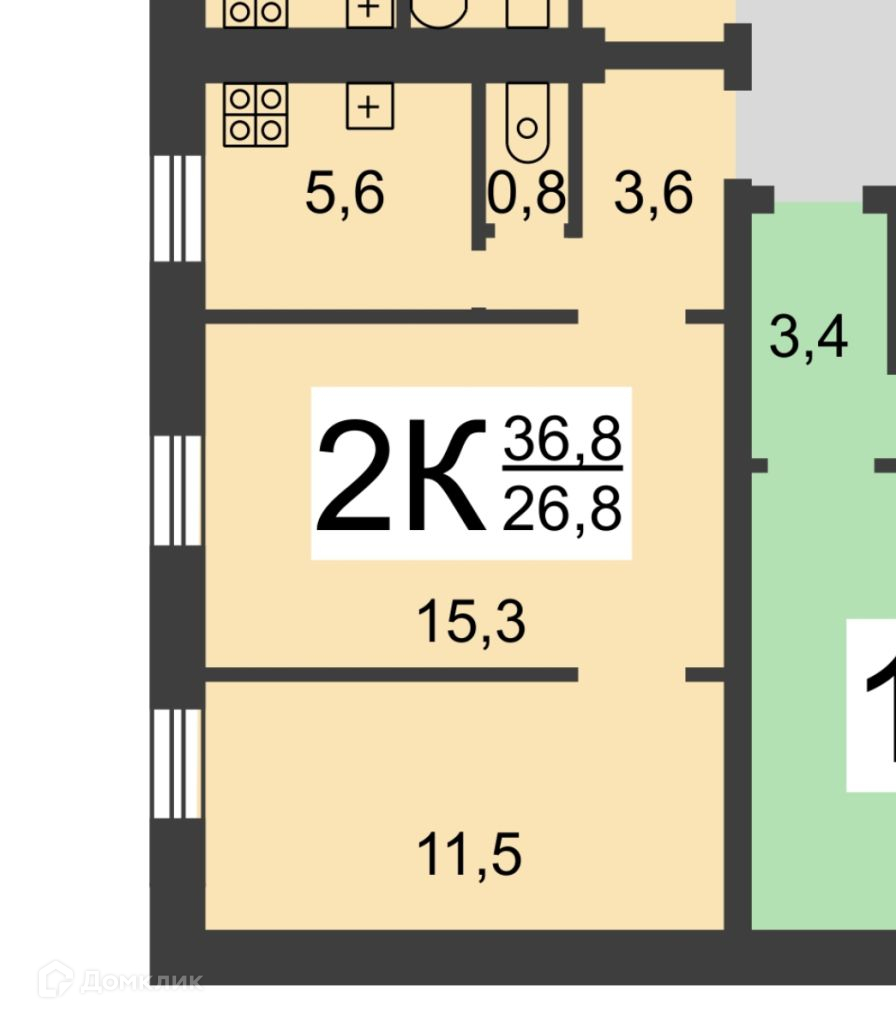 Жилая площадь 26.6 м2