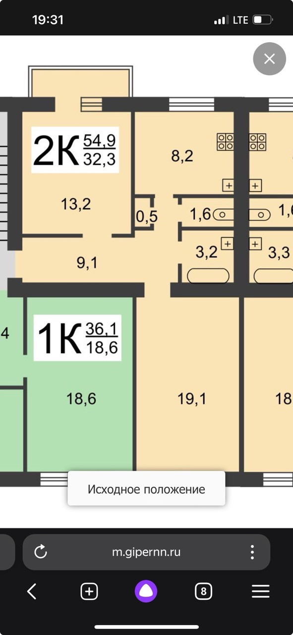 Жилая площадь 32.3 м2