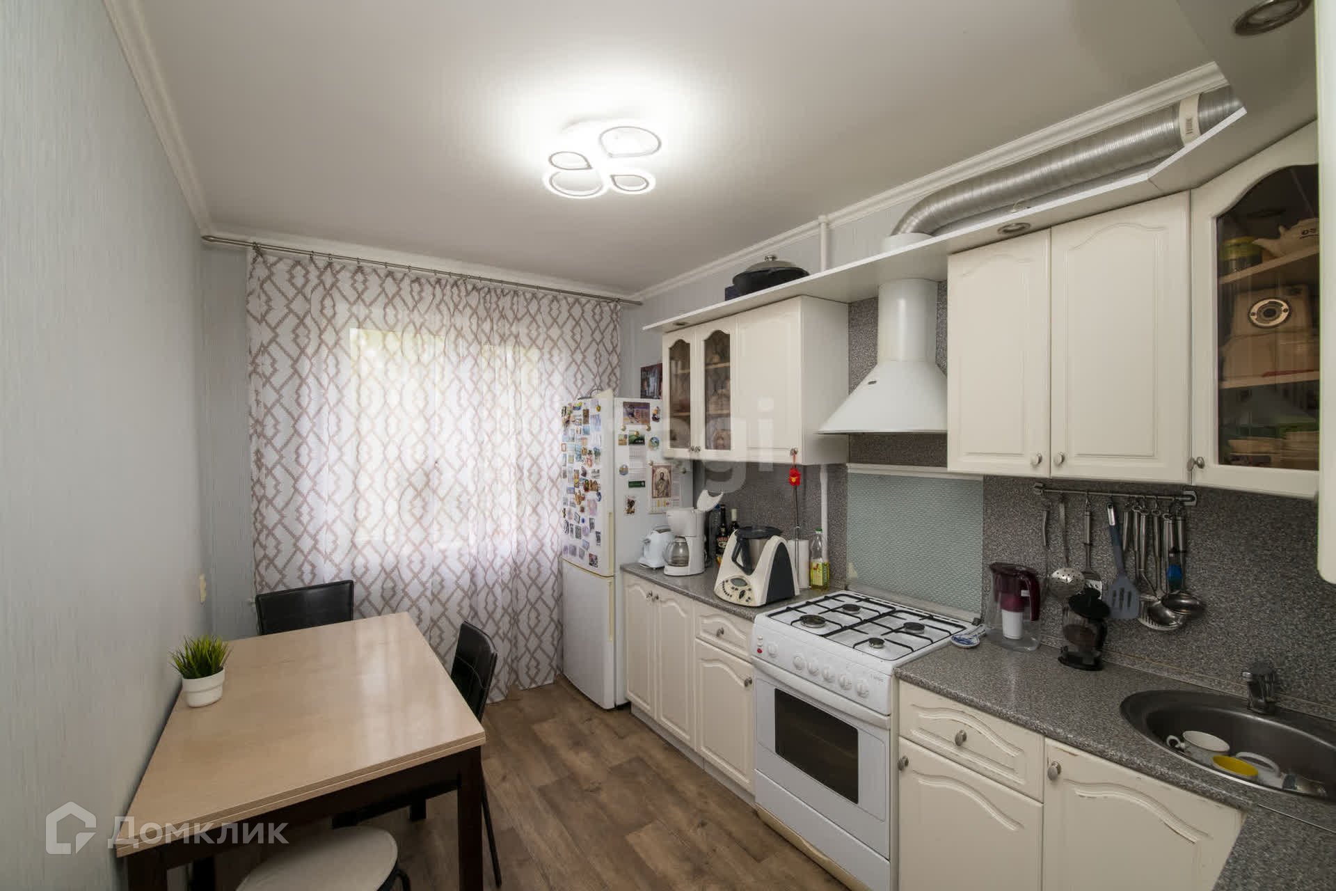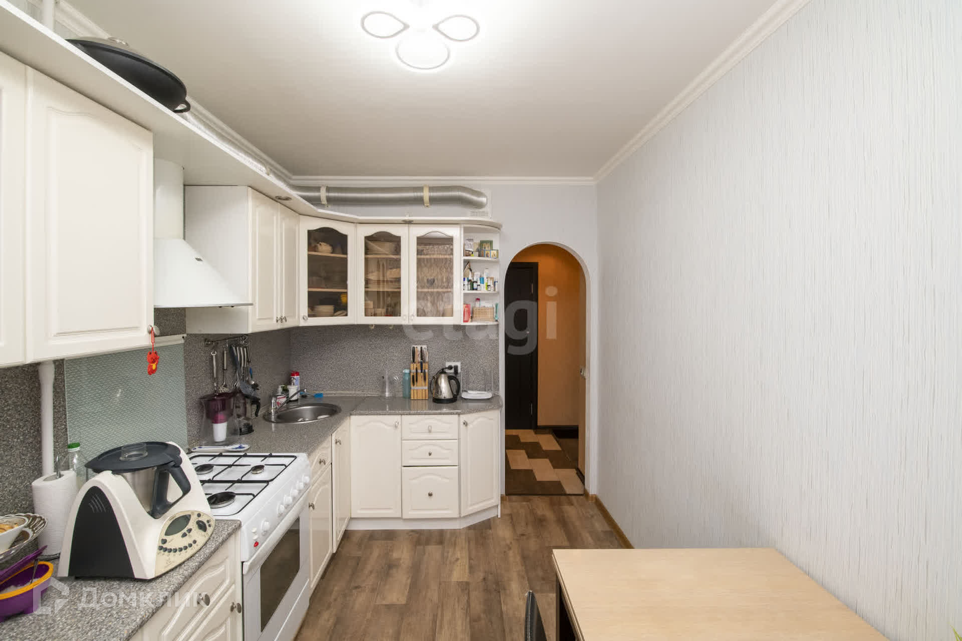 Кухня оборудована современным встроенным гарнитуром и рабочей вытяжкой, а полы на кухне выполнены из качественного линолеума, что делает уборку легкой и быстрой. В остальных комнатах — стильный ламинат, который добавляет уют.