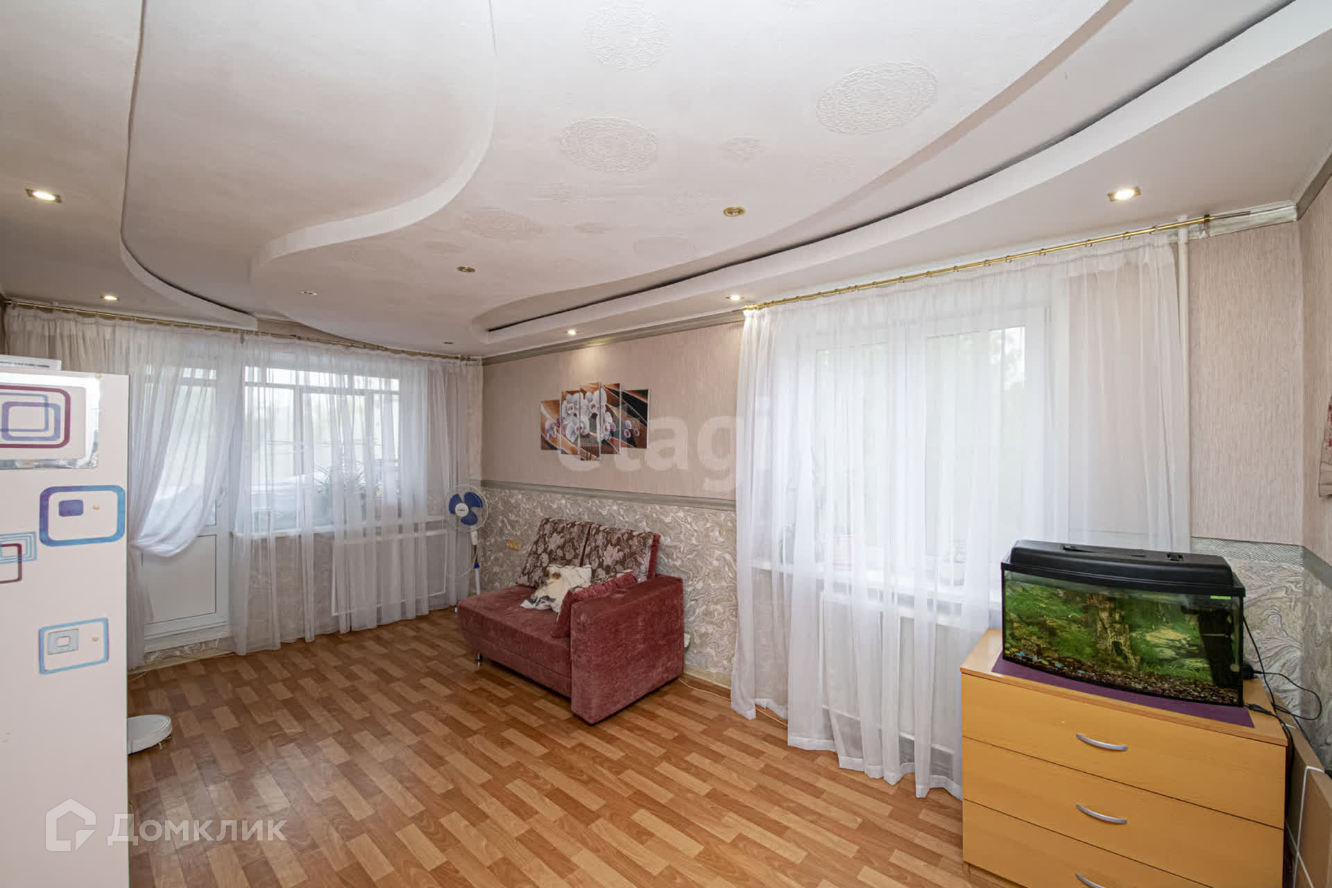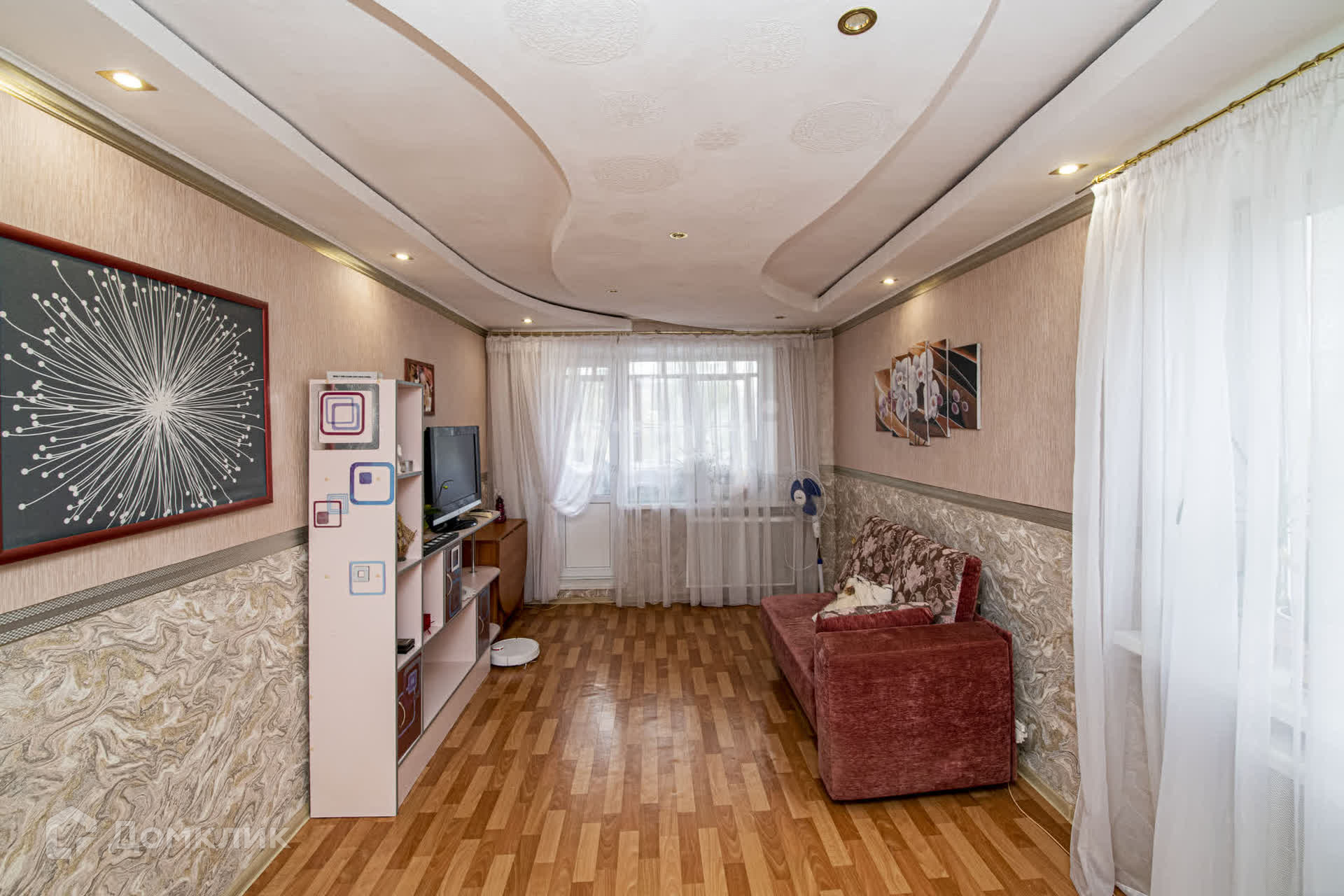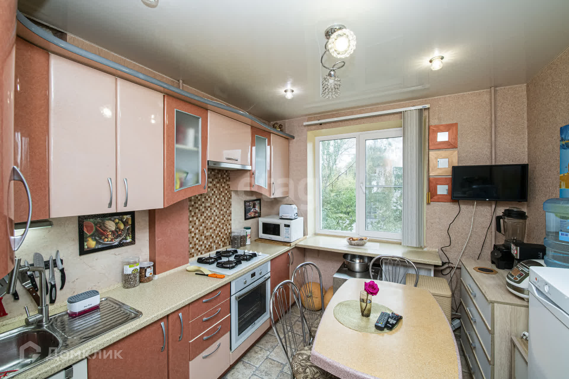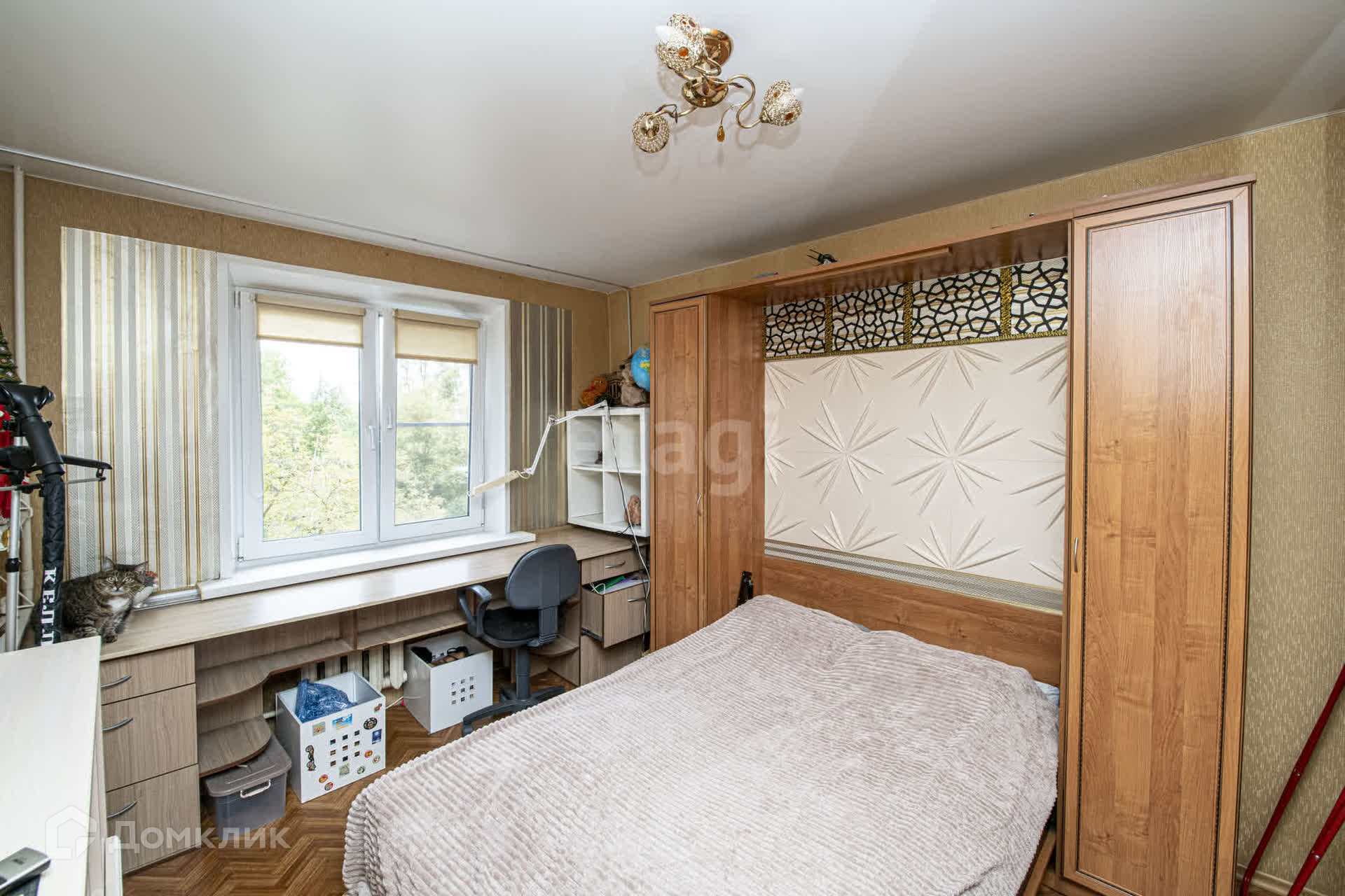 В зале установлены два окна, что наполняет пространство светом и создает атмосферу уюта. Квартира продается с практически всей мебелью: кухонный гарнитур и кровати-трансформеры в спальнях помогут вам легко организовать рабочее место или учебный уголок.
