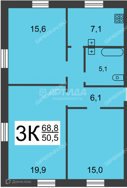 Жилая площадь 50.5 м2