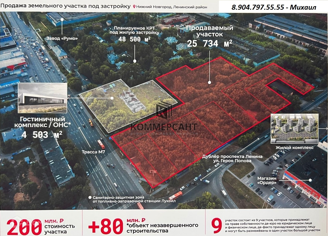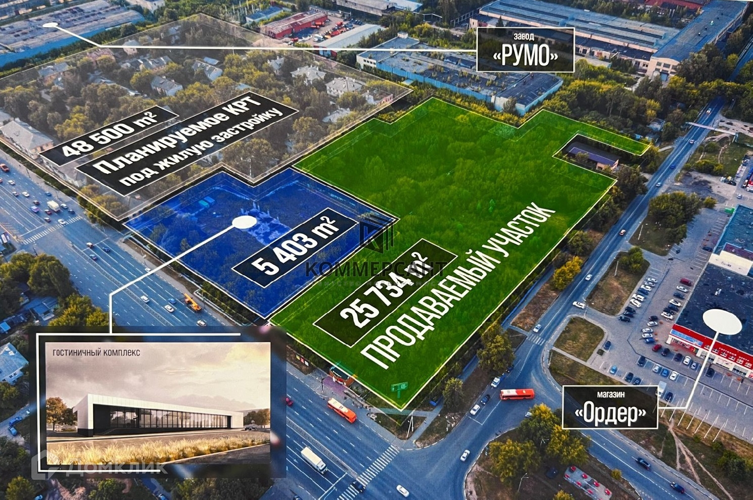 Участок расположен в зоне П*ТО3 – под общественную застройку, коммунально-обслуживающие функции, административно-производственные объекты, мелкооптовая и оптовая торговля, рынки, и т.д.. По утвержденному проекту здесь запланирован торгово-выставочный комплекс и гипермаркет. Все точки подключения к инженерным сетям – в непосредственной близости. Возможность изменения террит. зонирования и вида разрешенного использования и строительство трех многоквартирных домов площадью до 75 000 м2.