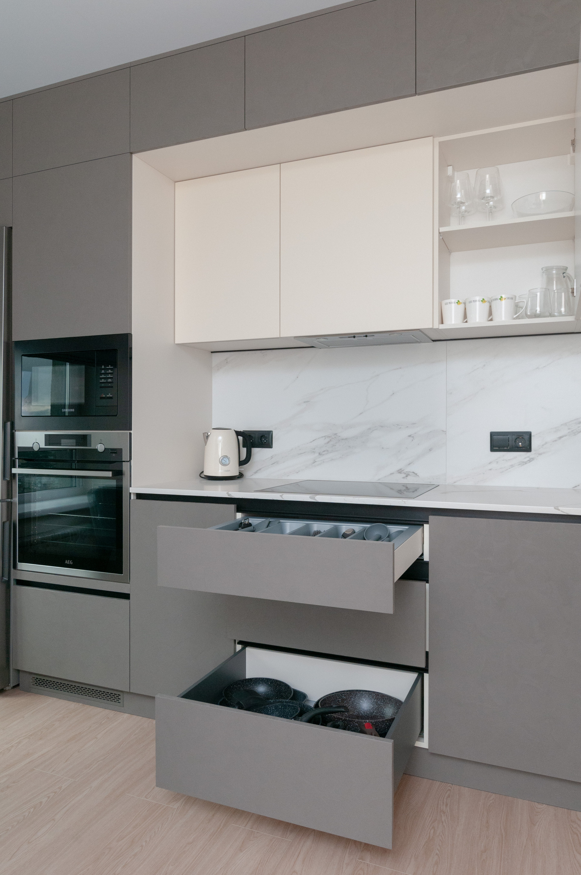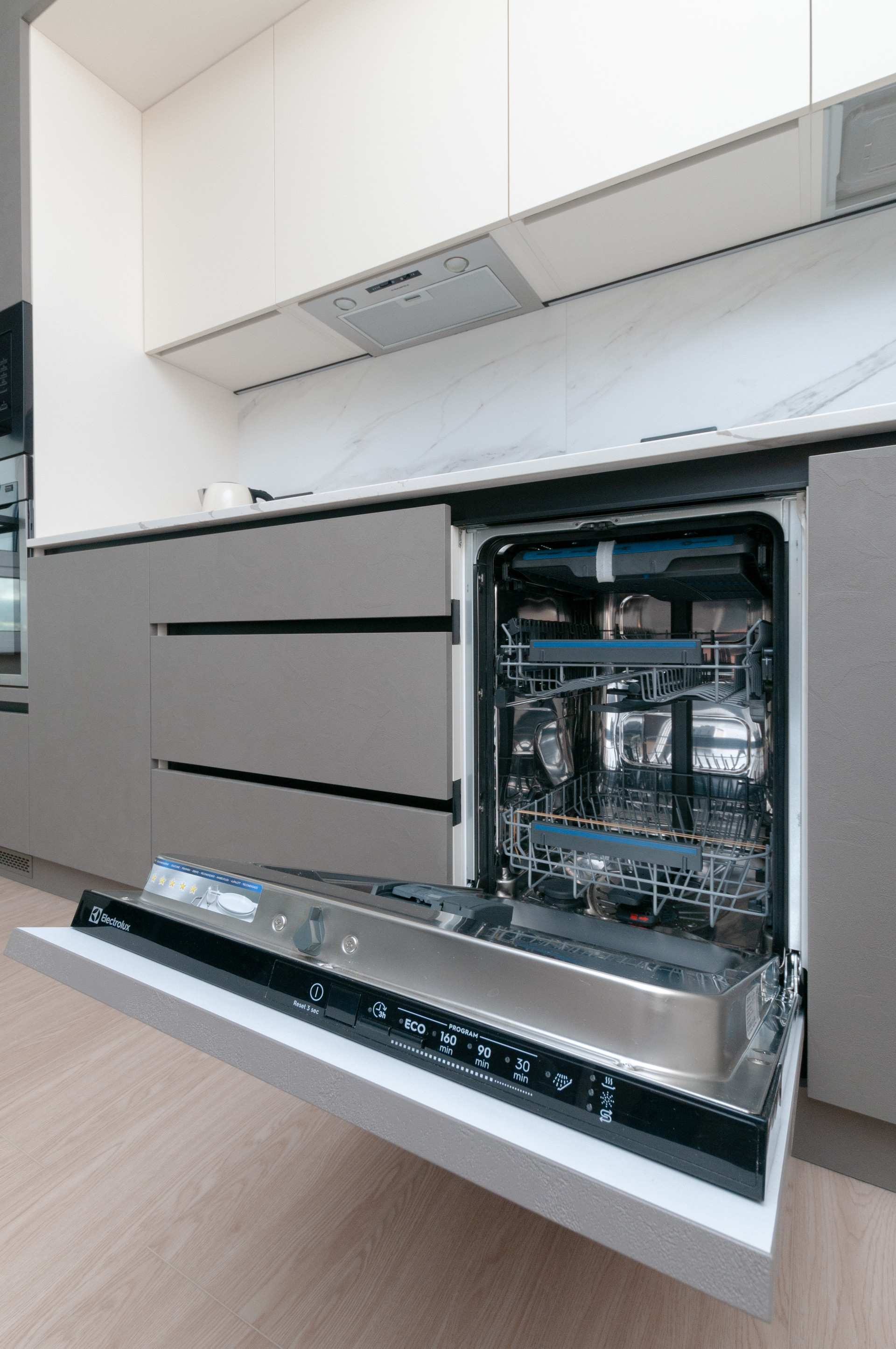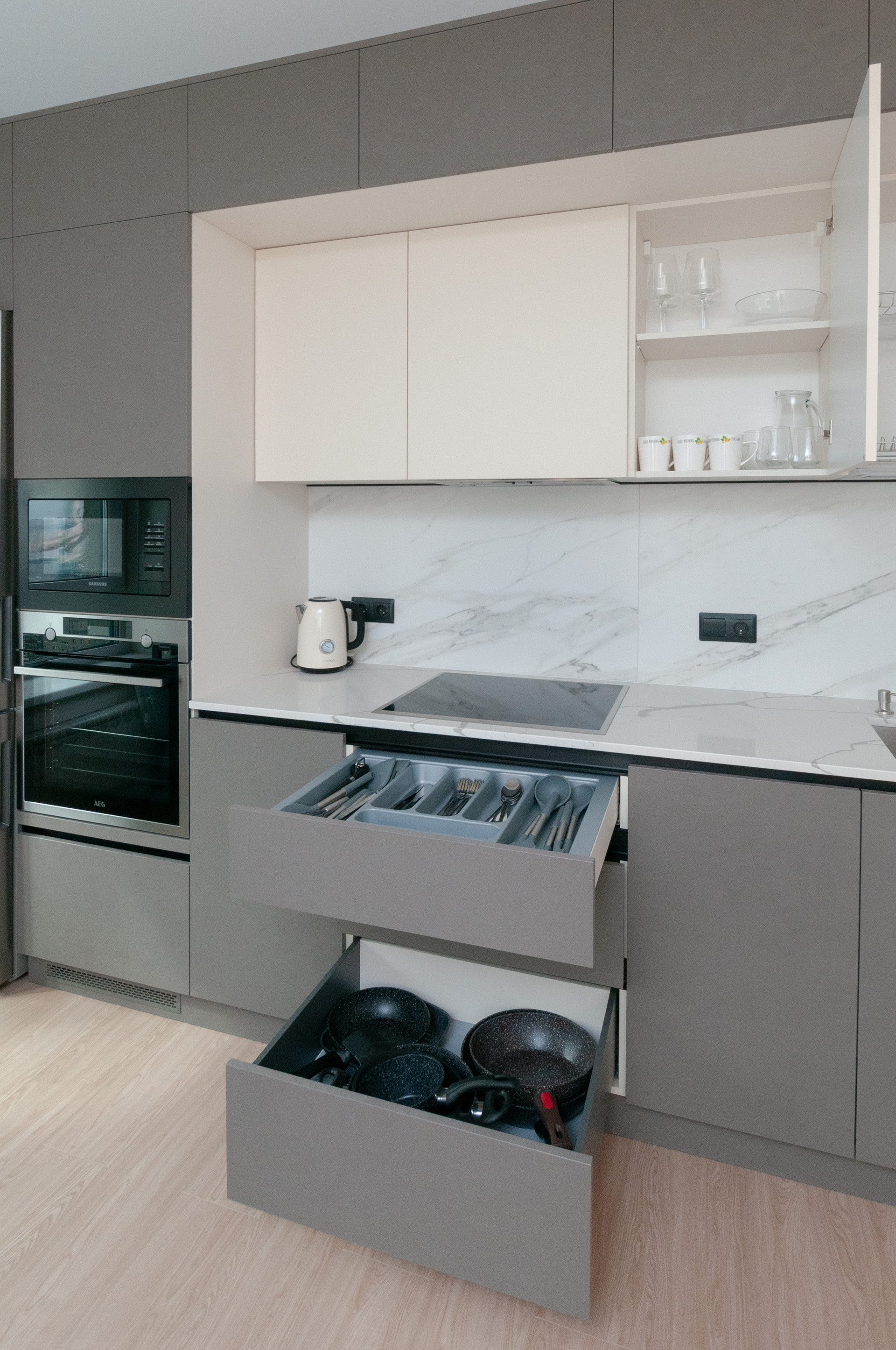 - кухня премиум-класса (духовой шкаф, варочная панель, микроволновая печь, посудомоечная машина, электрический чайник, холодильник).