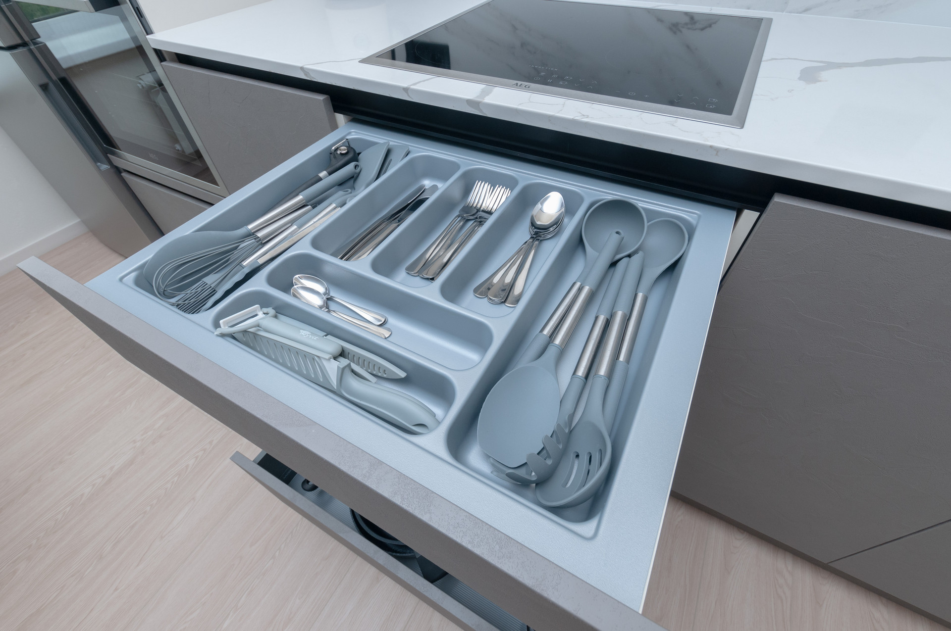 Полное оснащение всем необходимым для комфортной жизни - Новый полный комплект посуды (бокалы, тарелки, столовые приборы, стаканы, фужеры), приборы и предметы для приготовления пищи (разные ложки, кастрюли, сковородки).