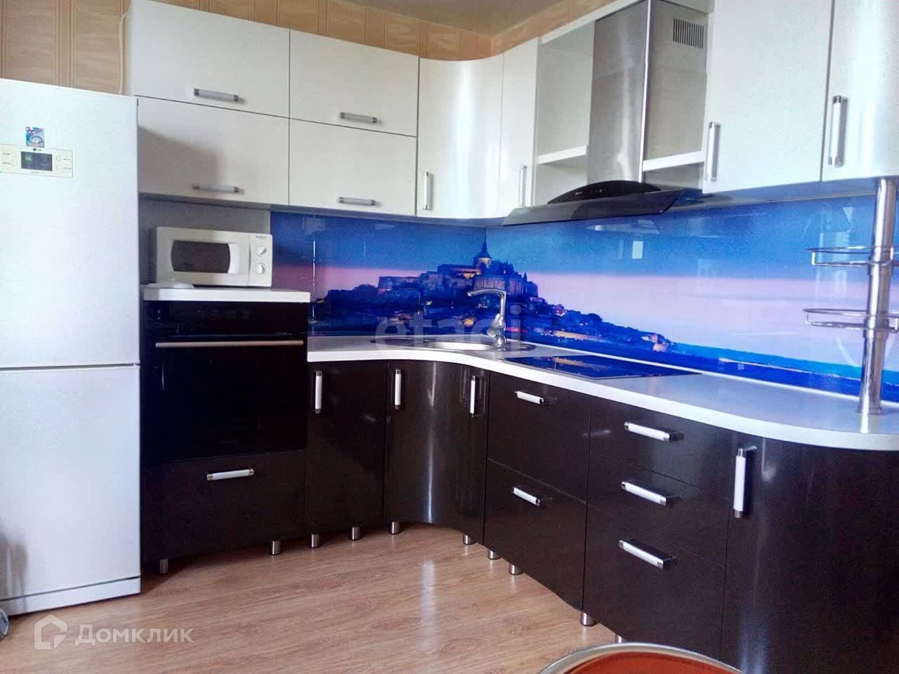 В квартире есть вся нужная техника и мебель для комфортного проживания. Кухня укомплектована полностью: два обеденных стола на три и четыре персоны, кухонный гарнитур, индукционная варочная поверхность, микроволновая печь, большой холодильник, духовой шкаф.