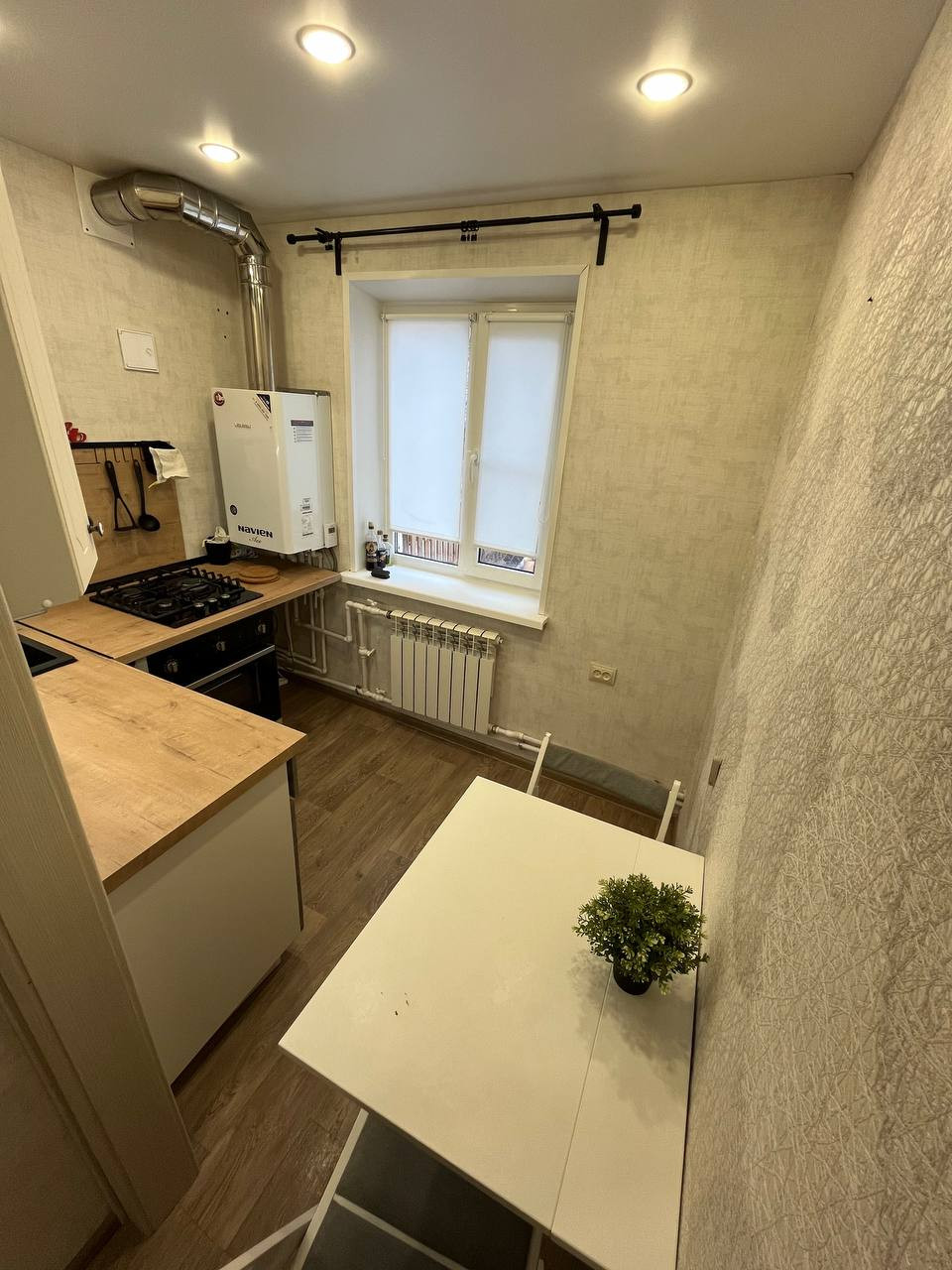 Комнаты смежные, санузел совмещен, двухконтурный газовый котел.