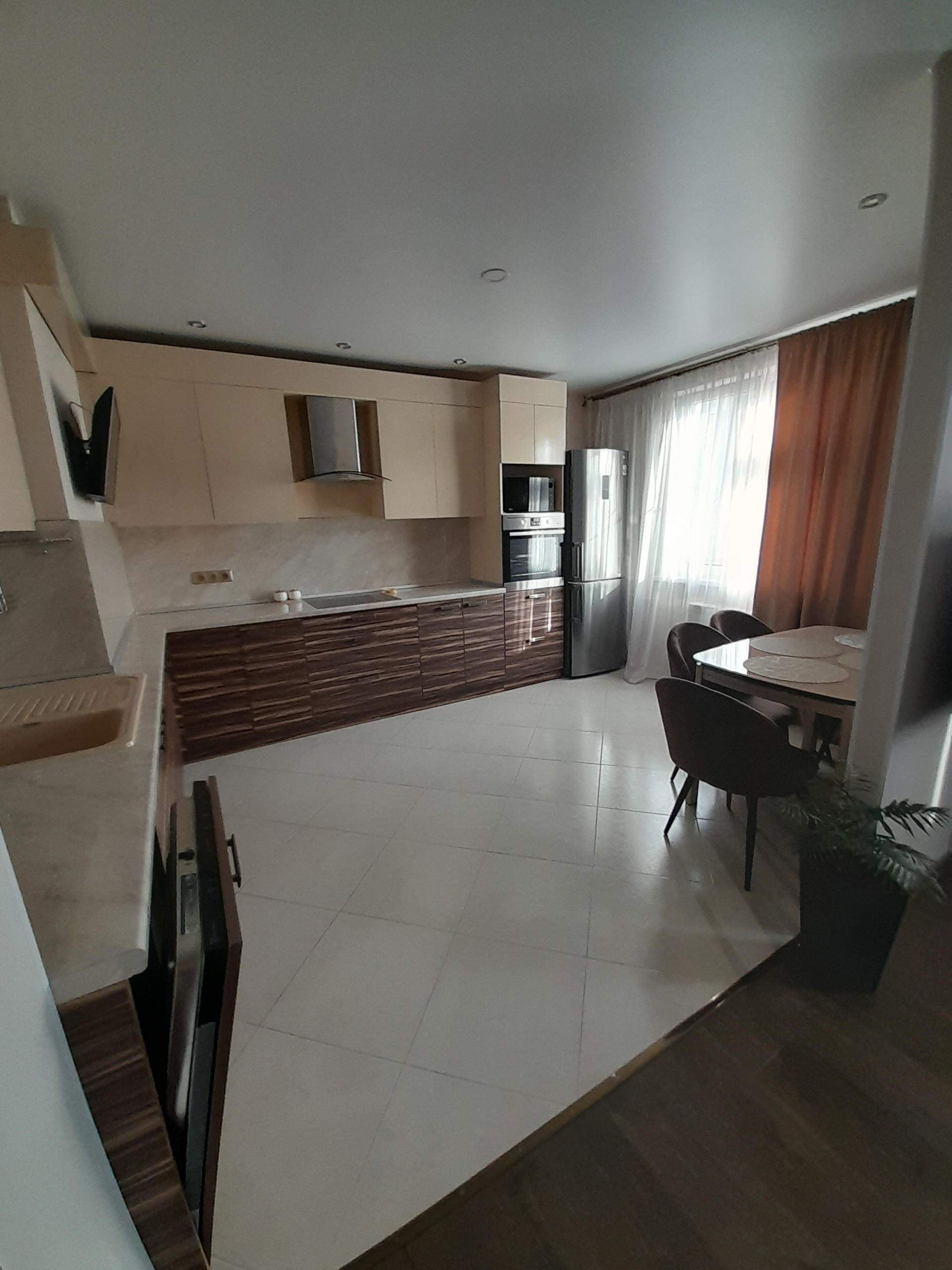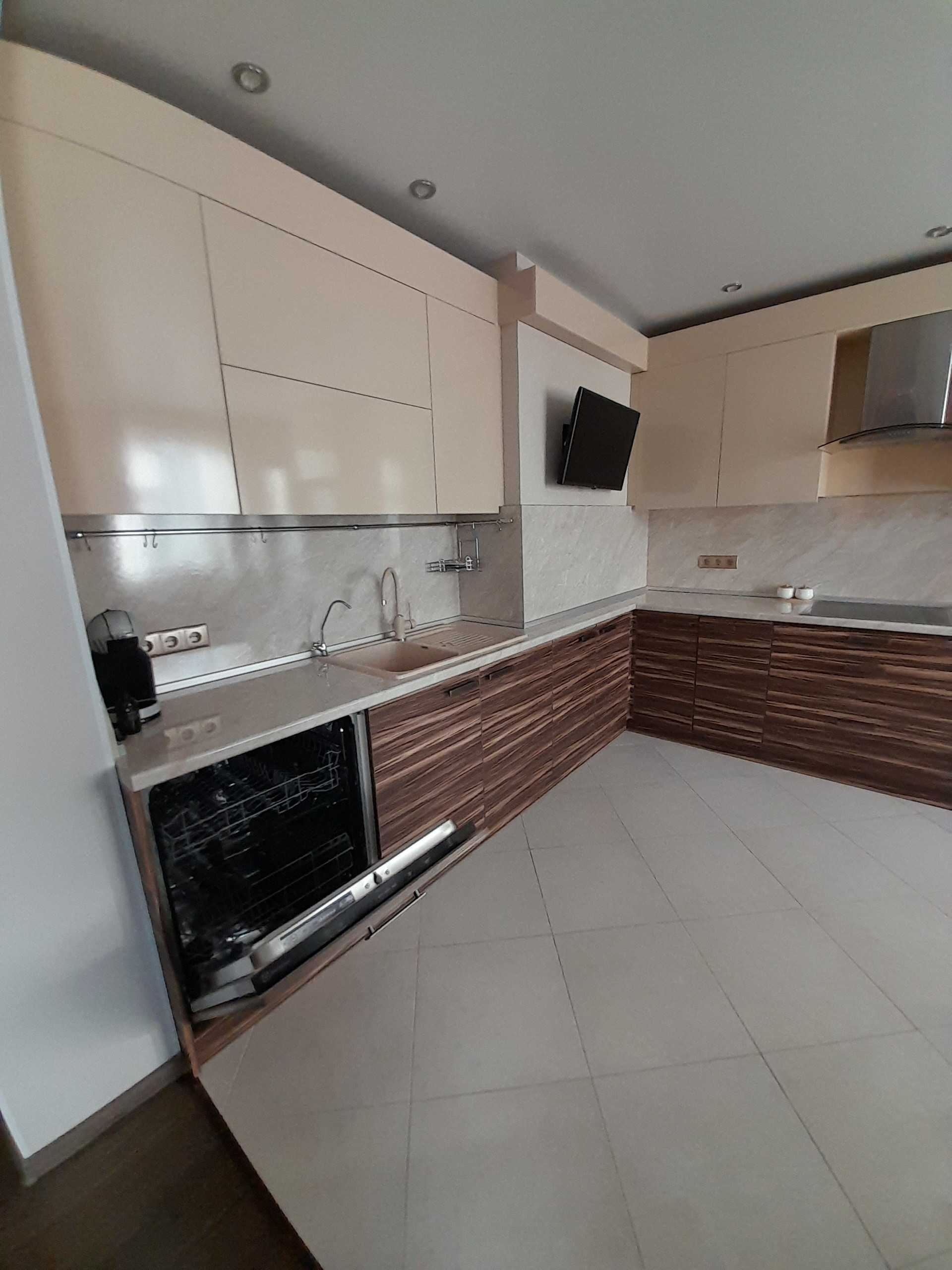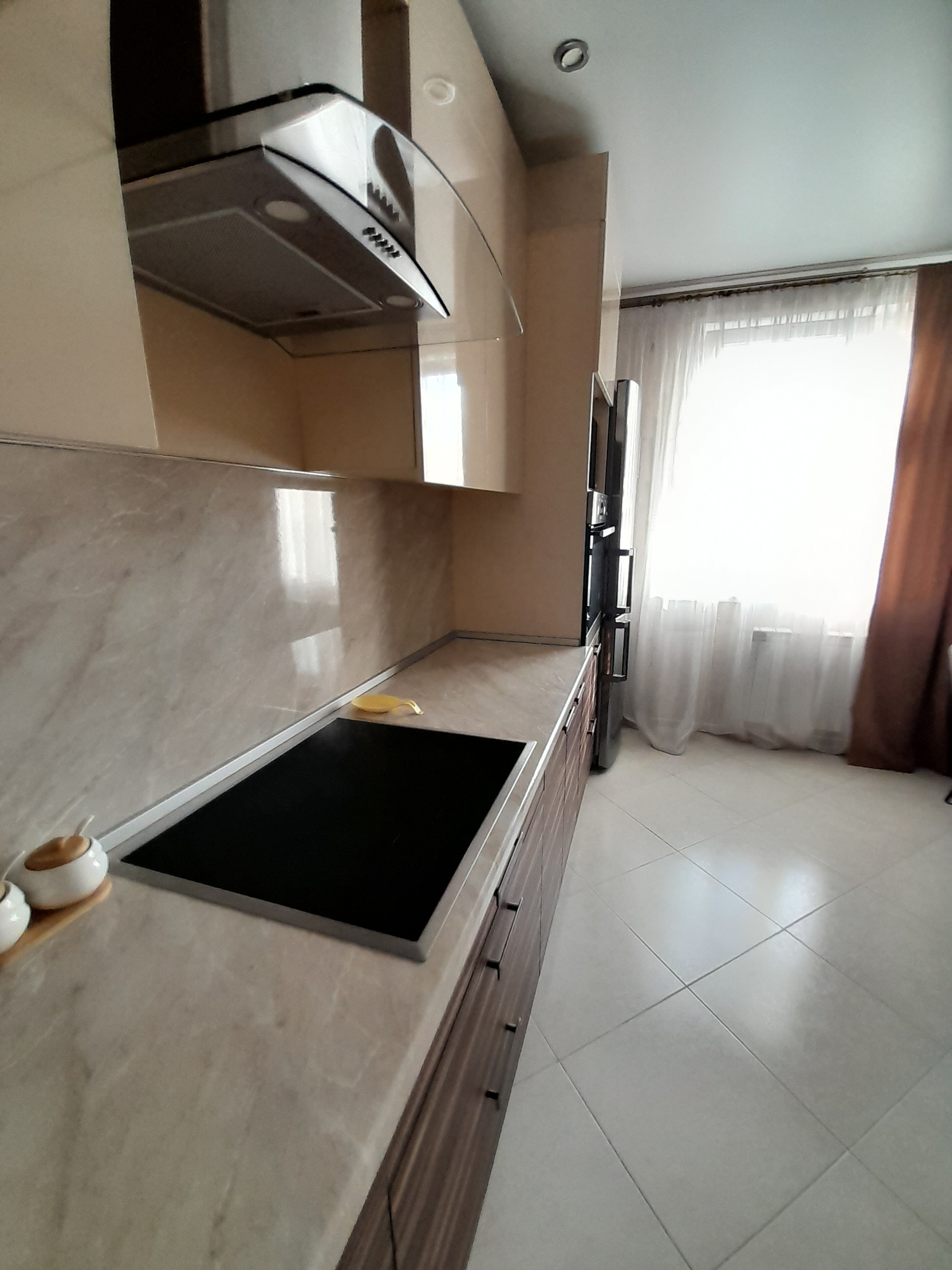 Кухня оборудована всем необходимым, есть варочная панель, духовой шкаф,, посудомоечная машина, телевизор, холодильник