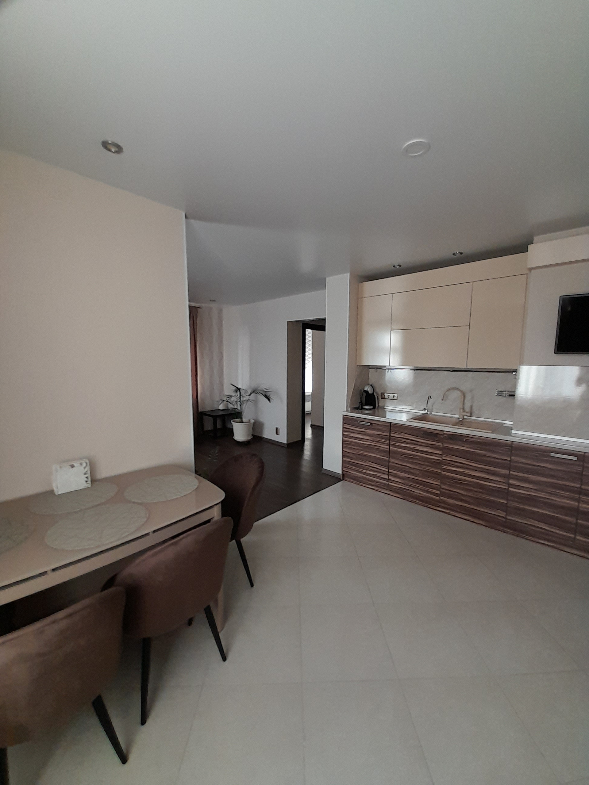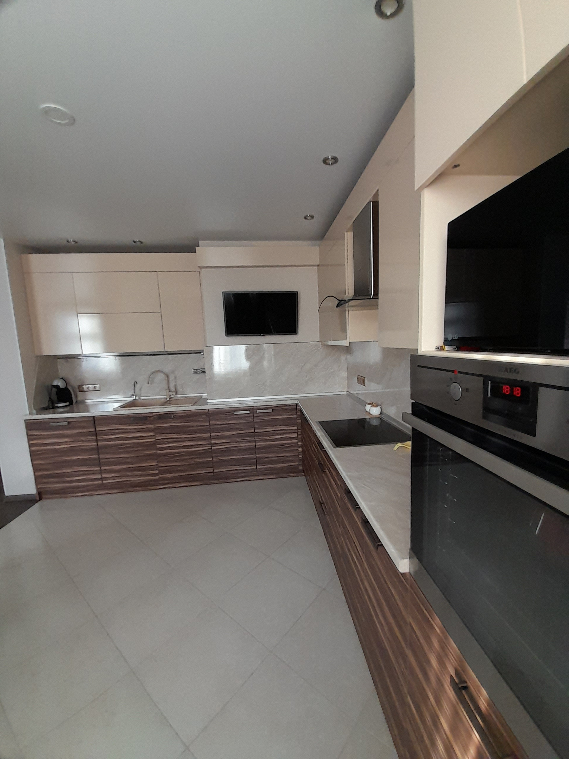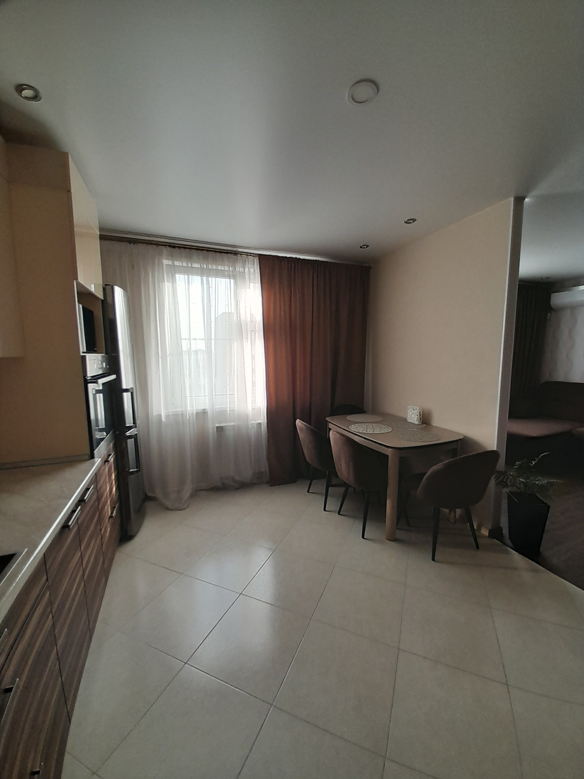 Кухня оборудована всем необходимым, есть варочная панель, духовой шкаф,, посудомоечная машина, телевизор, холодильник