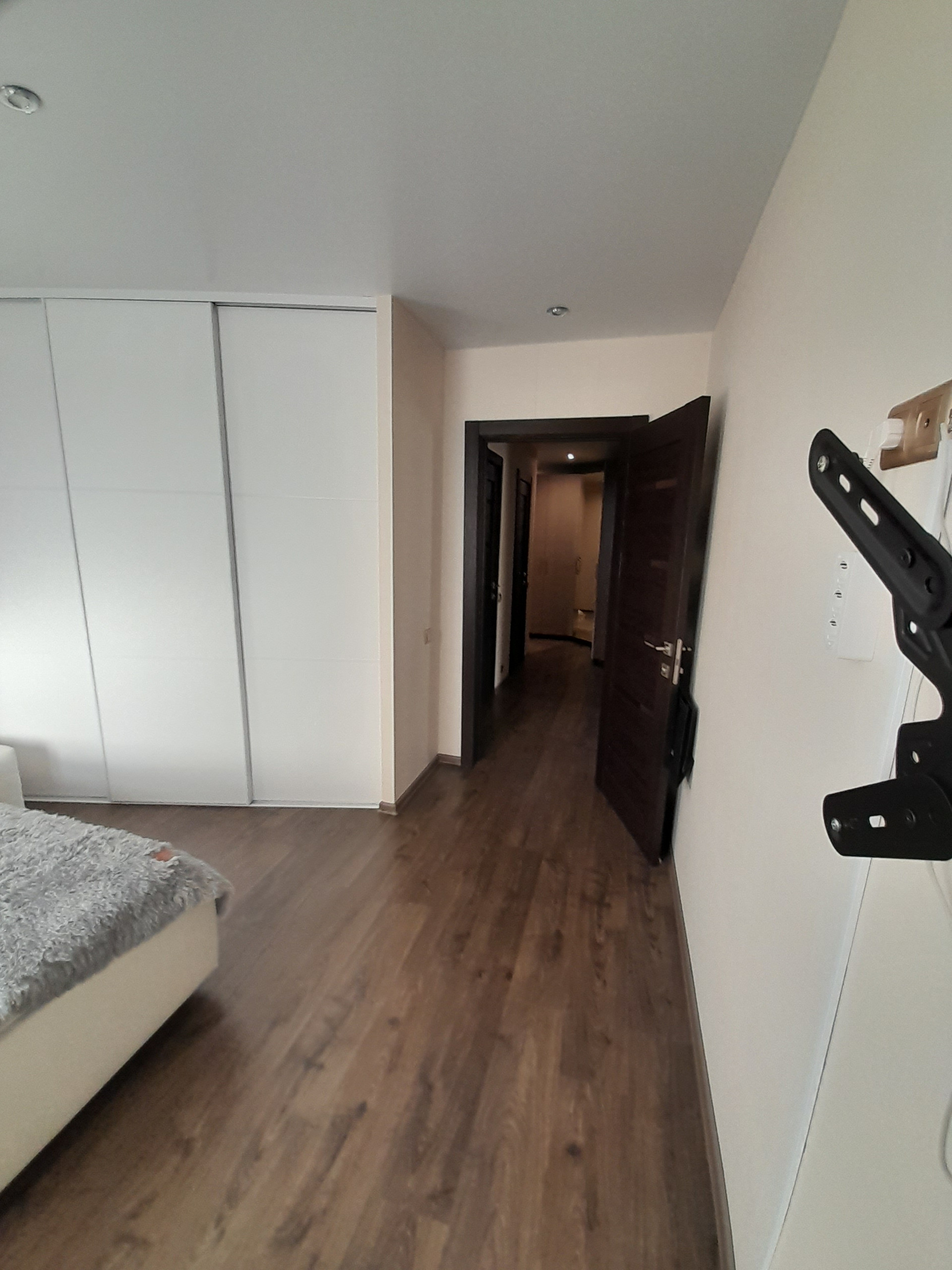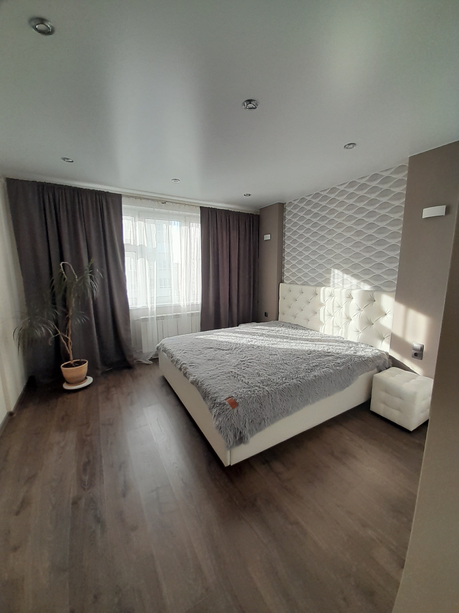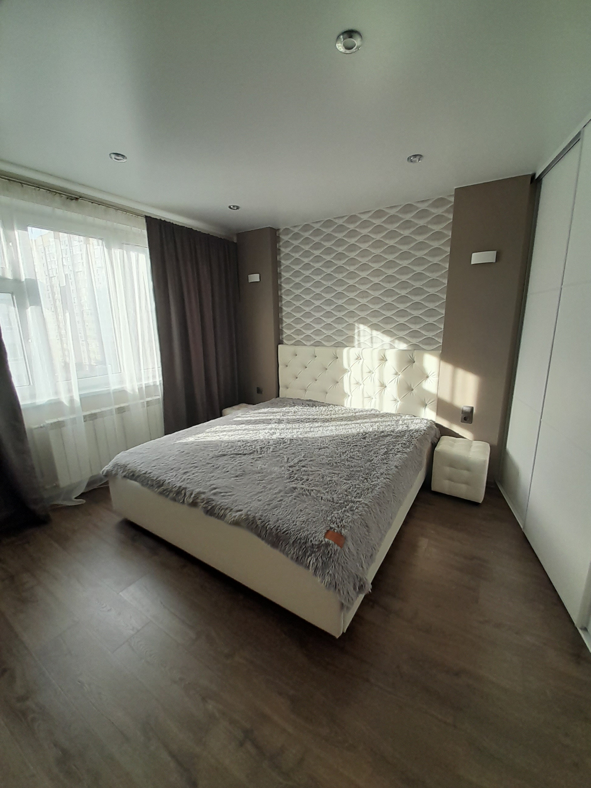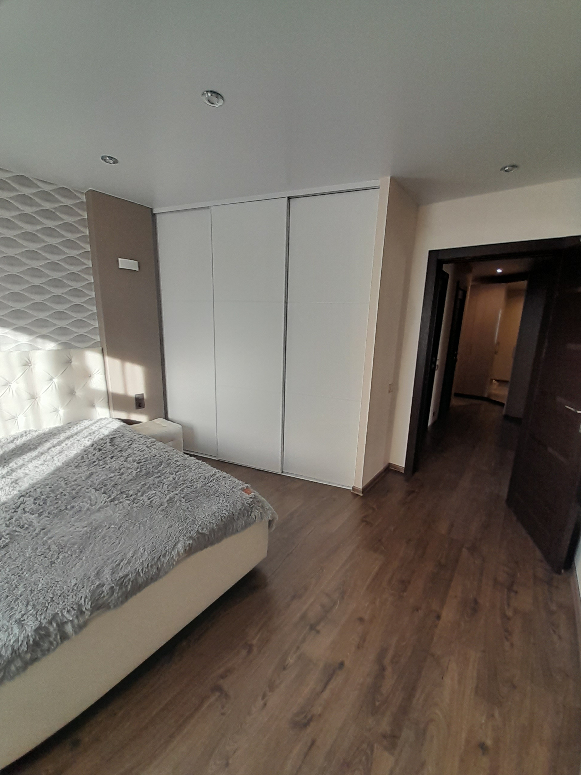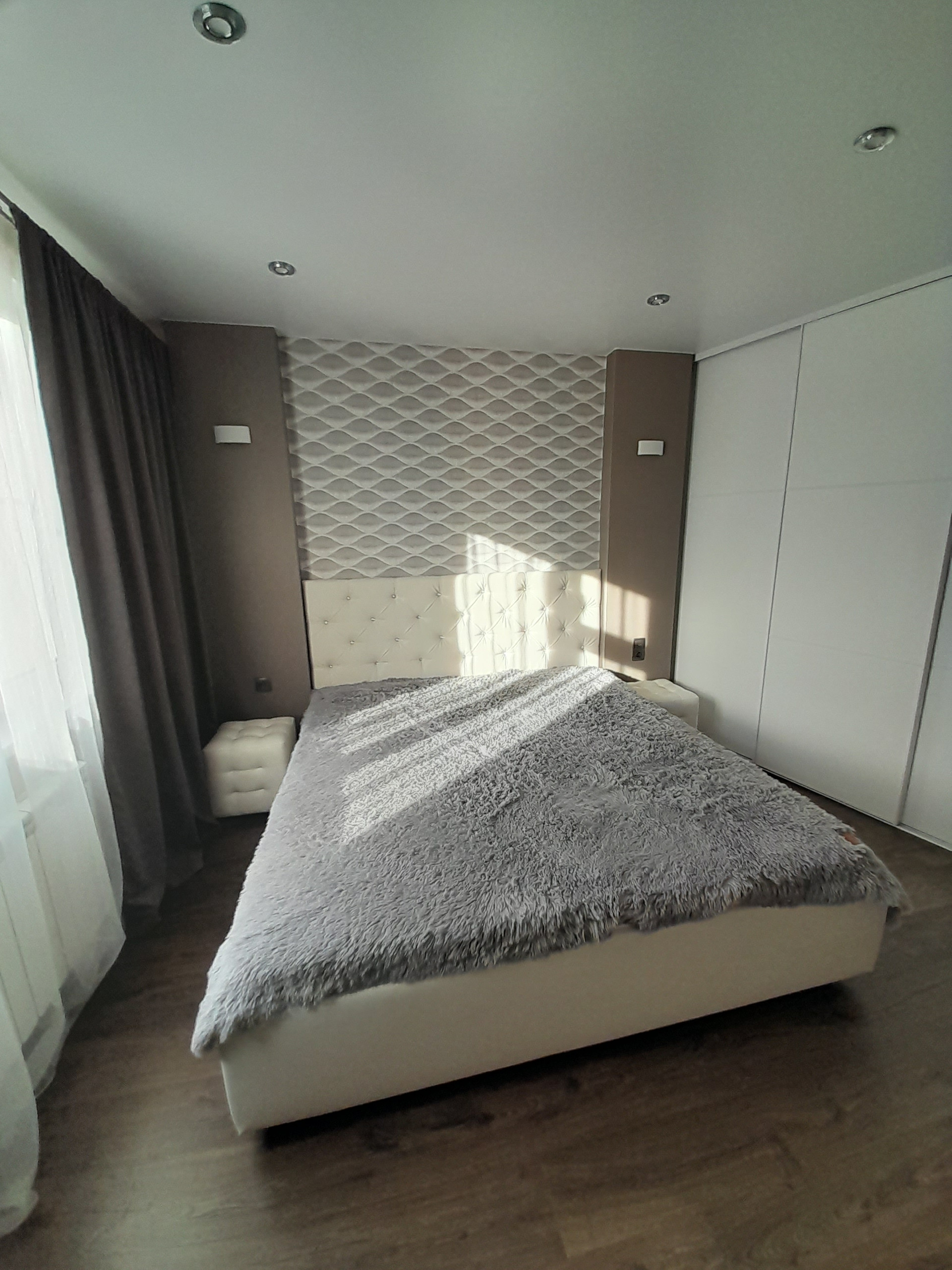 Спальня оборудована спальным гарнитуром с двухспальной кроватью, тумбочками и вместительными шкафами для хранения вещей.